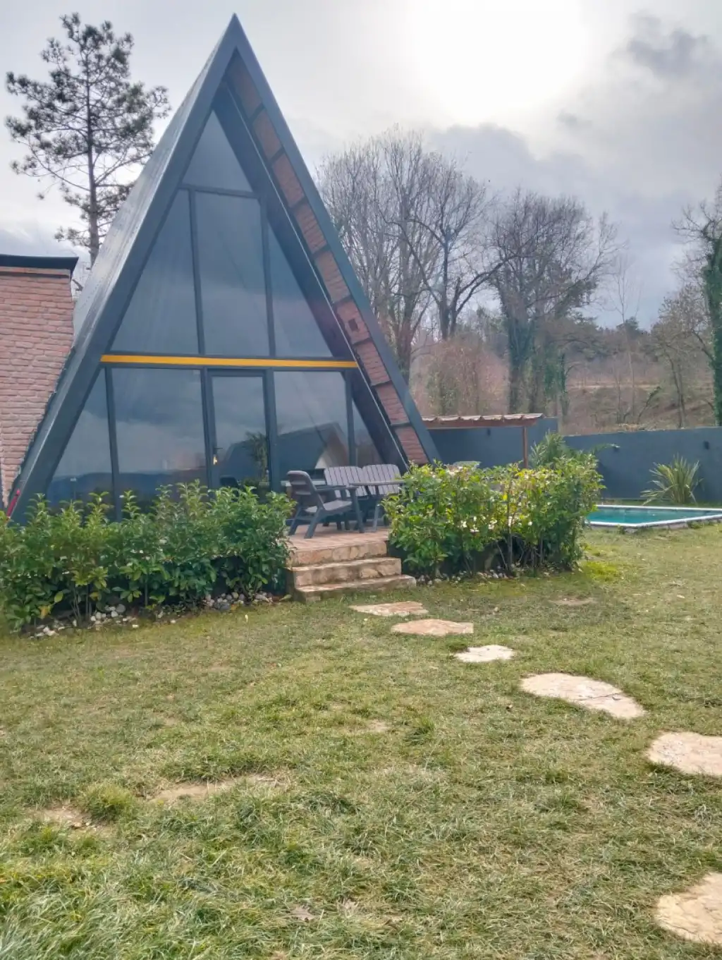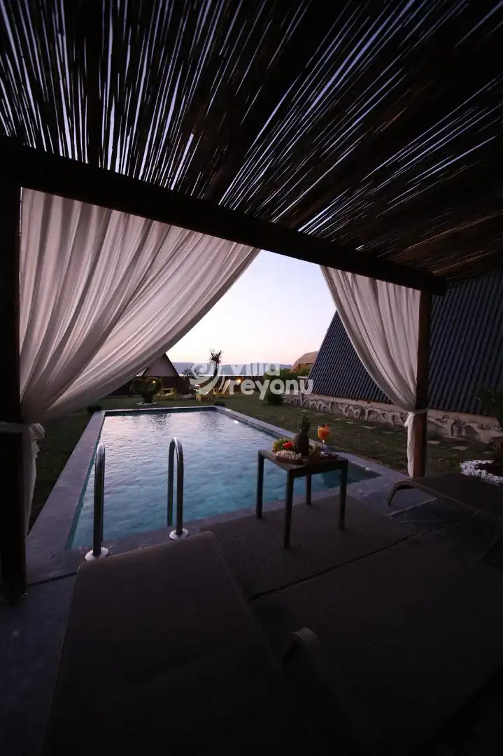 18 m² büyüklüğünde korunaklı bir havuzu bulunan bungalov, geniş bir bahçeye sahiptir. Bahçede oturma takımı, barbekü ve yemek masası yer alır, bu da dış mekanda keyifli vakit geçirme olanağı sunar.