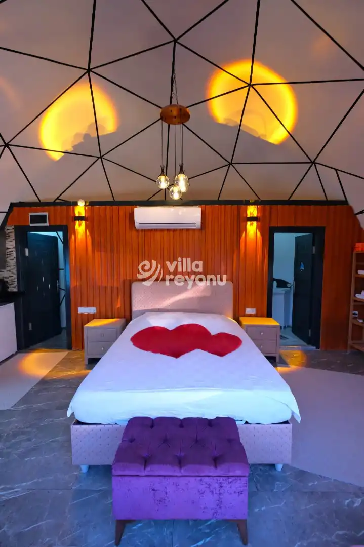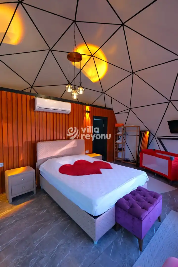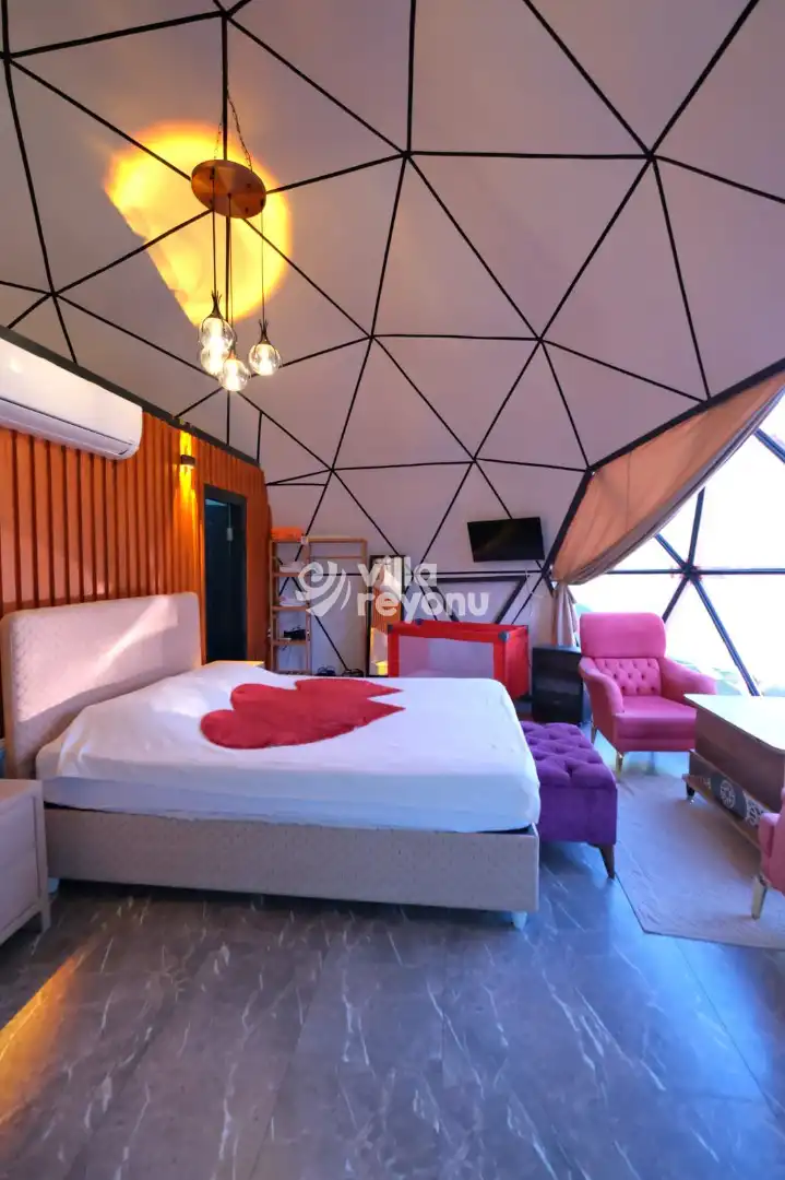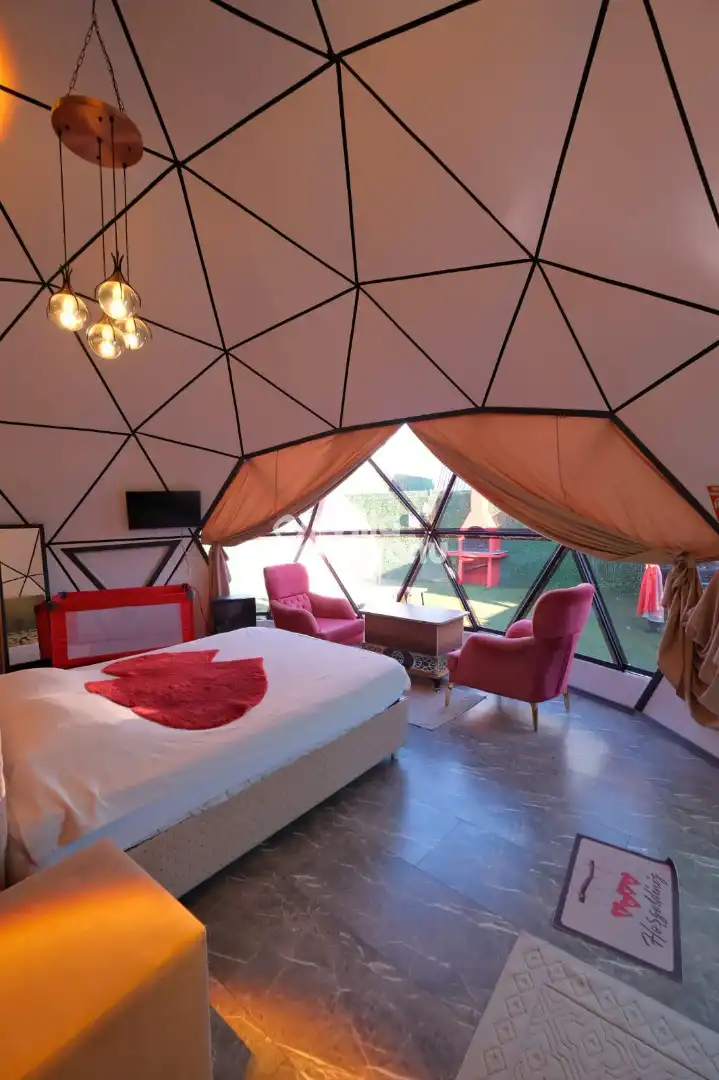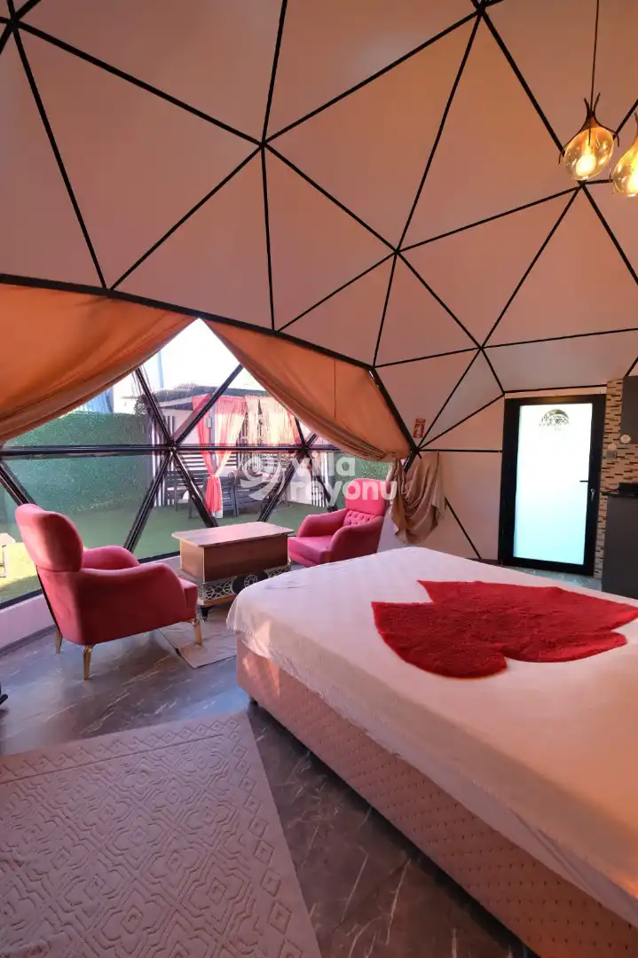 Türkiye'de yeni yeni popülerleşmeye başlayan dome glamping tasarımlı evlerimiz, muhteşem konsepti ile dikkat çekmektedir. Dome Kırmızılı, Sapanca mevkisinde yer almaktadır. 2 adet yatak odasına ve 4 kişilik konaklama kapasitesine sahiptir. Modern ve oldukça farklı bir dizayna sahip olan evimizde sizler için tüm detaylar düşünülmüştür. Dome Kırmızılı, doğa manzarası ile siz değerli misafirlerimize oldukça keyifli bir tatil fırsatı sunmaktadır.