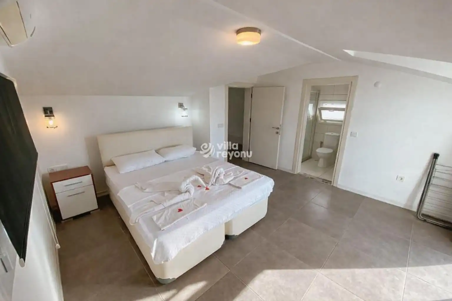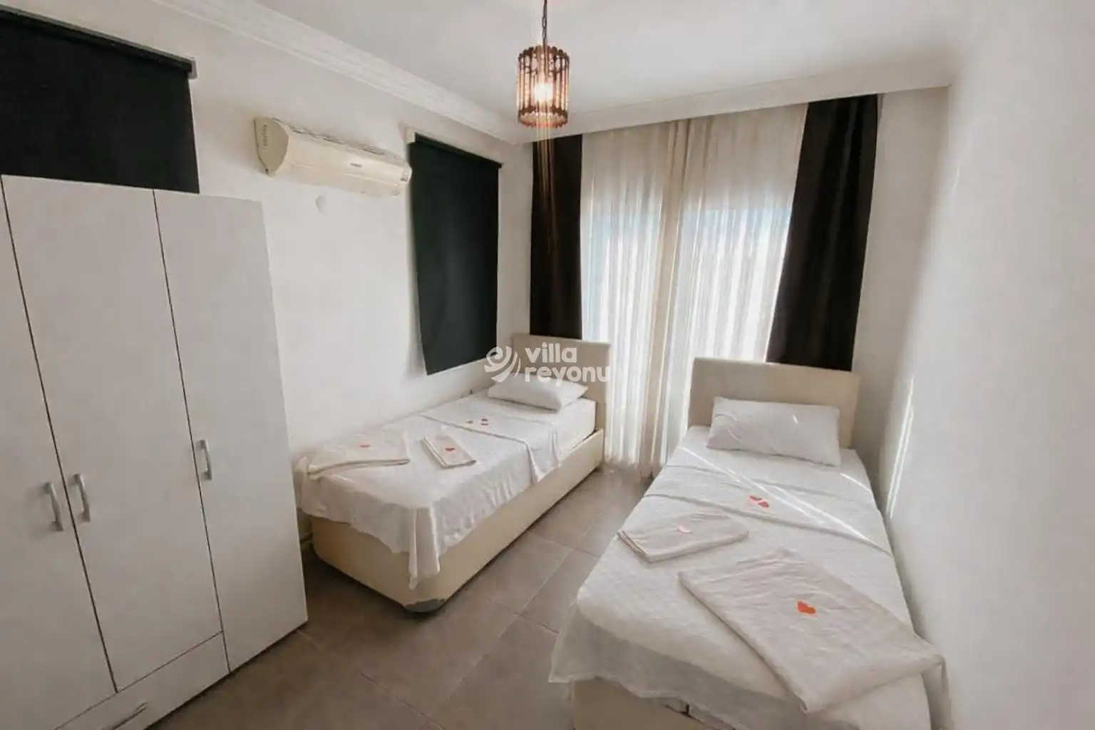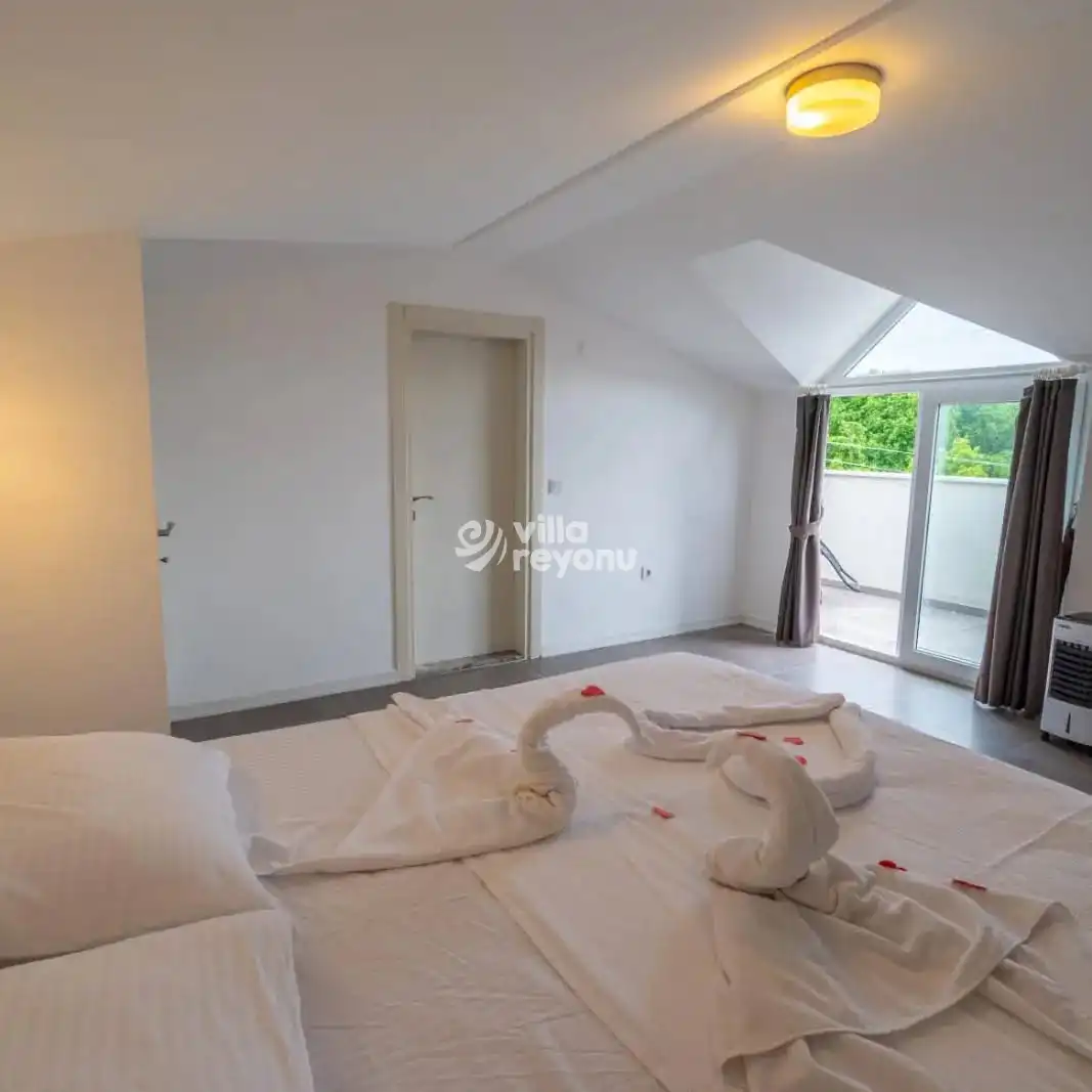 Villa, 3 yatak odalı olup toplamda 6 kişilik konaklama kapasitesine sahiptir. 1. yatak odasında çift kişilik rahat bir yatak, klima, elbise dolabı ve özel ebeveyn banyosu bulunur. 2. ve 3. yatak odalarında ise her biri iki tek kişilik yatak, klima, elbise dolabı ve ebeveyn banyosu ile donatılmıştır.