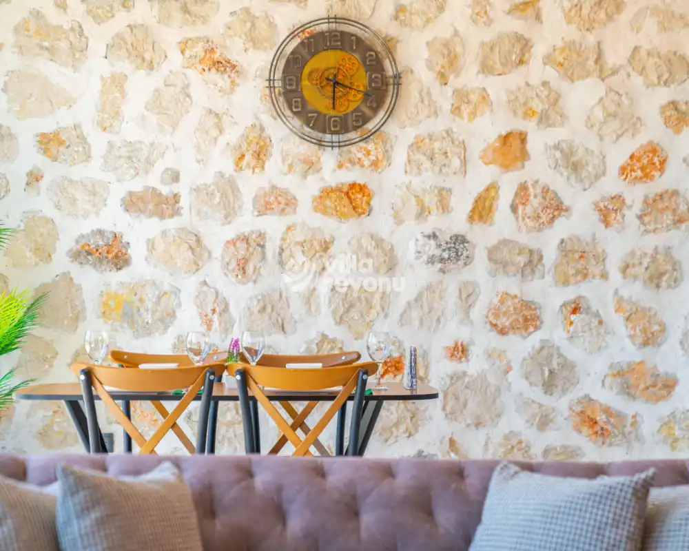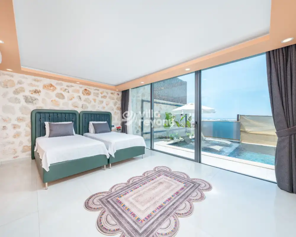 2 yatak odası, 2 banyo tuvalet bulunan villamız 4 kişilik konaklama kapasitesine sahiptir. Şirin yeşil alana sahip bahçesinde özel korunaklı yüzme havuzu, bahçe oturma takımı, salıncak, yemek masası , barbekü ve konforlu şezlongları bulunan villamız; alt katında 2 ayrı yataklı bir oda ve üst katında ise jakuziye sahip bir ebeveyn odasına sahiptir. Şık ve lüks mobilyalarla dizayn edilen, taş ev konseptini lüks bir doğa deneyimi ile muhteşem bir uyum içerisinde birleştiren villamız; çekirdek ailelerimiz için idealdir.