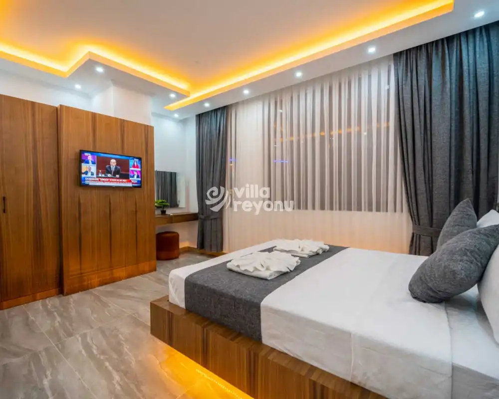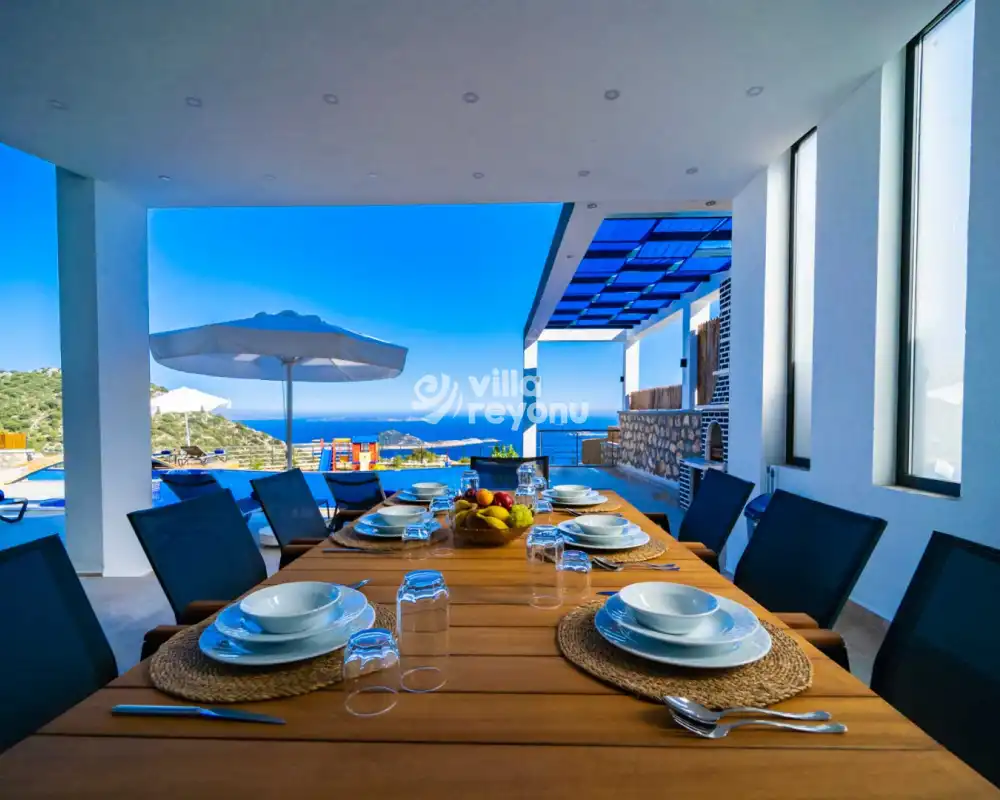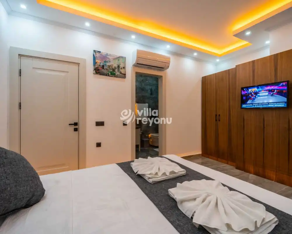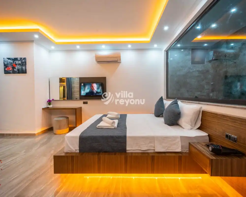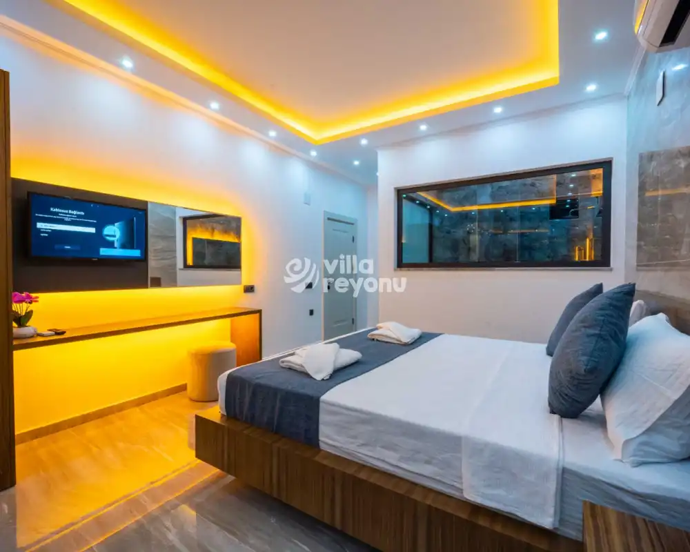 5 yatak odası, 5 banyo-tuvalet bulunan villamız 9 kişilik konaklama kapasitesine sahiptir. Deniz manzaralı geniş havuzu, her yemeğinize muhteşem bir doğa ve denizin eşlik etmesi için konumlandırılmış yemek masası, masa tenisi, langırt, bahçe barbeküsü ve bahçe oturma  takımı,saunası, jakuzisi, kapalı ısıtmalı havuzu, Türk hamamı, spor salonu bulunmaktadır. Salondan ve odalarından günbatımının, mavinin ve yeşilin tadını çıkarmanız için tasarlanmış büyük camları; lüks mobilyalarla döşenmiş iç dizaynı ile 2 km yakınlıkta bulunan denizin keyfini de yorulmadan çıkaracağınız ayrıcalıklı bir tatil için tasarlandı.