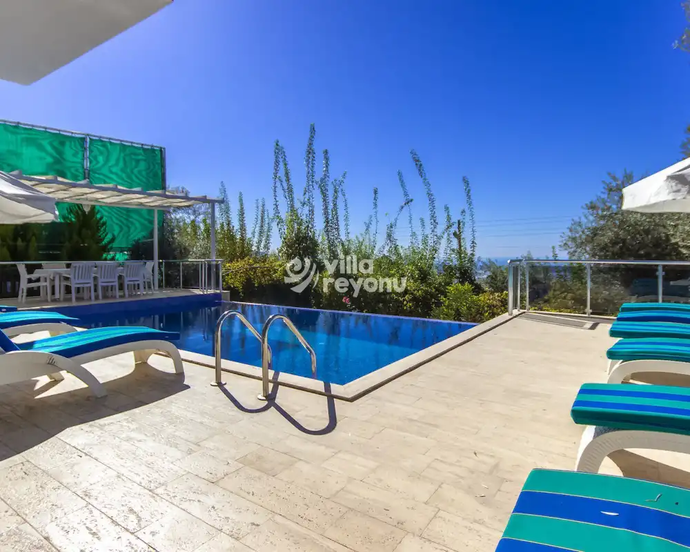 Villa Ebher Kalkan Üzümlü bölgesinde yer alan 5 yatak odalı 9 kişi kapasitesine sahiptir.Geniş aileler için ideal bir seçenektir.Havuz ve havuz terası muhafazakar villalar kategorisine girmektedir.Villanın etrafı yeşilliklerle kaplıdır ve doğanın içindedir.