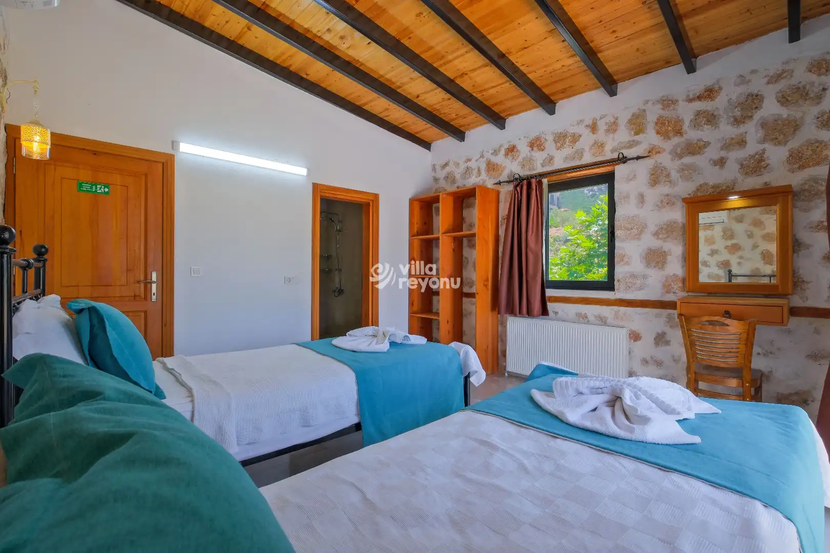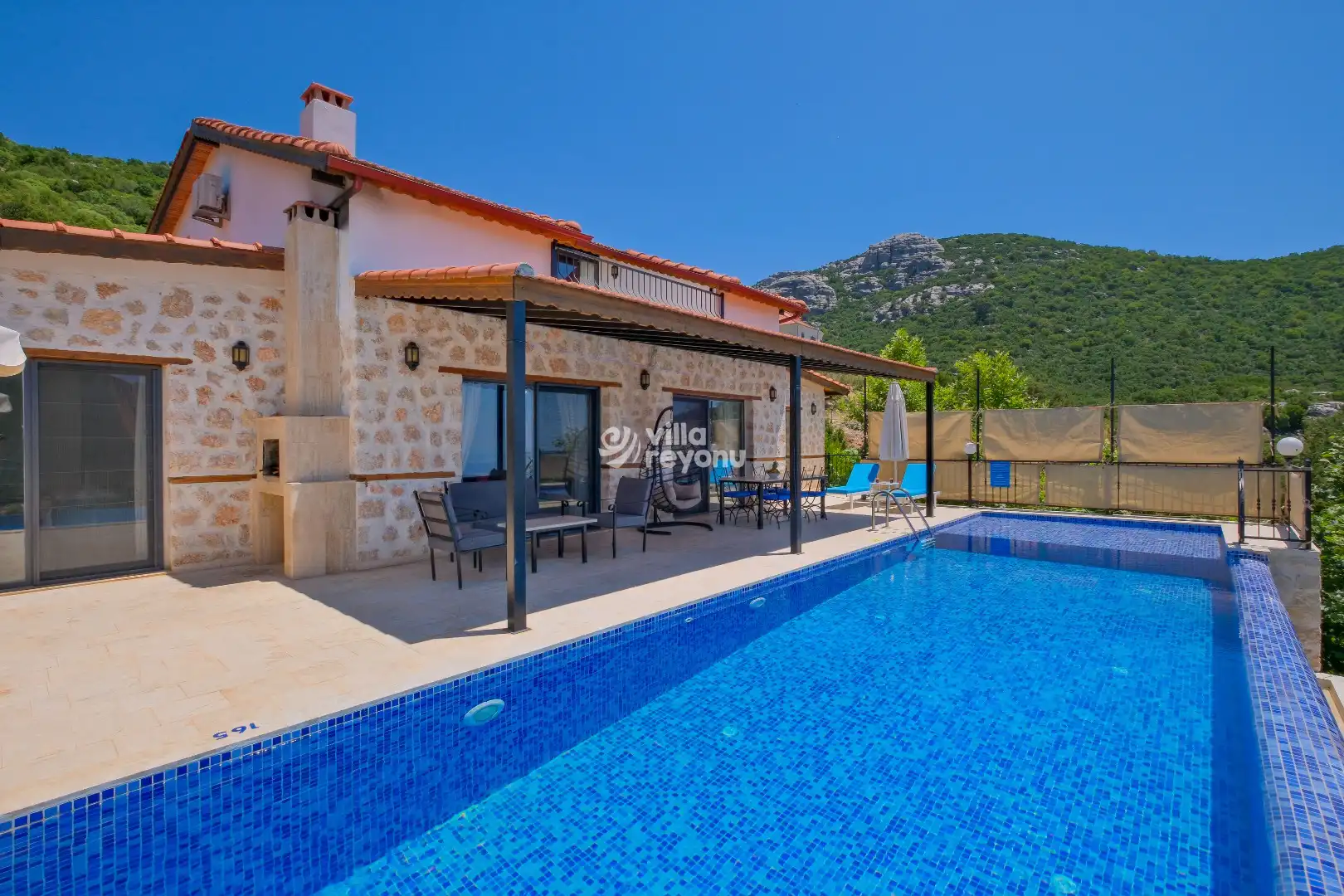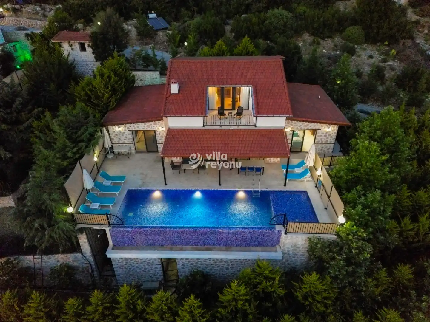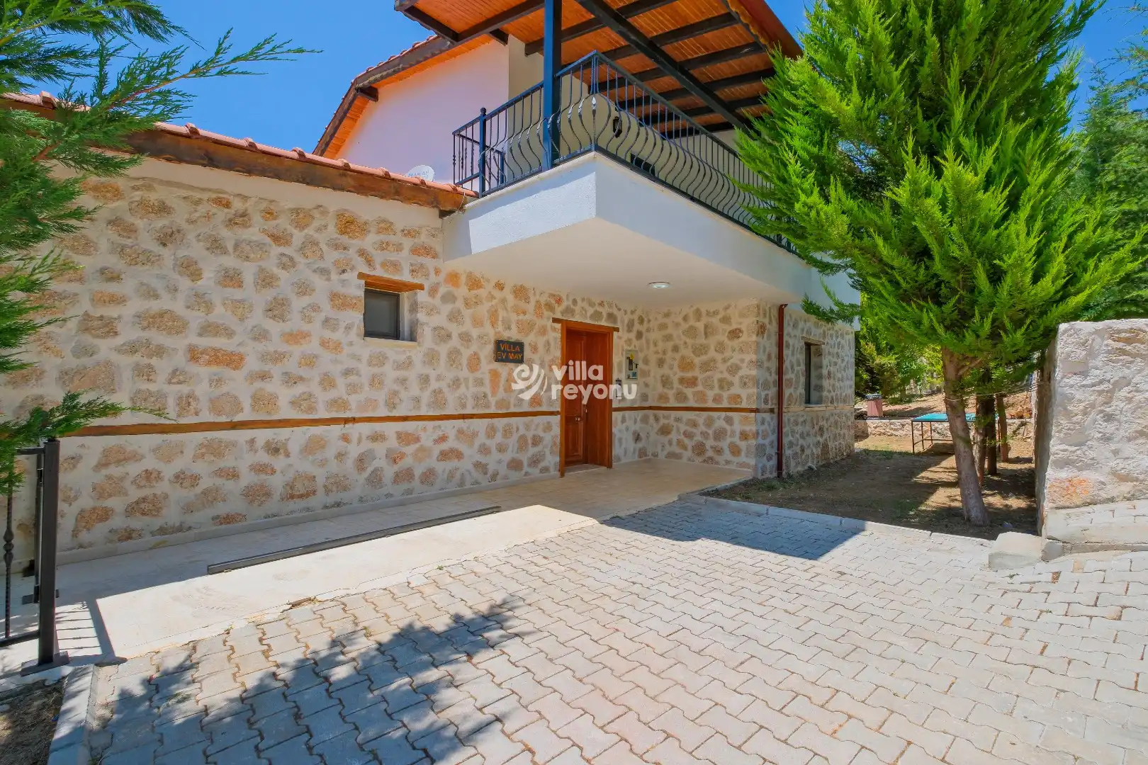 3 yatak odası, 3 banyo tuvalet bulunan villamız 6 kişilik konaklama kapasitesine sahiptir. 44 m2 tam korunaklı sonsuzluk havuzu, şirin bir bahçesi, bahçe yemek masası, köşe takımı, barbekü ve şöminesi bulunmaktadır. Taş yapının ahşap ile harmanlanmasının en güzel özelliklerden olup; yenilikçi ve modern iç tasarımı, yeşilin her tonuna hakim bakmaya doyamayacağınız manzarasıyla izole ve özel bir tatil deneyimi için tasarlandı.