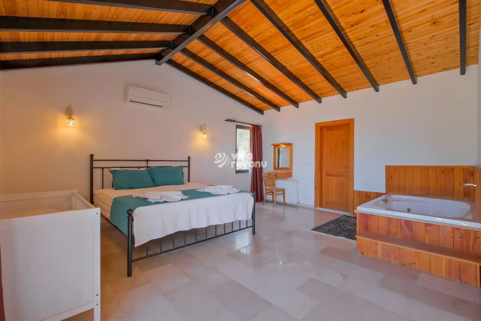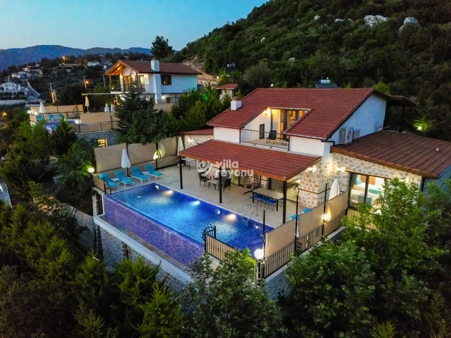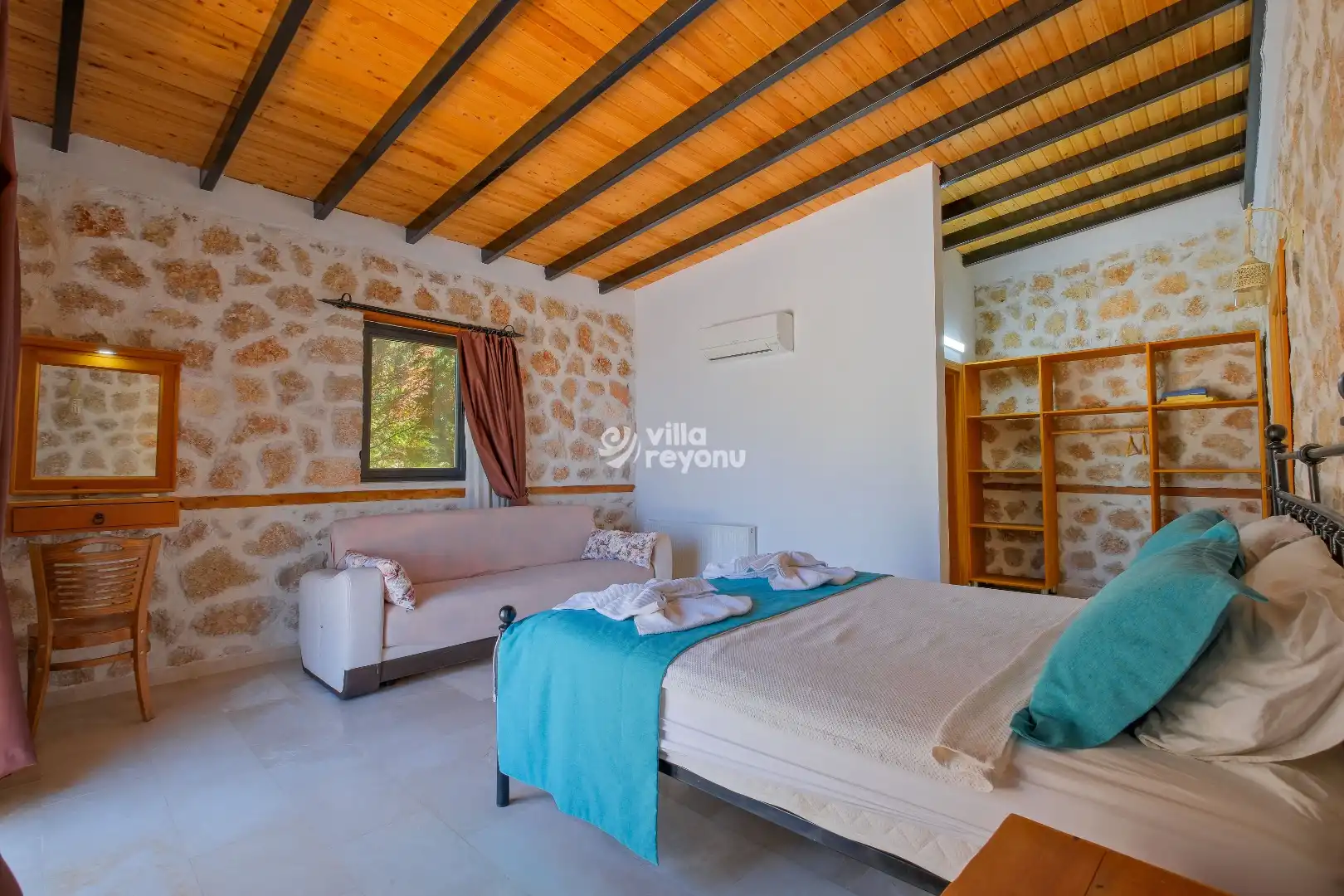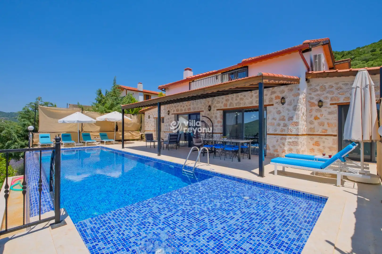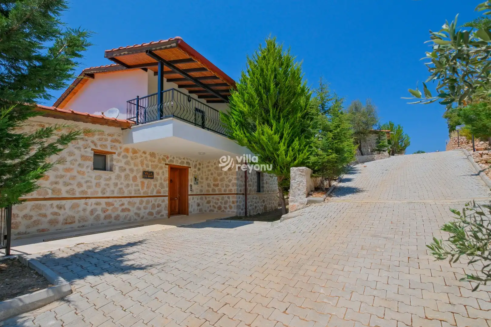 3 yatak odası, 3 banyo tuvalet bulunan villamız 6 kişilik konaklama kapasitesine sahiptir. 44 m2 tam korunaklı sonsuzluk havuzu, şirin bir bahçesi, bahçe yemek masası, köşe takımı, barbekü ve şöminesi bulunmaktadır. Taş yapının ahşap ile harmanlanmasının en güzel özelliklerden olup; yenilikçi ve modern iç tasarımı, yeşilin her tonuna hakim bakmaya doyamayacağınız manzarasıyla izole ve özel bir tatil deneyimi için tasarlandı.