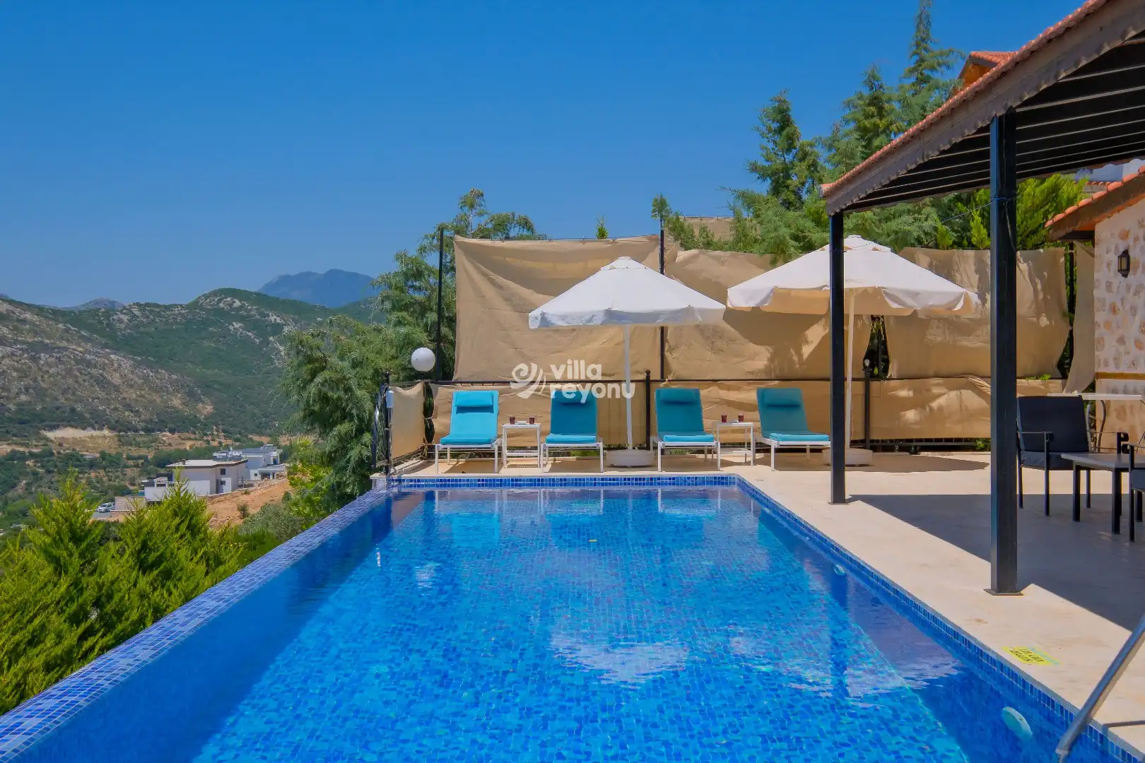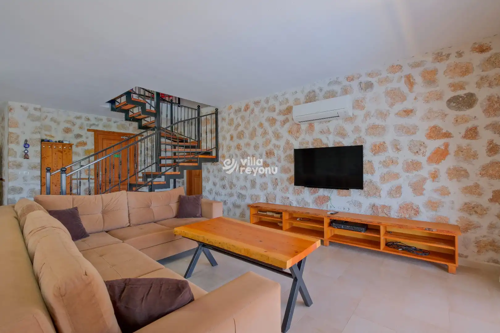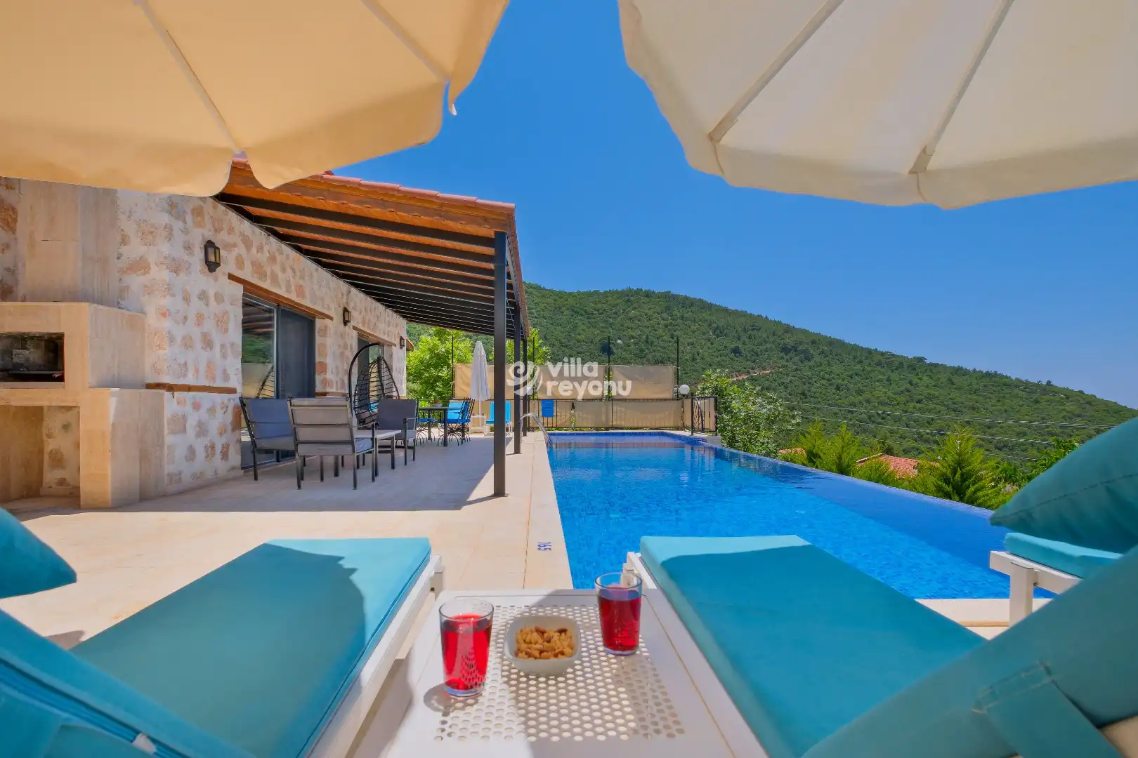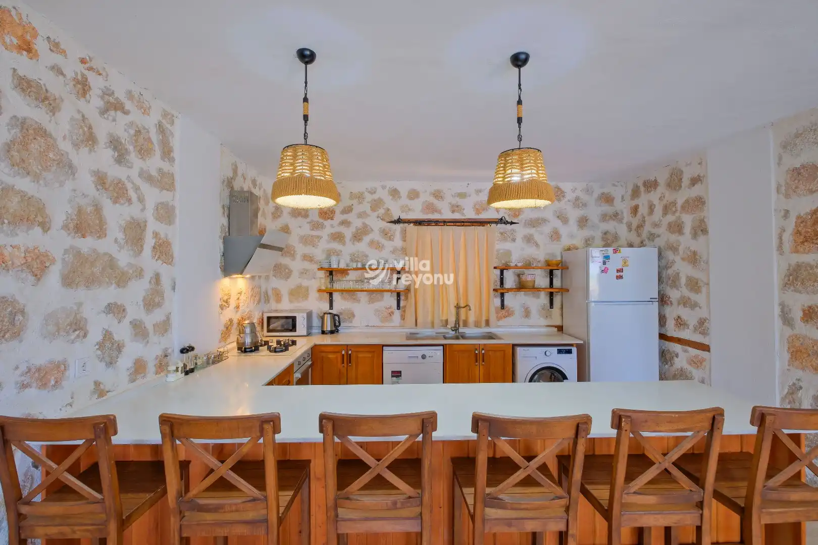 3 yatak odası, 3 banyo tuvalet bulunan villamız 6 kişilik konaklama kapasitesine sahiptir. 44 m2 tam korunaklı sonsuzluk havuzu, şirin bir bahçesi, bahçe yemek masası, köşe takımı, barbekü ve şöminesi bulunmaktadır. Taş yapının ahşap ile harmanlanmasının en güzel özelliklerden olup; yenilikçi ve modern iç tasarımı, yeşilin her tonuna hakim bakmaya doyamayacağınız manzarasıyla izole ve özel bir tatil deneyimi için tasarlandı.