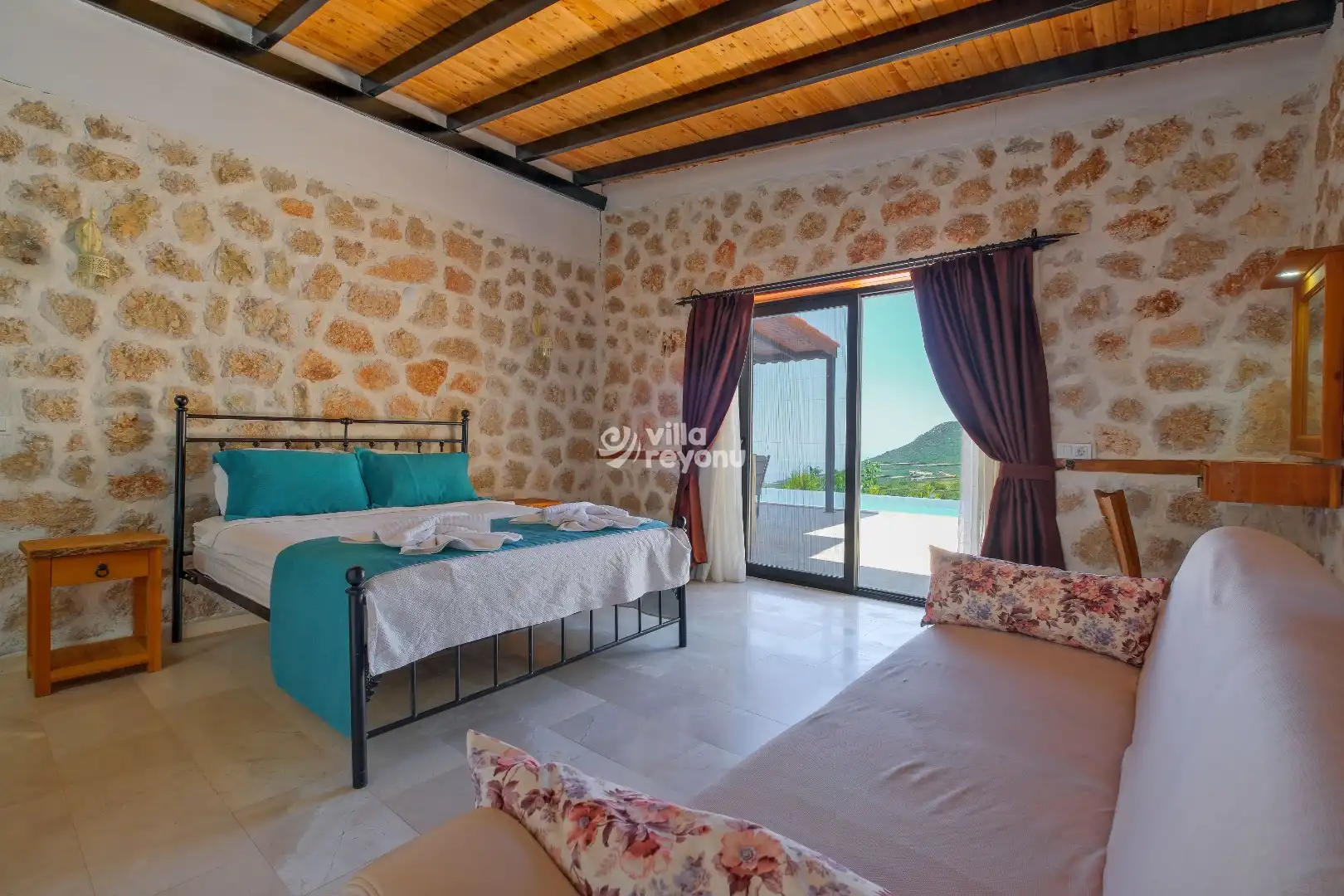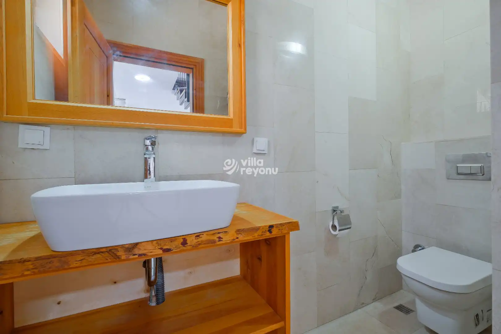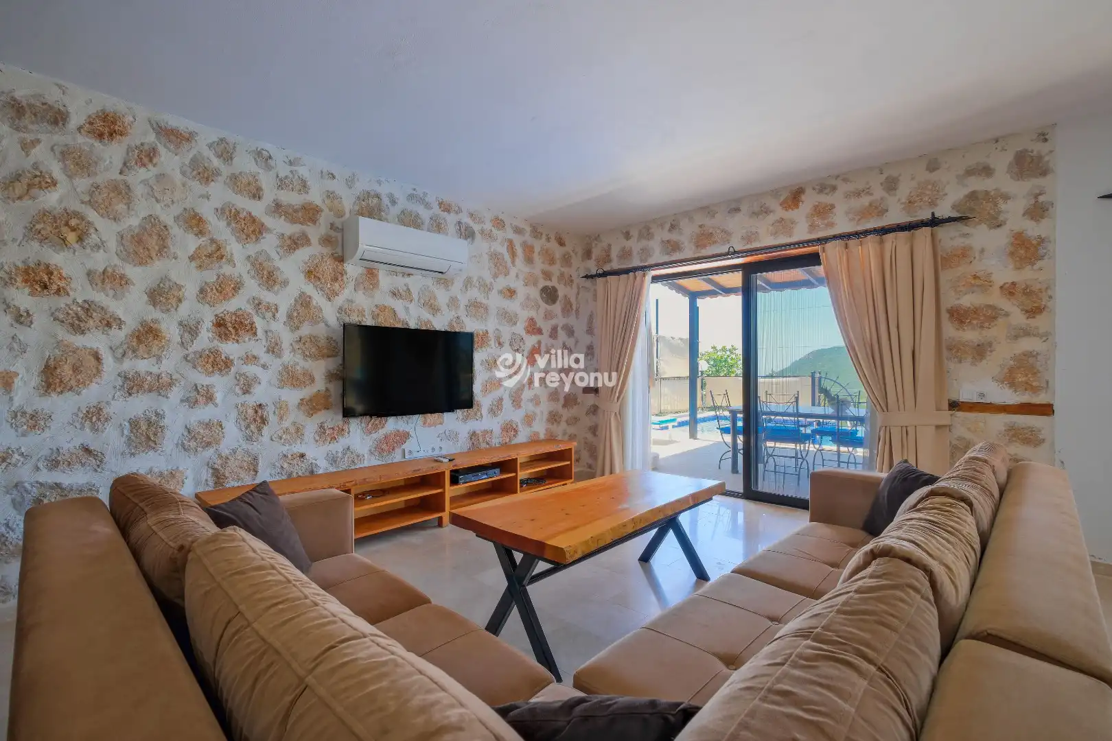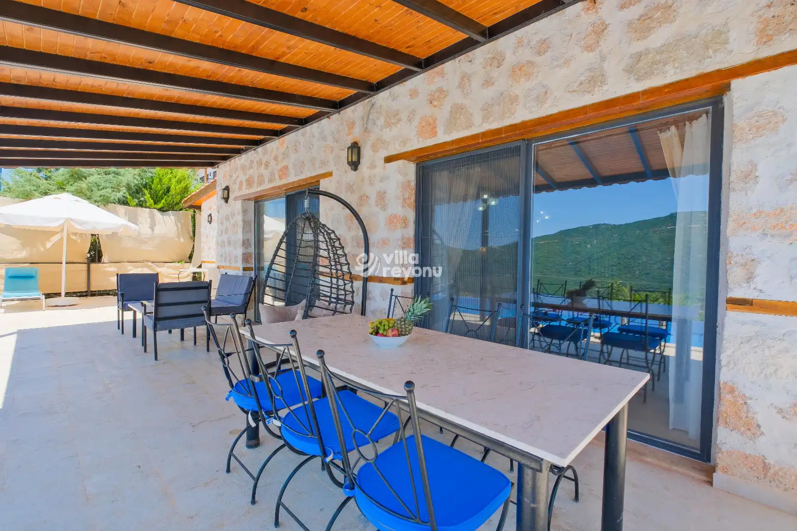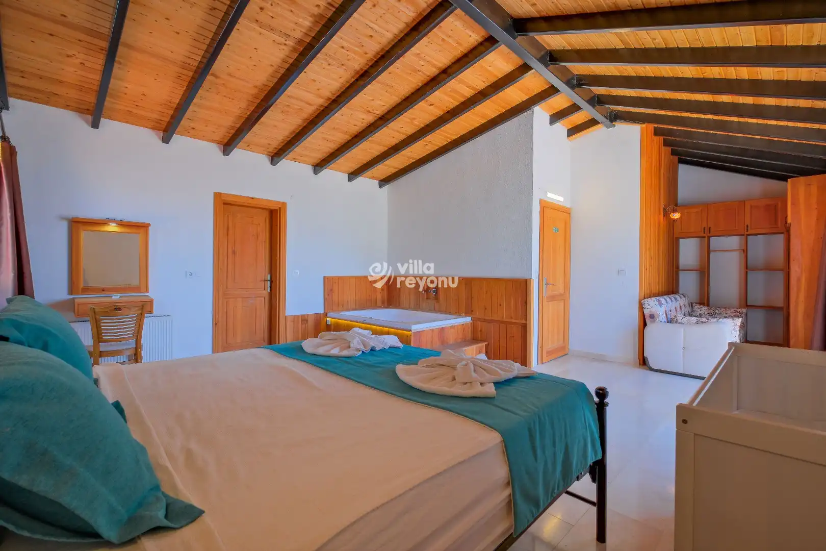 3 yatak odası, 3 banyo tuvalet bulunan villamız 6 kişilik konaklama kapasitesine sahiptir. 44 m2 tam korunaklı sonsuzluk havuzu, şirin bir bahçesi, bahçe yemek masası, köşe takımı, barbekü ve şöminesi bulunmaktadır. Taş yapının ahşap ile harmanlanmasının en güzel özelliklerden olup; yenilikçi ve modern iç tasarımı, yeşilin her tonuna hakim bakmaya doyamayacağınız manzarasıyla izole ve özel bir tatil deneyimi için tasarlandı.