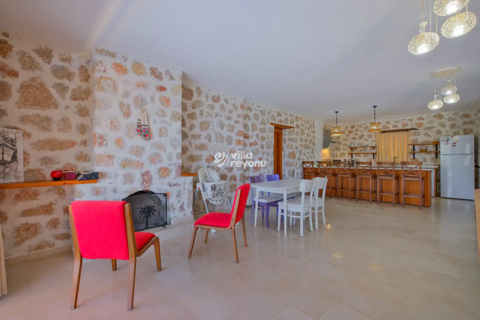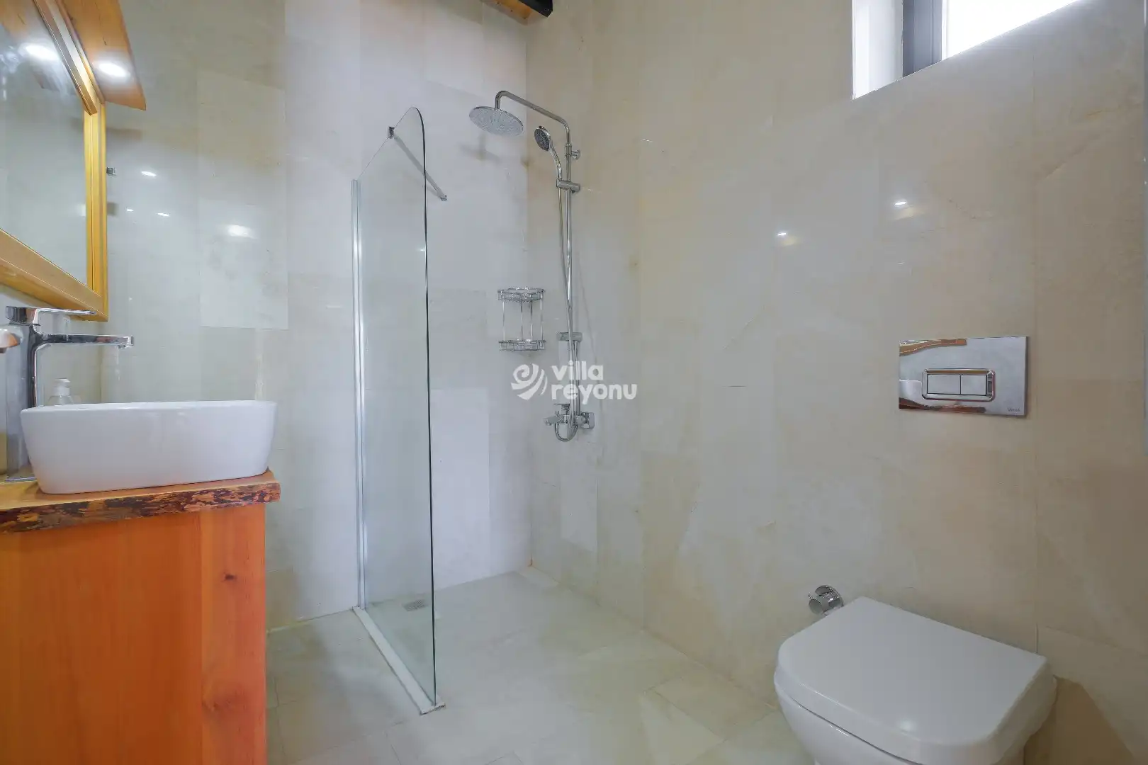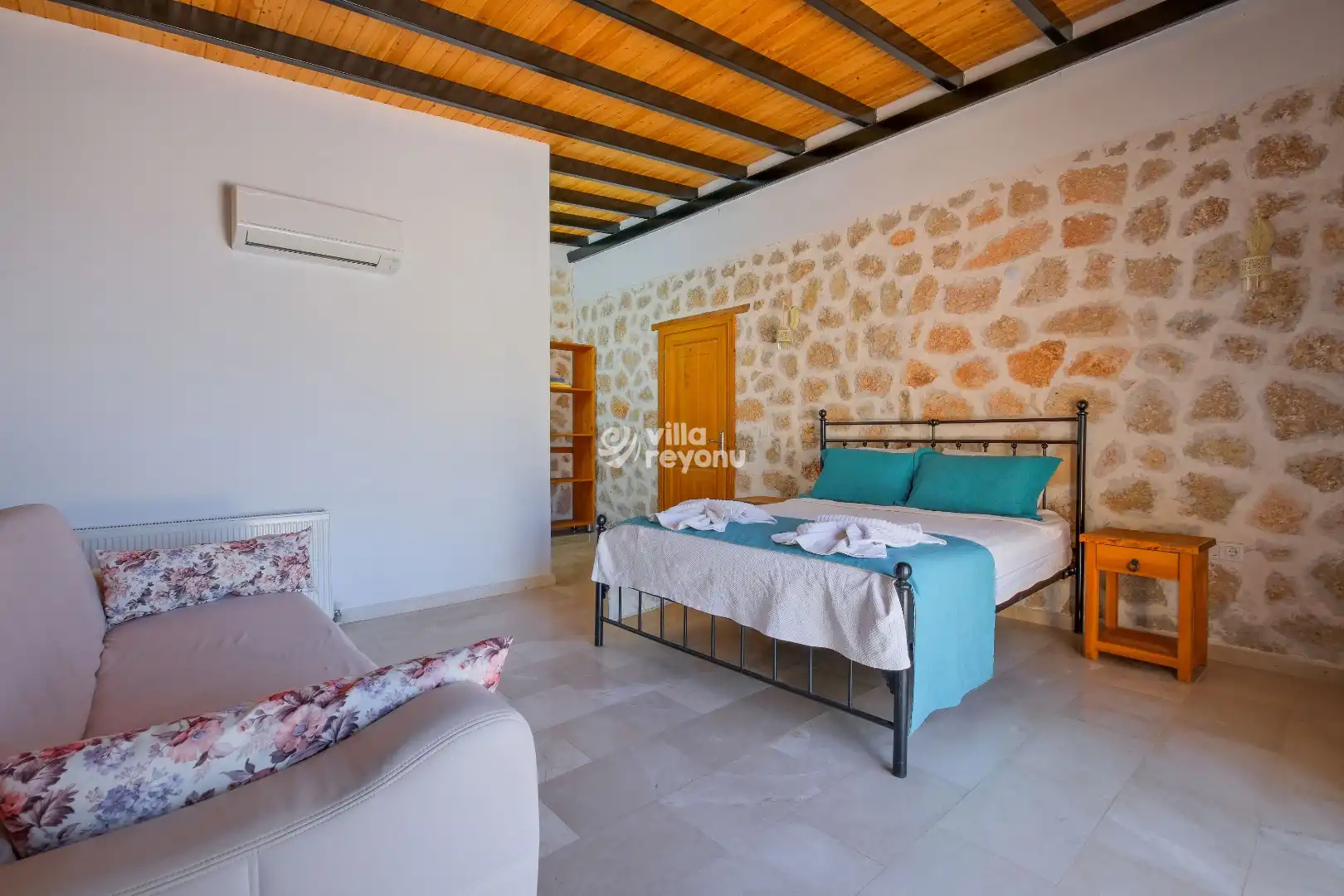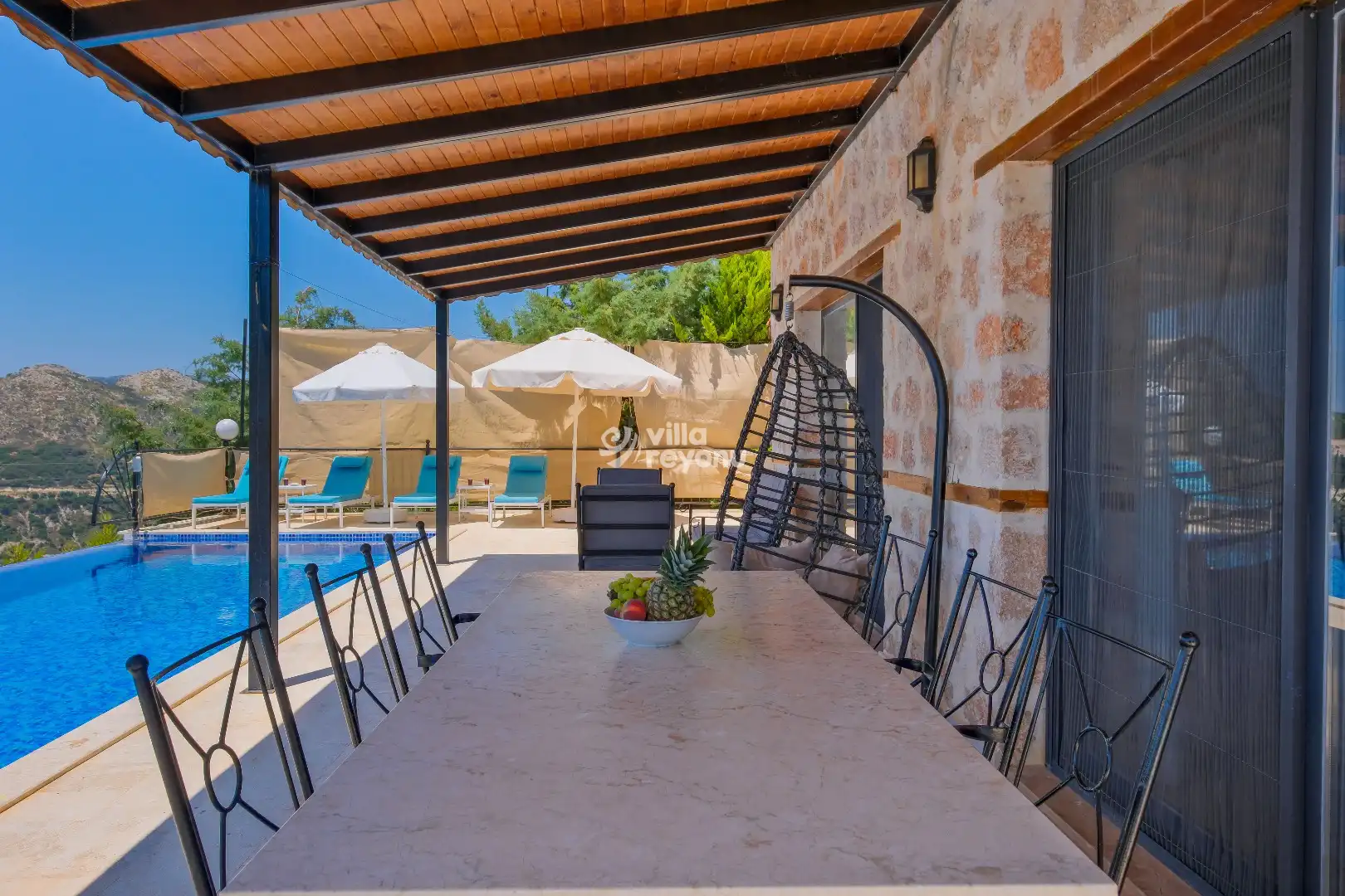 3 yatak odası, 3 banyo tuvalet bulunan villamız 6 kişilik konaklama kapasitesine sahiptir. 44 m2 tam korunaklı sonsuzluk havuzu, şirin bir bahçesi, bahçe yemek masası, köşe takımı, barbekü ve şöminesi bulunmaktadır. Taş yapının ahşap ile harmanlanmasının en güzel özelliklerden olup; yenilikçi ve modern iç tasarımı, yeşilin her tonuna hakim bakmaya doyamayacağınız manzarasıyla izole ve özel bir tatil deneyimi için tasarlandı.