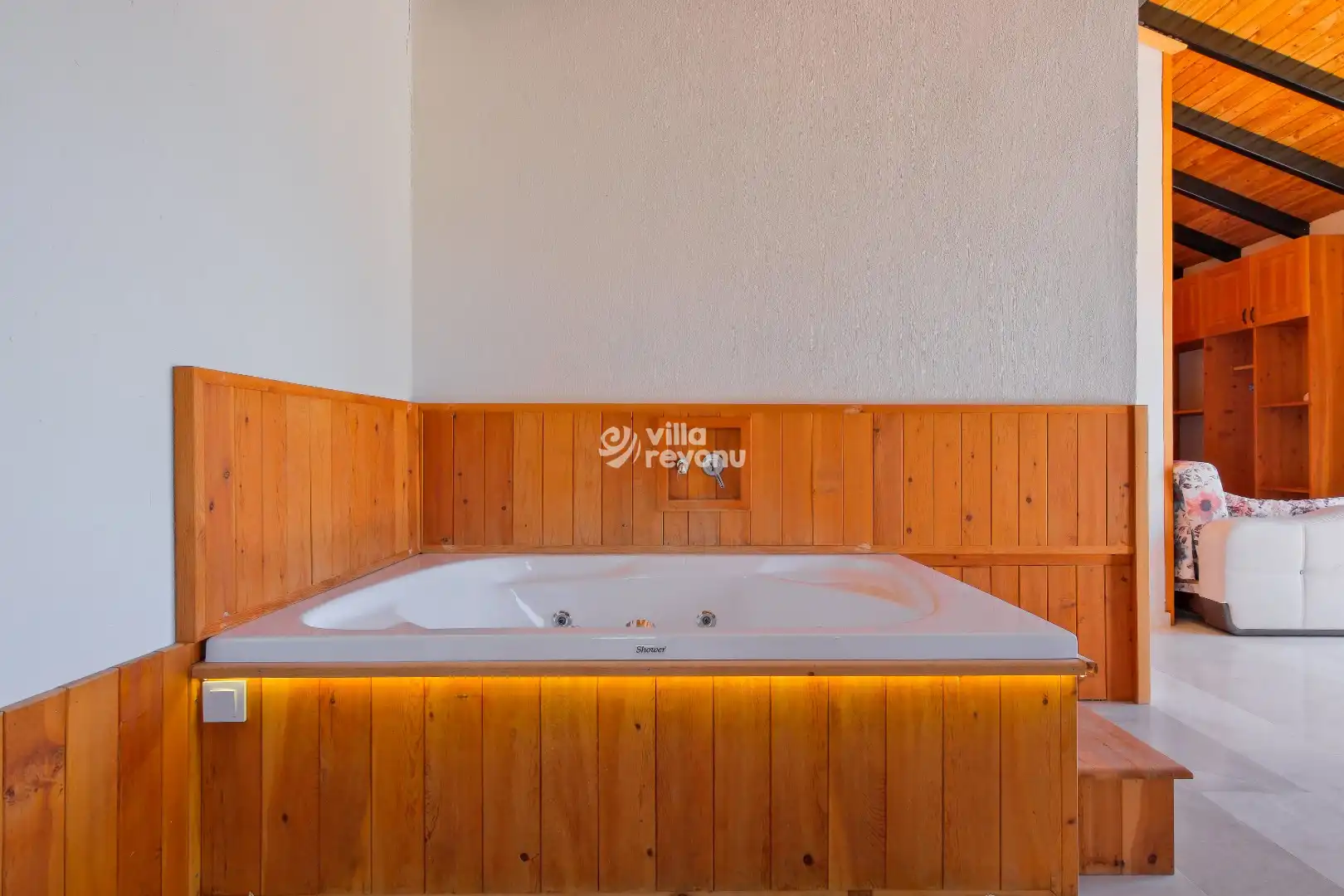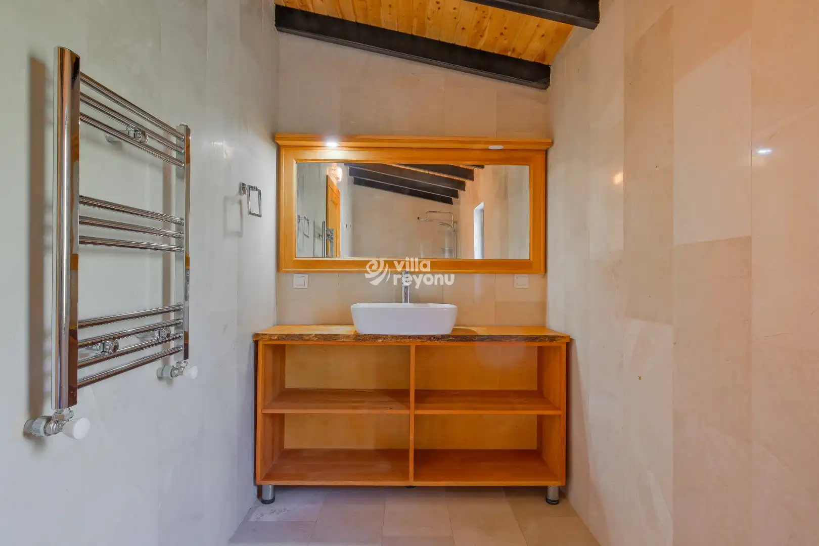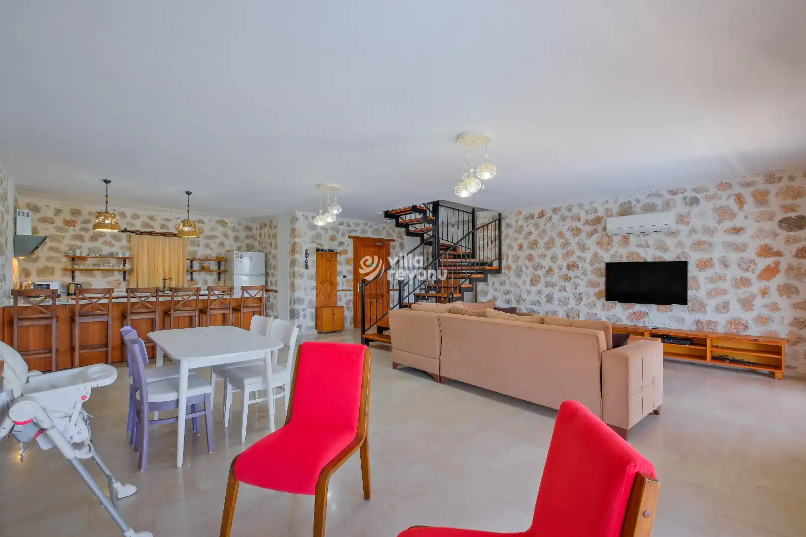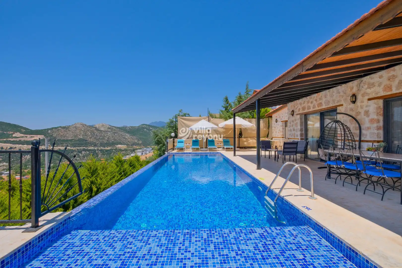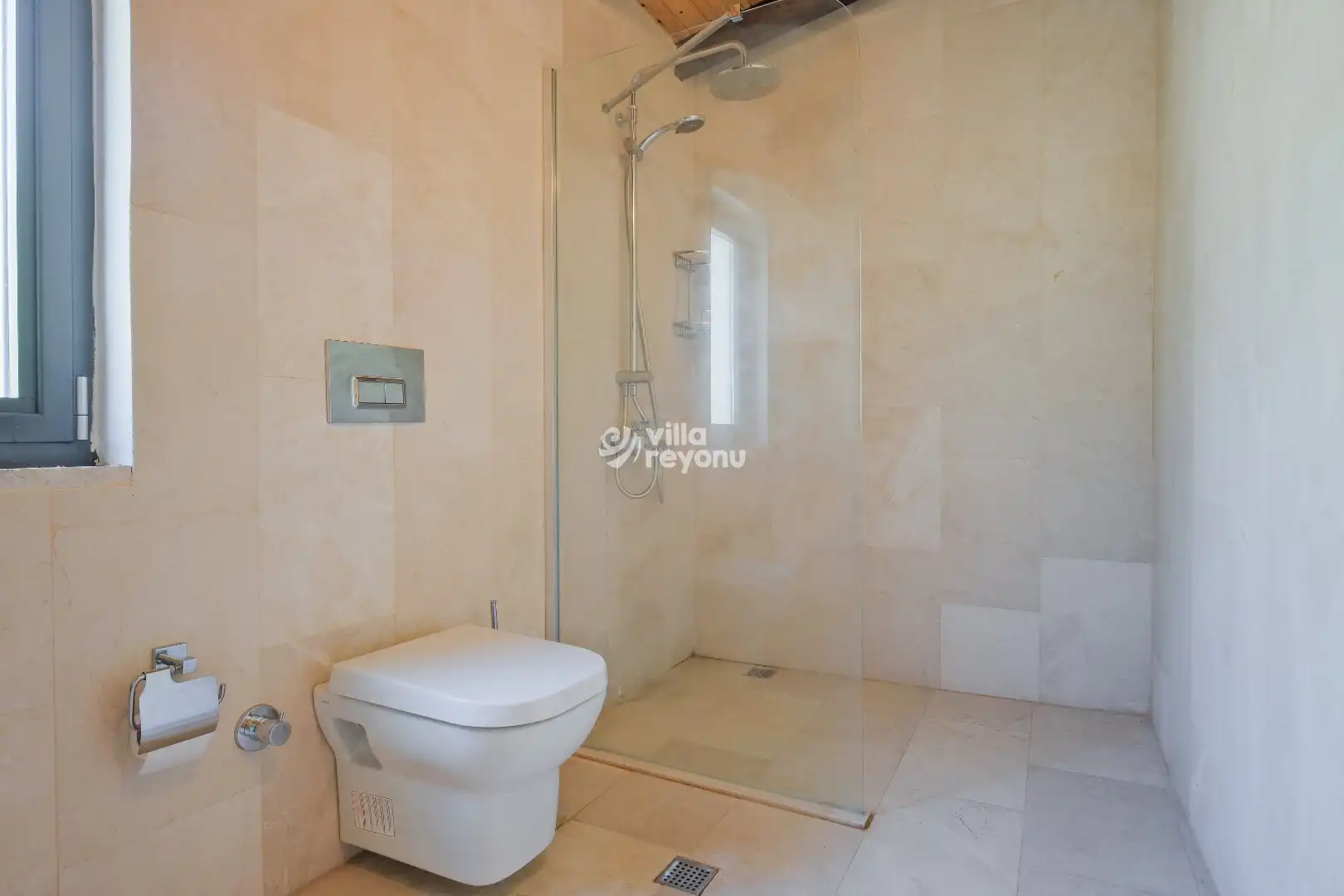 3 yatak odası, 3 banyo tuvalet bulunan villamız 6 kişilik konaklama kapasitesine sahiptir. 44 m2 tam korunaklı sonsuzluk havuzu, şirin bir bahçesi, bahçe yemek masası, köşe takımı, barbekü ve şöminesi bulunmaktadır. Taş yapının ahşap ile harmanlanmasının en güzel özelliklerden olup; yenilikçi ve modern iç tasarımı, yeşilin her tonuna hakim bakmaya doyamayacağınız manzarasıyla izole ve özel bir tatil deneyimi için tasarlandı.