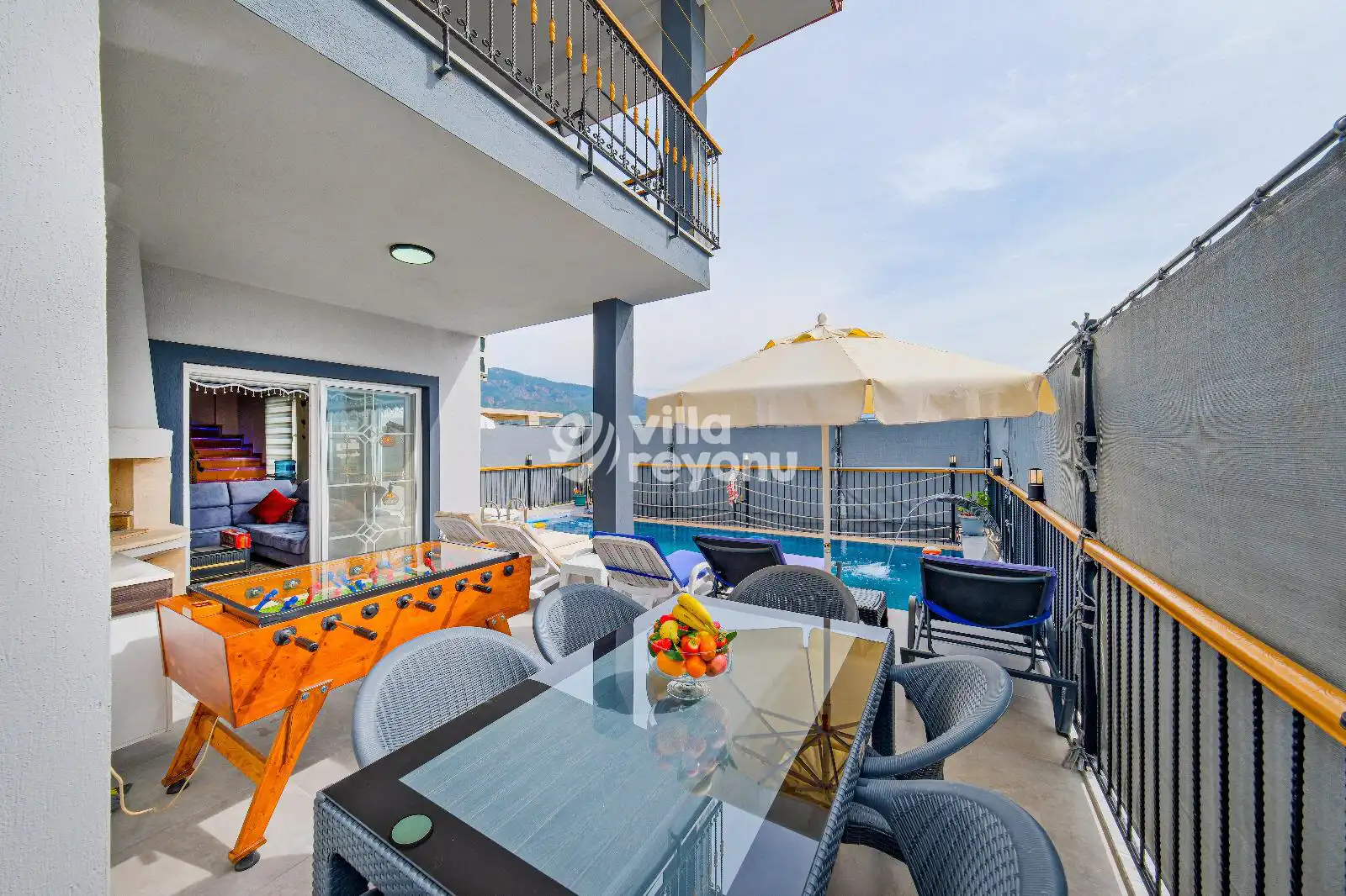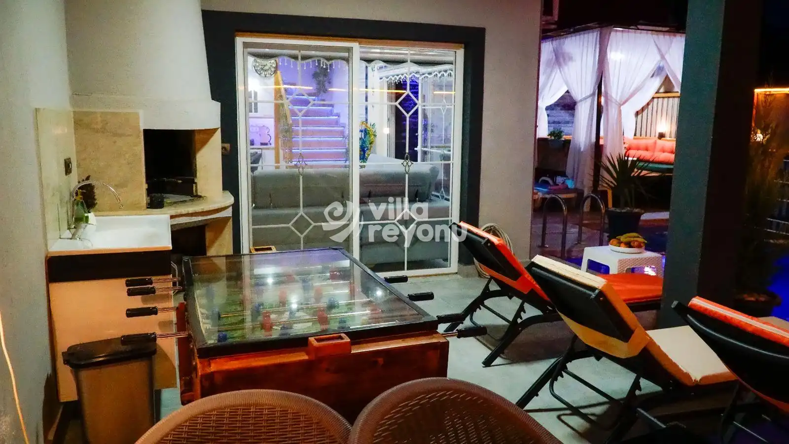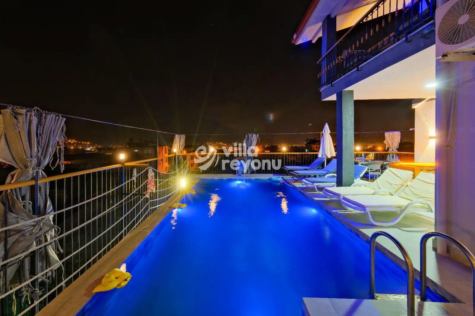 Villa Esin, ülkemizin güzide tatil beldelerinden Fethiye'de Karaçulha mevkisinde konumlanmış, modern mimarisi ile dikkat çeken iki katlı villamızdır. 3 yatak odası ve 2 banyo tuvaletiyle villamız bir adet çocuk yatağıyla beraber 7 kişilik konaklama kapasitesiyle geniş aileler ve kalabalık arkadaş grupları için ideal bir seçenek olarak öne çıkmaktadır. Villamızın havuz alanında bulunan jakuzisiyle yılın yorgunluğu atabilir, korunaklı özel yüzme havuzu ile sıcak havalarda serinleyebilirsiniz. Özel yüzme havuzu, konforlu şezlongları ve yaz aylarının vazgeçilmezi barbeküsüyle villamız, gözlerden uzak ve huzurlu bir tatil geçirmek isteyen misafirlerini bekliyor.