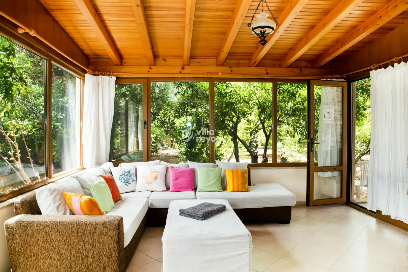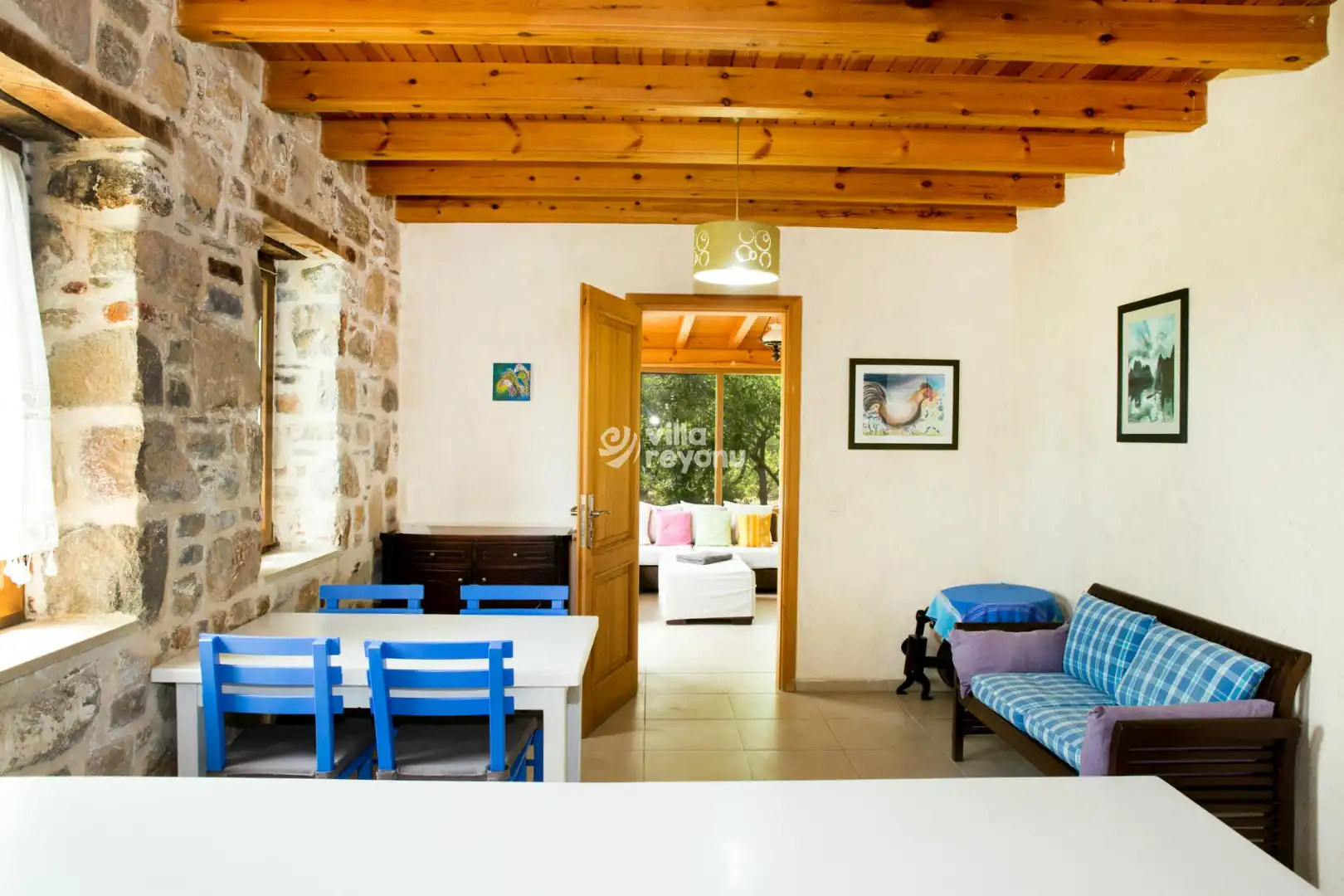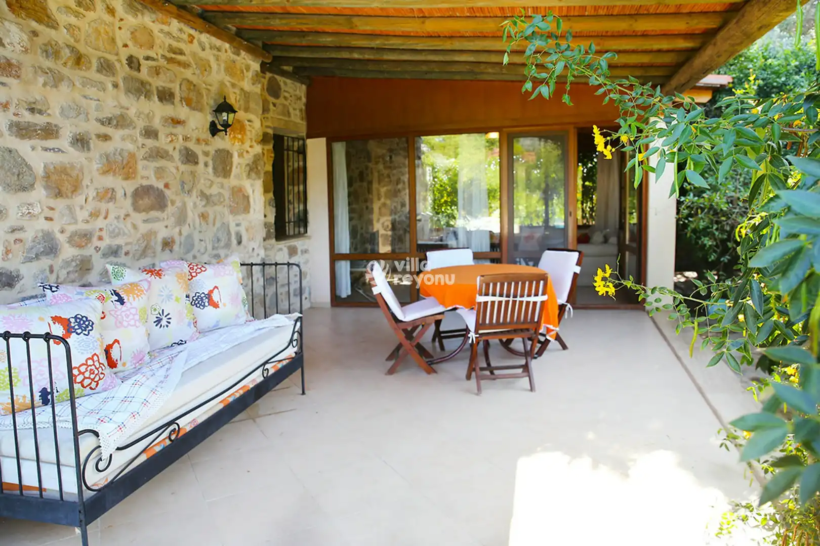 Doğal taş malzemeden inşa edilen Villa Karia, geleneksel Ege mimarisini modern konforla birleştiriyor. Geniş salon alanı, keyifli vakit geçirmeniz için konforlu bir oturma grubu ve televizyon alanıyla tamamlanmıştır. Havuz kenarında yer alan geniş veranda, akşam yemeklerinizi mandalina, limon ve portakal ağaçlarının mis gibi kokuları eşliğinde yemeniz için ideal bir ortam sunar. Bahçede mangal yapma imkânınız da bulunmaktadır.