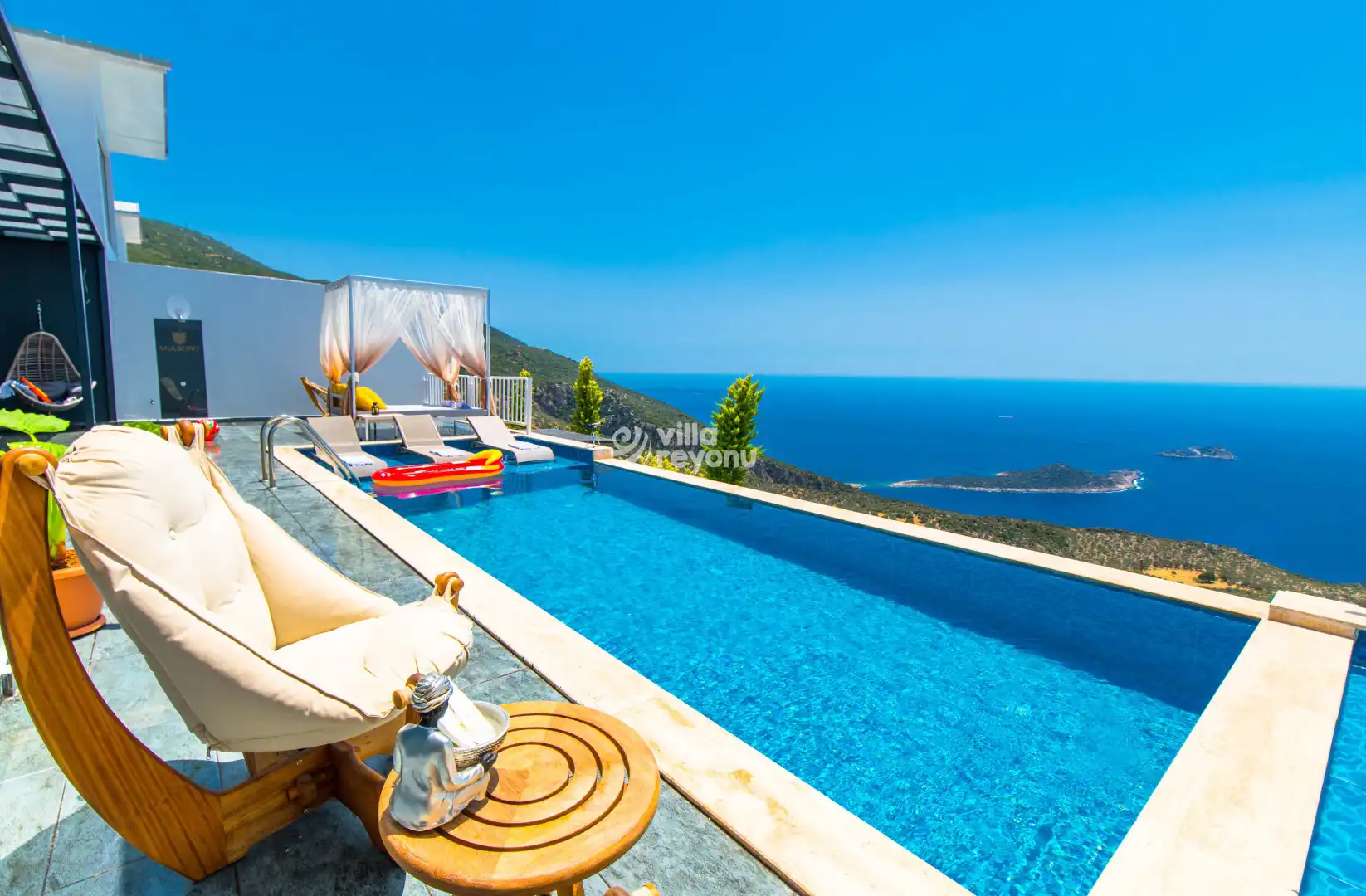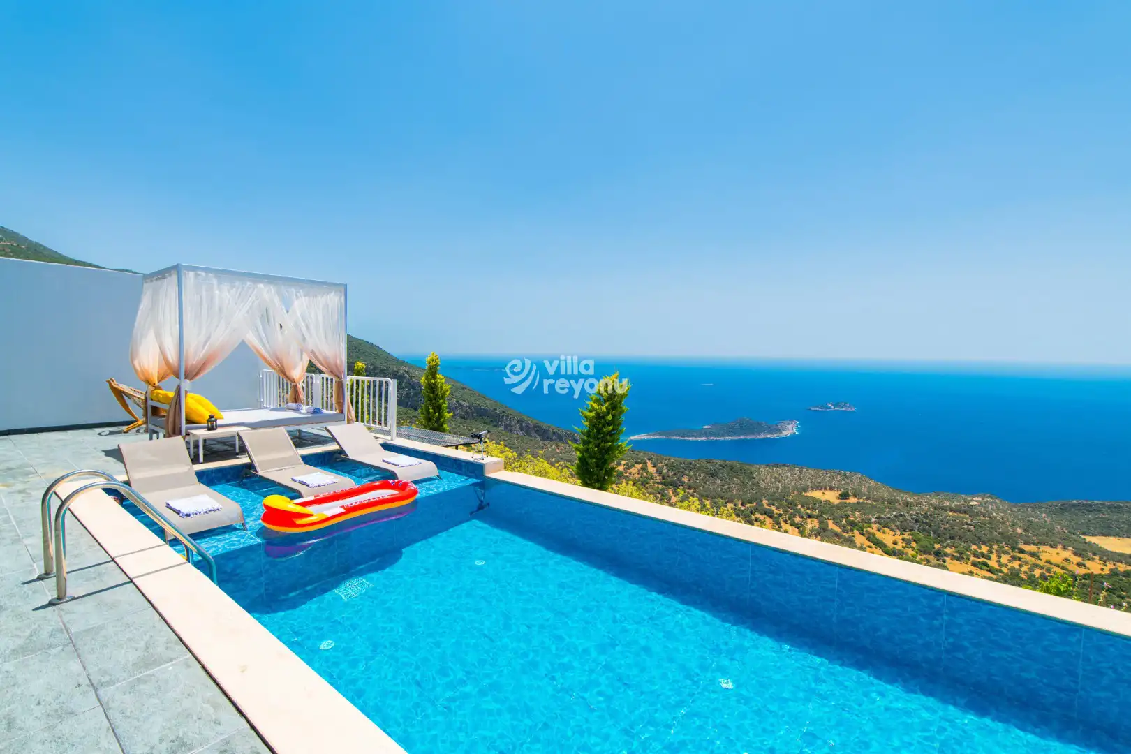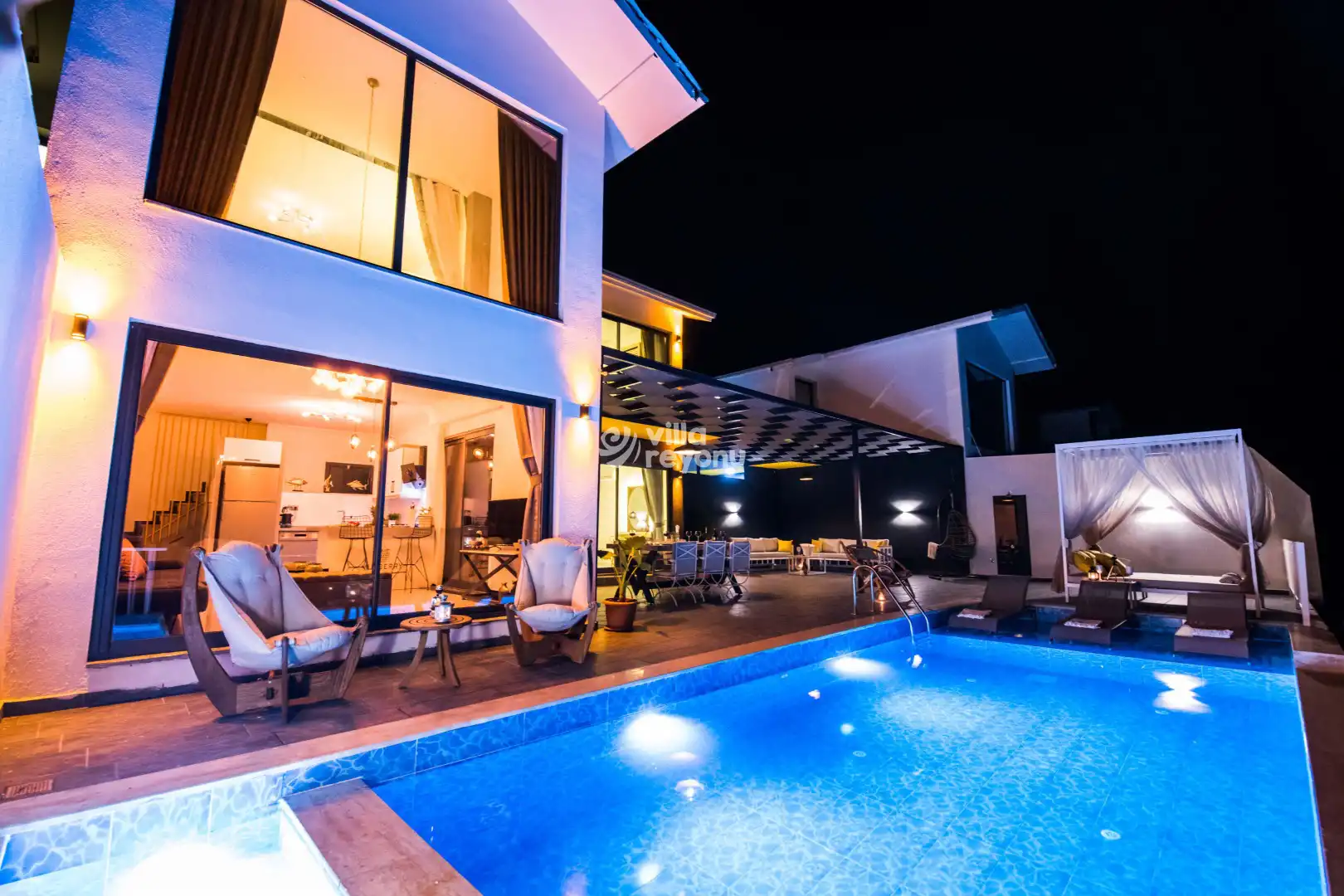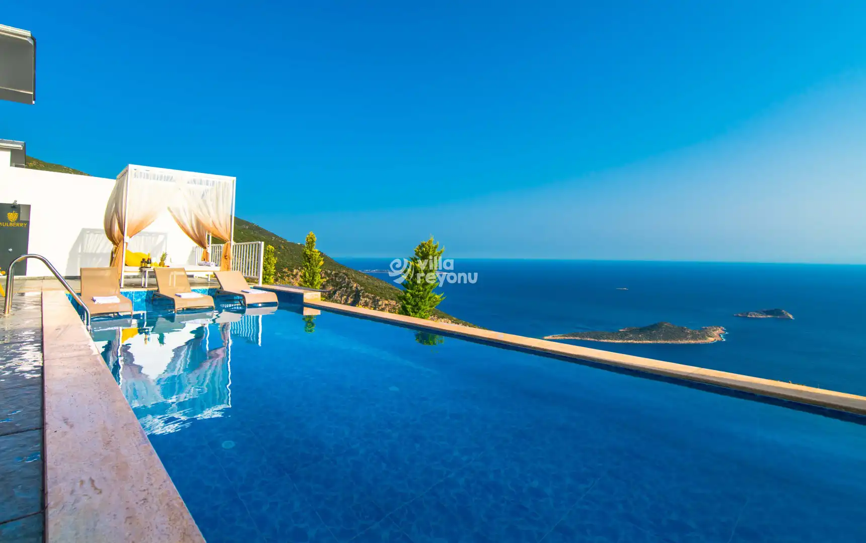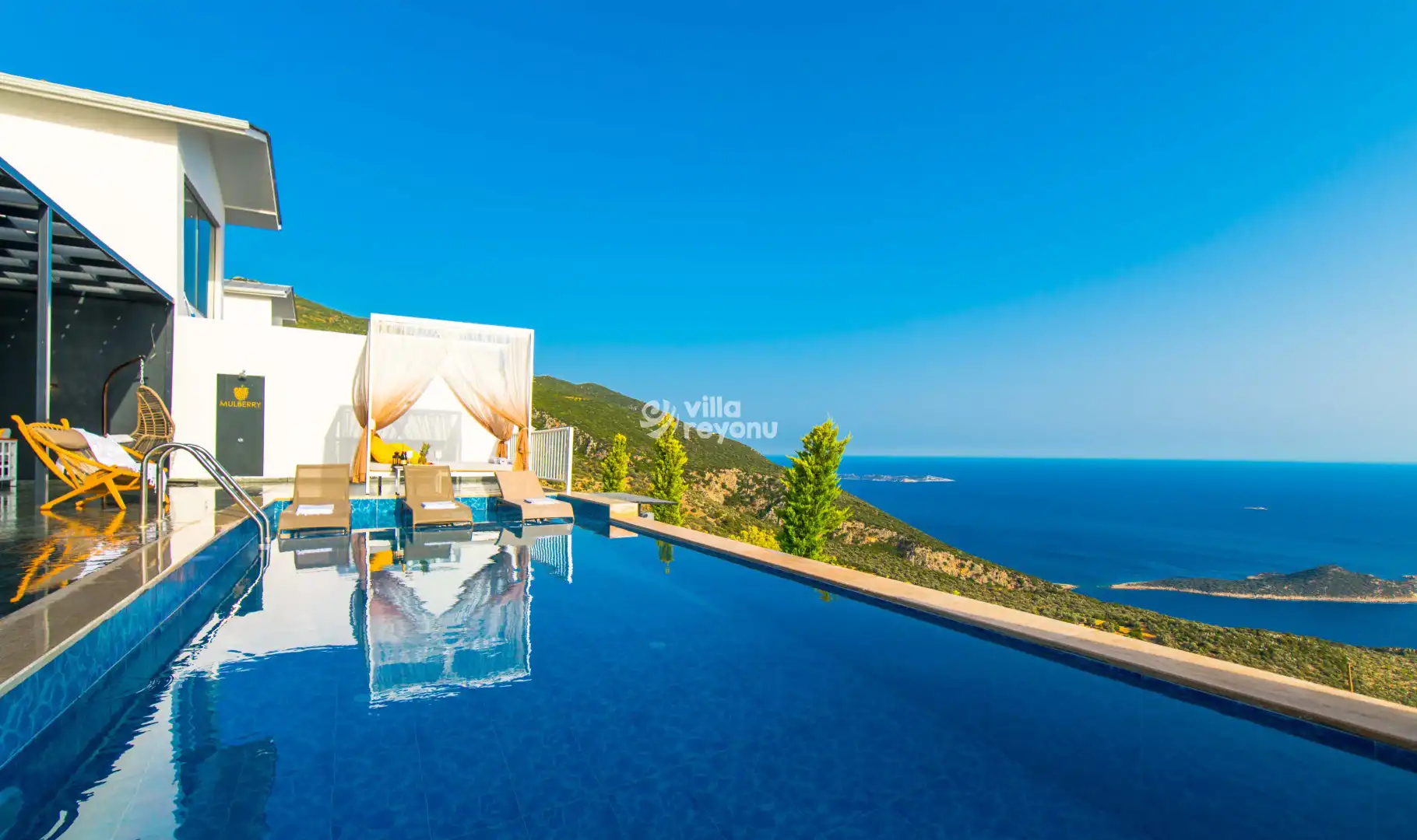 Villa Kiraz 2, Kalkan Kördere mevkiinde konumlanan, eşsiz deniz manzarasına hakim konumu ve 6 kişilik konaklama kapasitesiyle aileler ve arkadaş grupları için lüks ve konforlu bir tatil deneyimi sunmaktadır; modern ve şık tasarıma sahip dubleks villamızda geniş özel yüzme havuzu ve çocuklar için sığ havuz, deniz manzaralı ferah teras alanı, barbekü, bahçede köşk ve salıncak ile keyifli vakit geçirebileceğiniz alanlar yer alırken, jakuzi sayesinde günün yorgunluğunu konforla atabilirsiniz. Tam donanımlı mutfağı ve özenle tasarlanmış yaşam alanlarıyla tüm ihtiyaçlarınıza cevap veren Villa Kiraz 2, yeni sezonda da siz değerli misafirlerini ayrıcalıklı ve huzur dolu bir Akdeniz tatiline davet etmektedir.