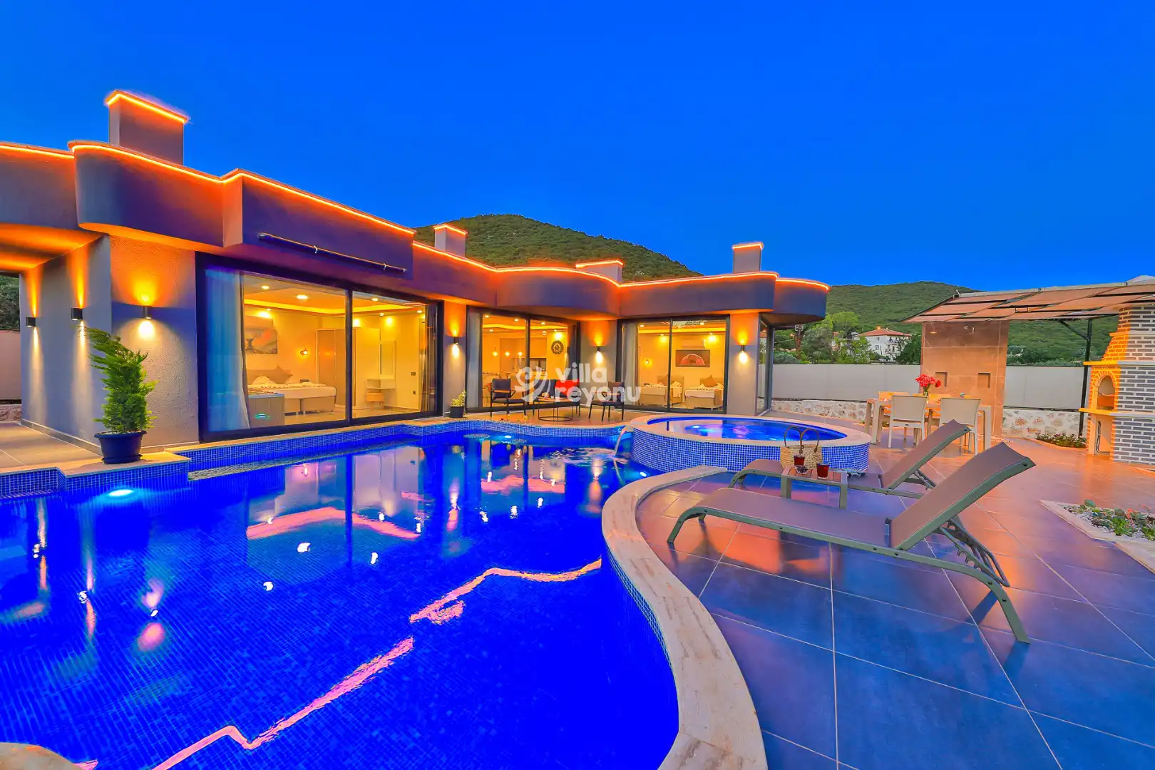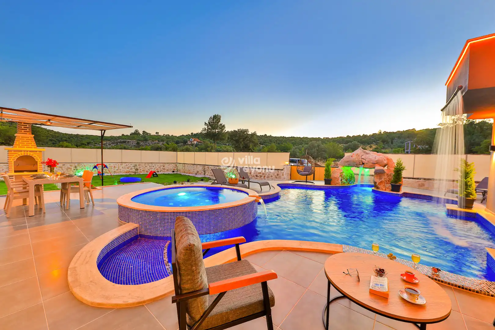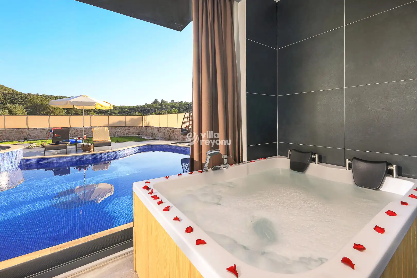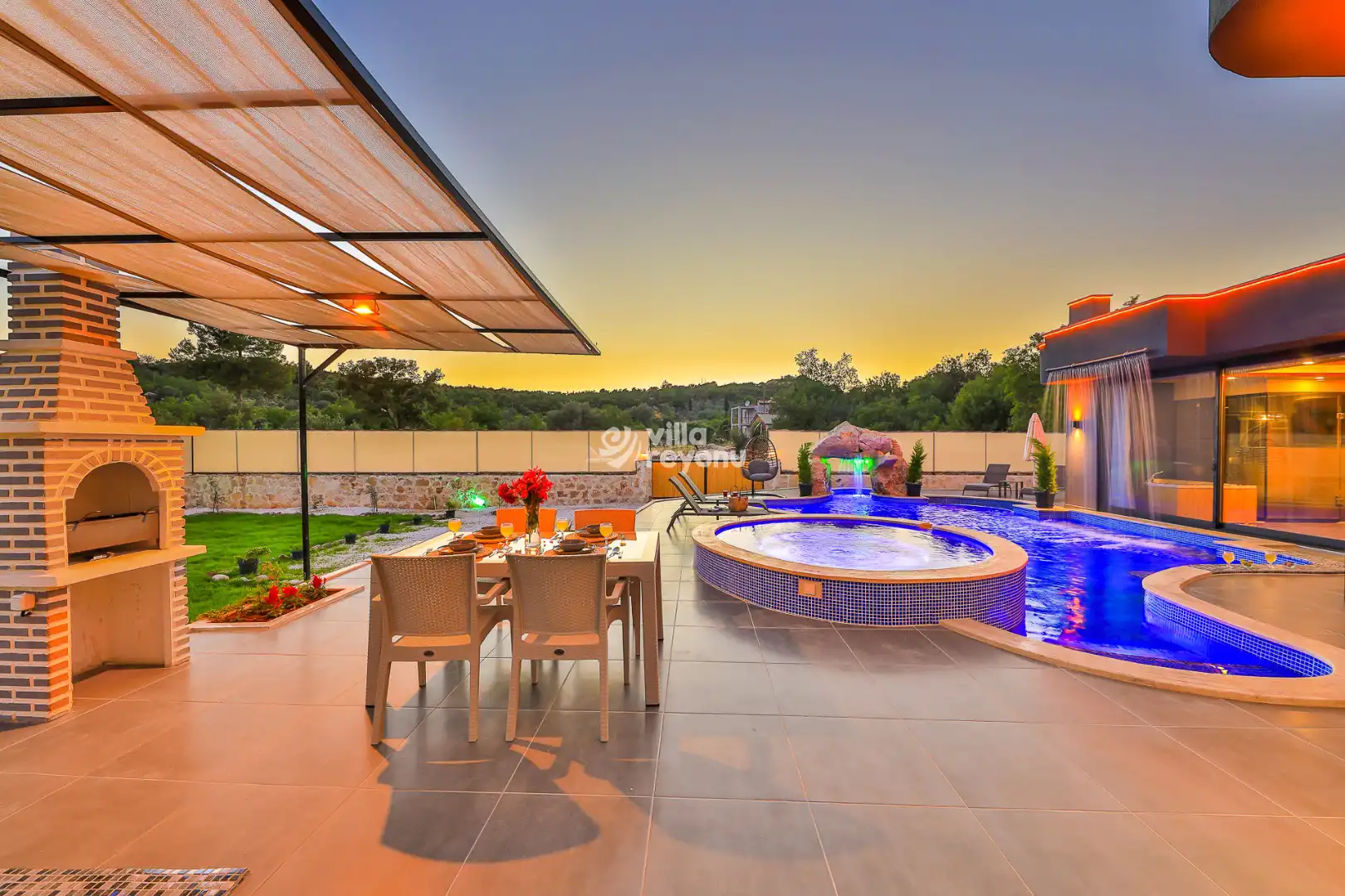 Geniş bahçesinde özel yüzme havuzu, çocuk havuzu, şezlonglar, yemek alanı, barbekü, oturma köşesi, salıncak ve mini çocuk oyun alanı bulunmaktadır. Yatak odalarından birinde jakuzi yer alan villa, sakin ve huzurlu bir tatil arayan misafirler için şehir kalabalığından uzak keyifli bir konaklama sunar.