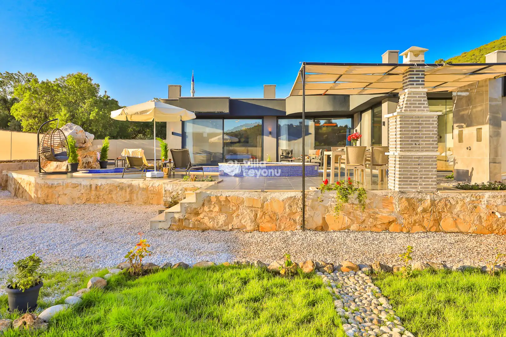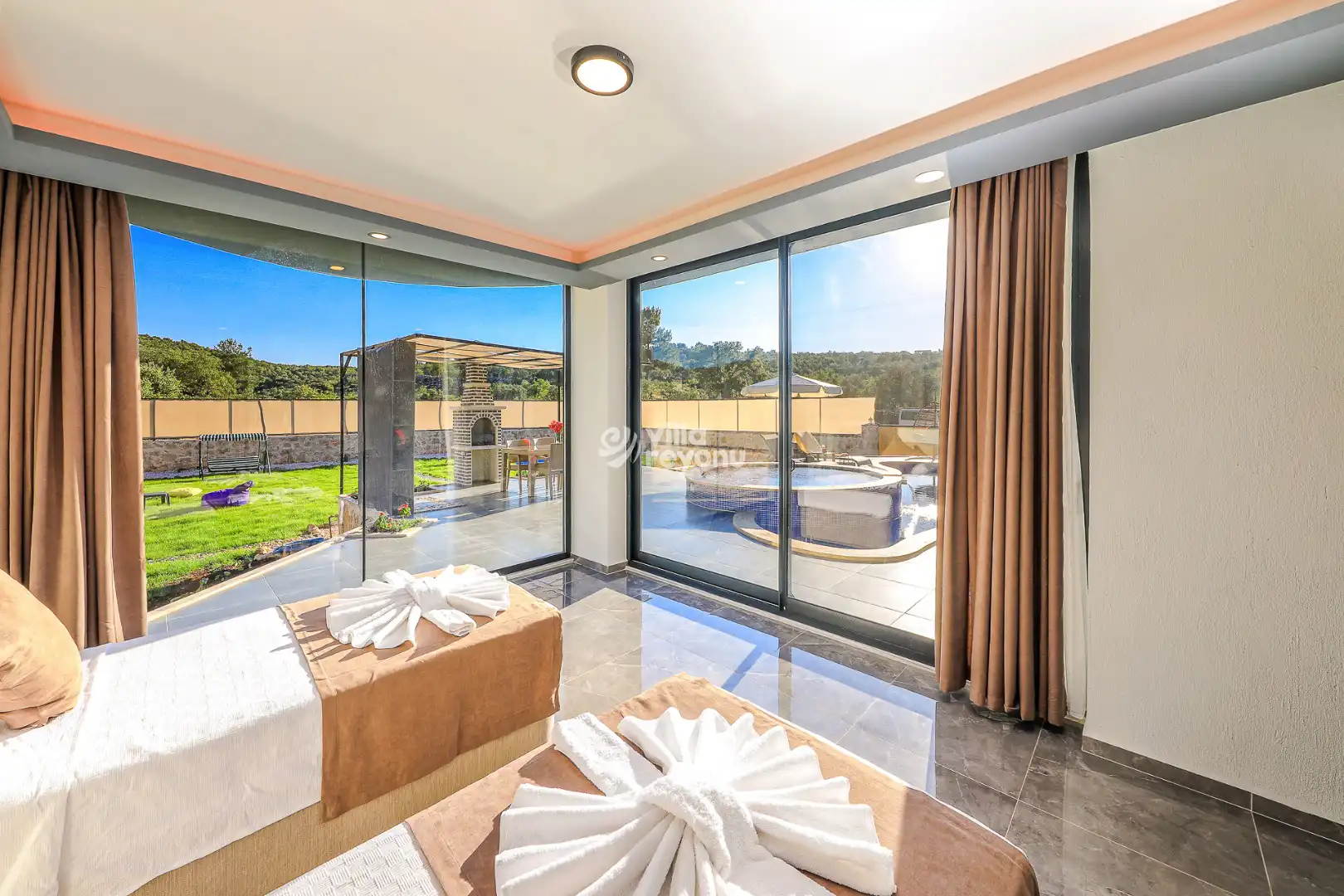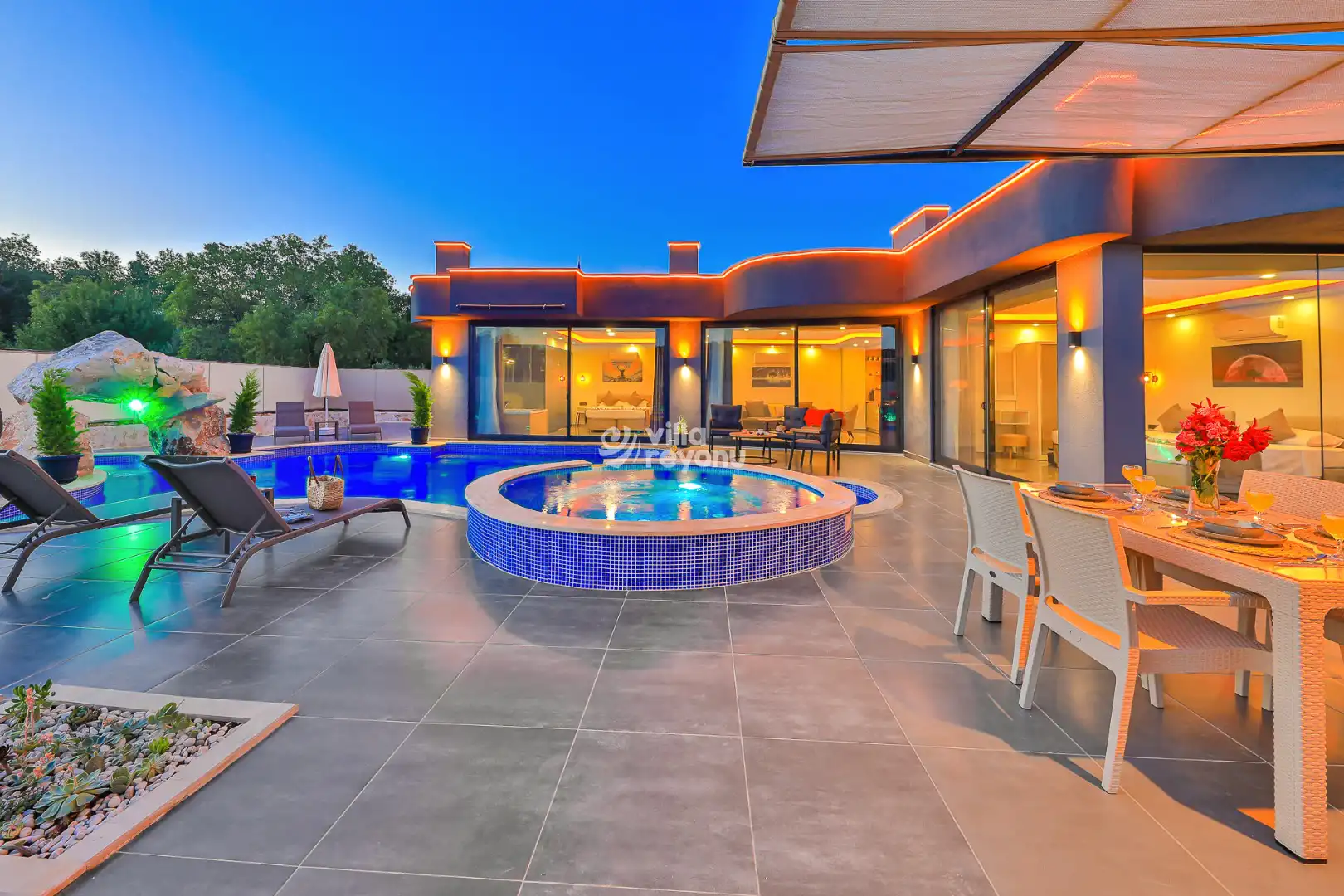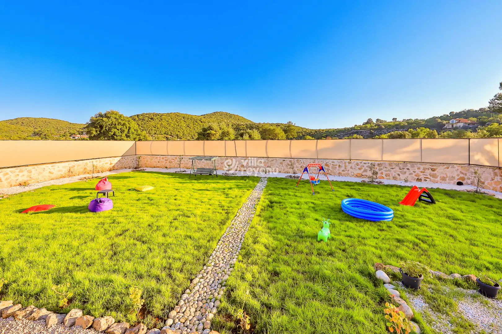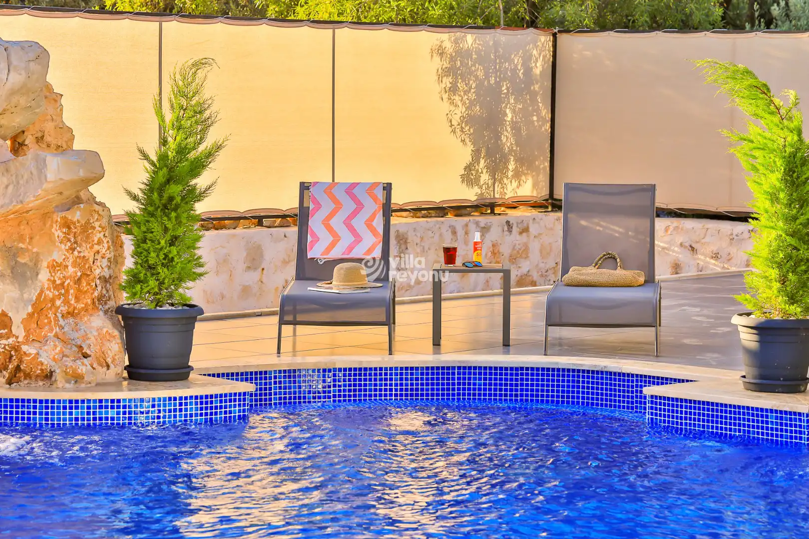 Geniş bahçesinde özel yüzme havuzu, çocuk havuzu, şezlonglar, yemek alanı, barbekü, oturma köşesi, salıncak ve mini çocuk oyun alanı bulunmaktadır. Yatak odalarından birinde jakuzi yer alan villa, sakin ve huzurlu bir tatil arayan misafirler için şehir kalabalığından uzak keyifli bir konaklama sunar.