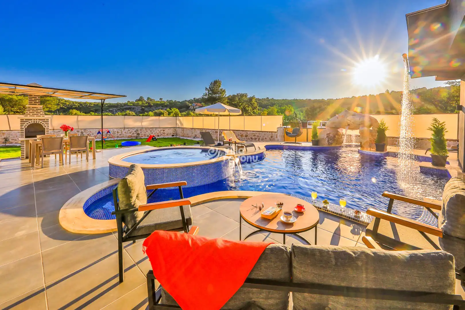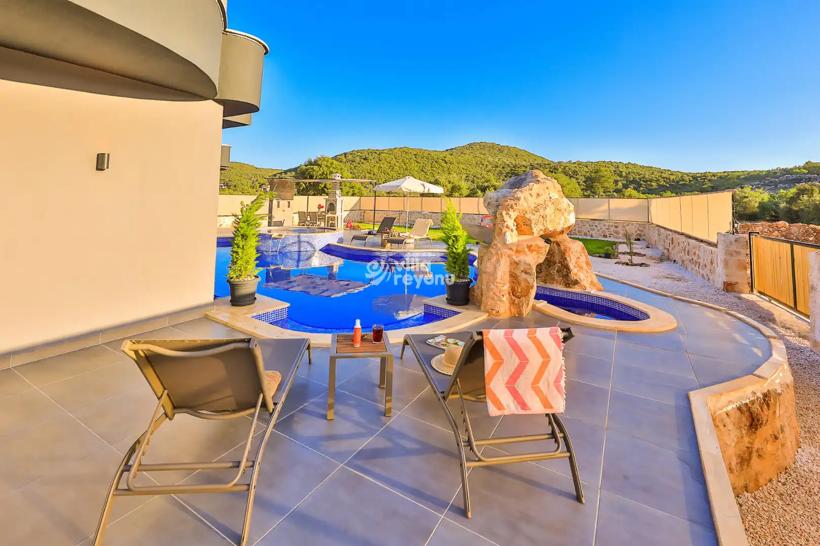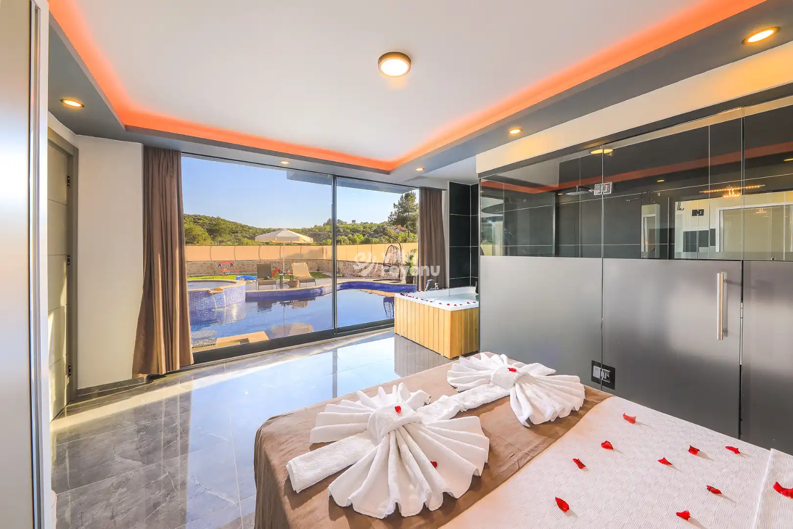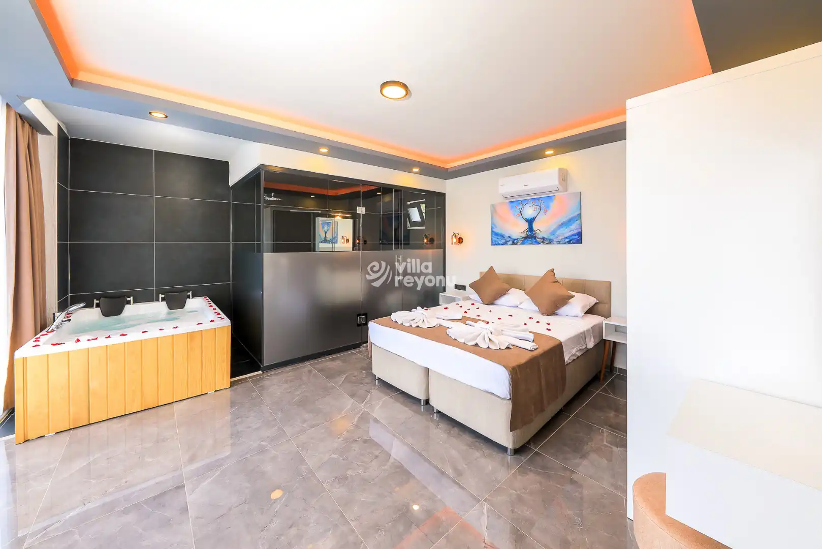 Geniş bahçesinde özel yüzme havuzu, çocuk havuzu, şezlonglar, yemek alanı, barbekü, oturma köşesi, salıncak ve mini çocuk oyun alanı bulunmaktadır. Yatak odalarından birinde jakuzi yer alan villa, sakin ve huzurlu bir tatil arayan misafirler için şehir kalabalığından uzak keyifli bir konaklama sunar.
