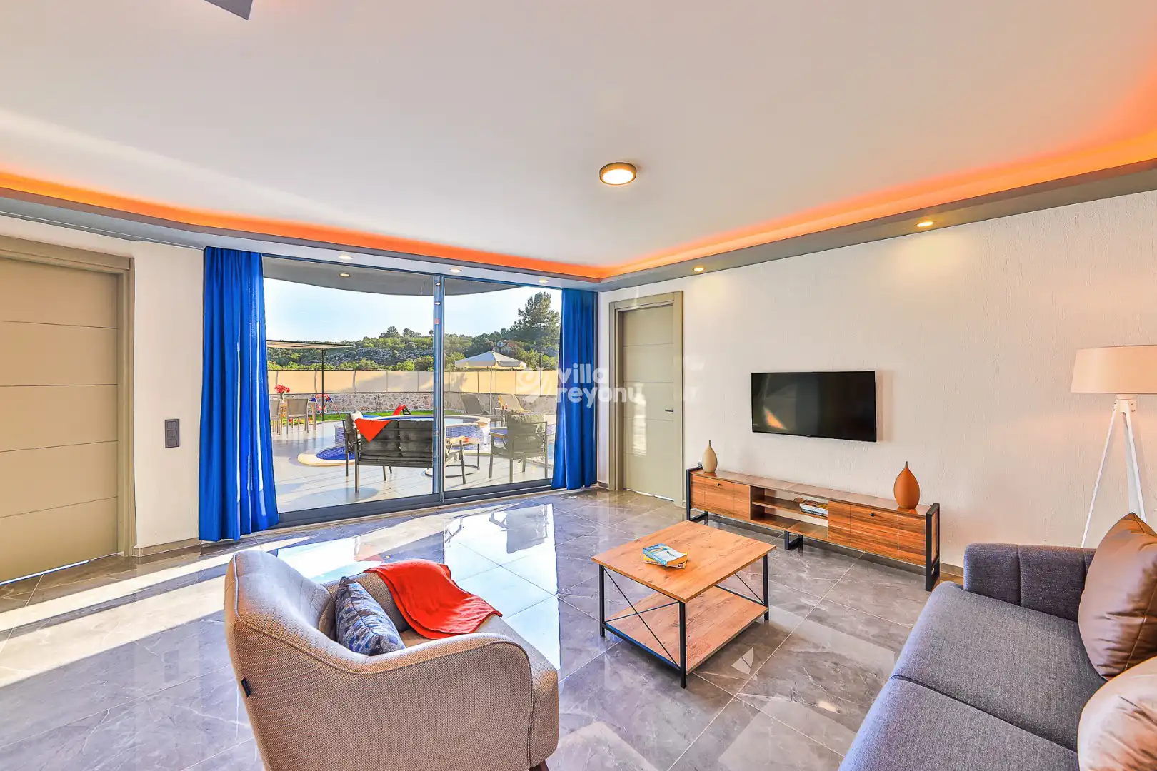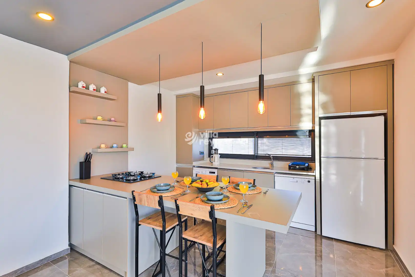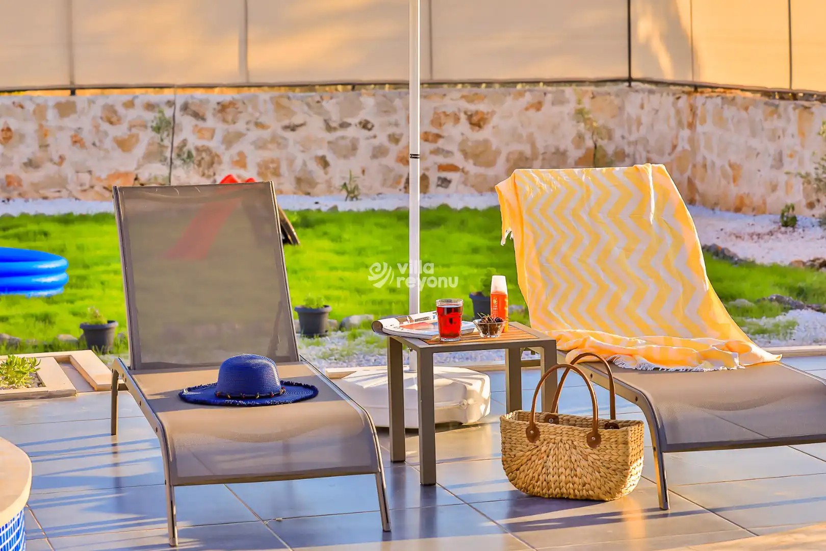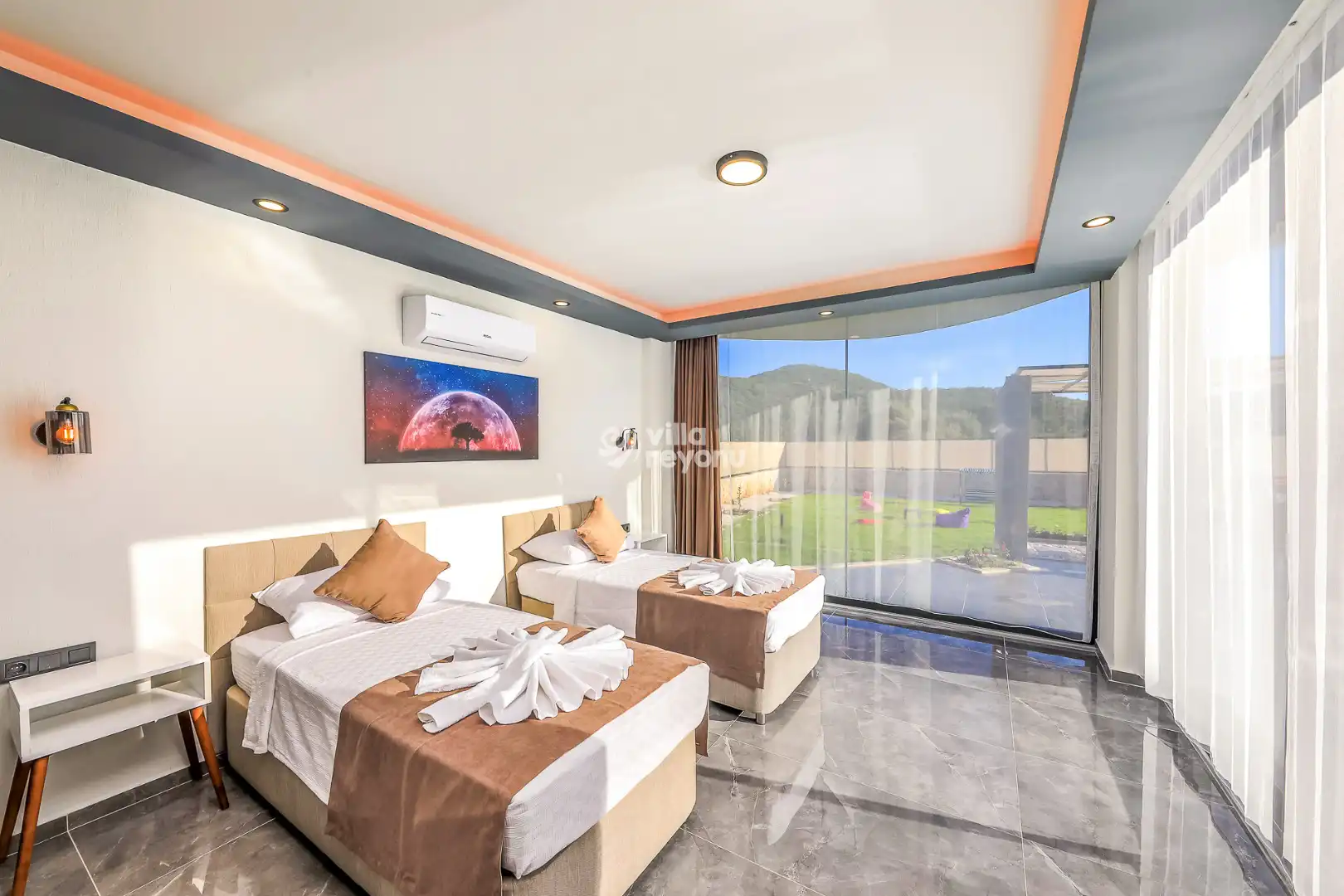 Geniş bahçesinde özel yüzme havuzu, çocuk havuzu, şezlonglar, yemek alanı, barbekü, oturma köşesi, salıncak ve mini çocuk oyun alanı bulunmaktadır. Yatak odalarından birinde jakuzi yer alan villa, sakin ve huzurlu bir tatil arayan misafirler için şehir kalabalığından uzak keyifli bir konaklama sunar.