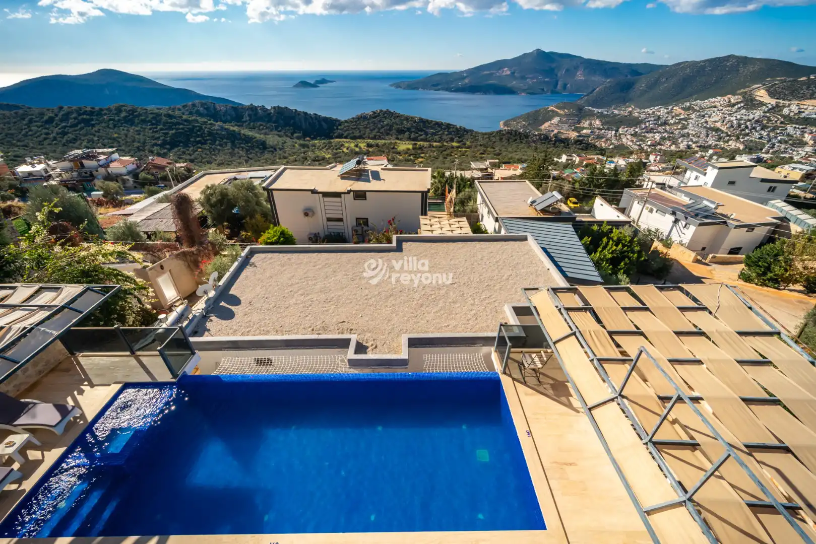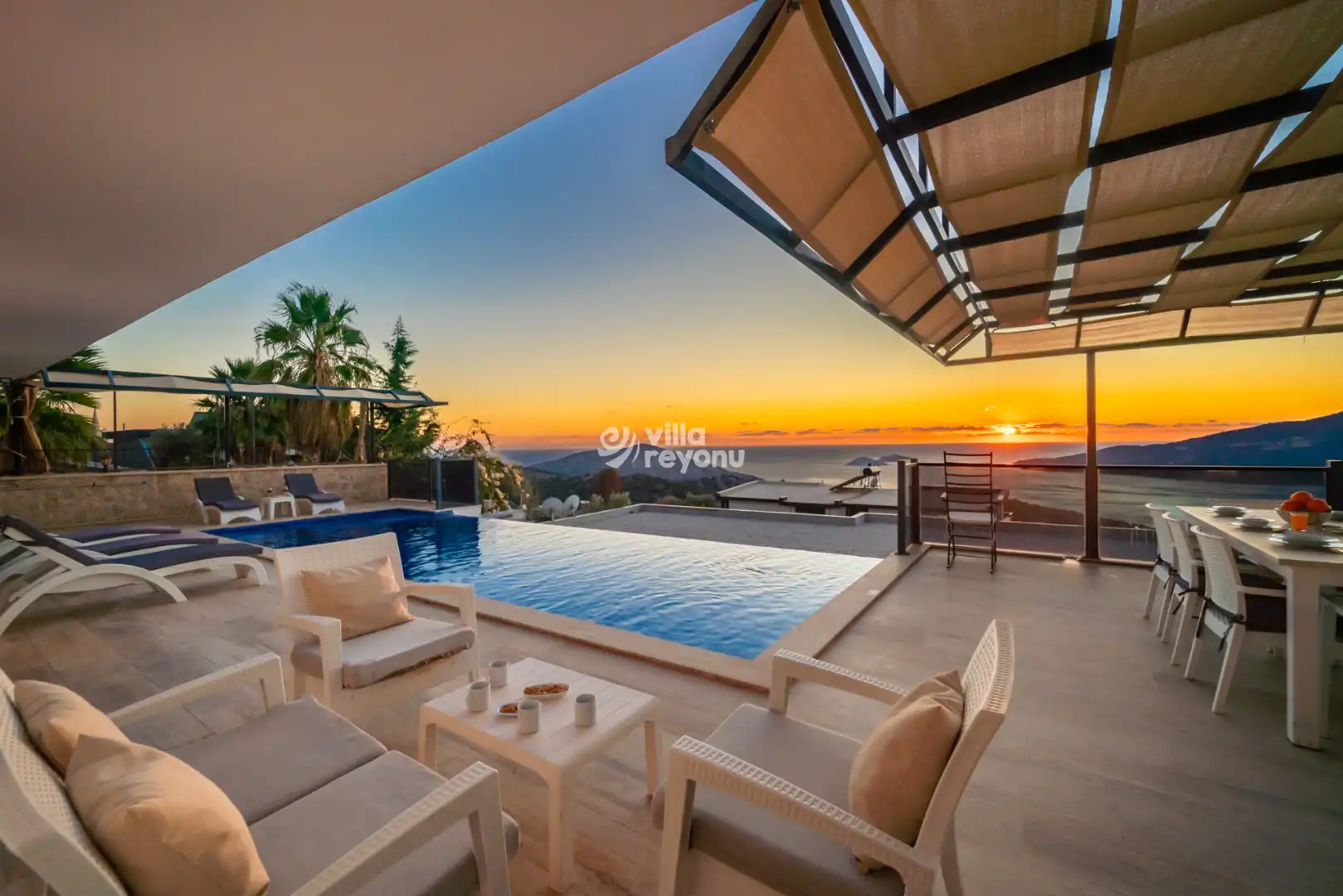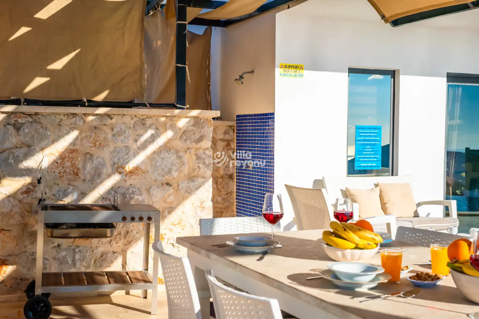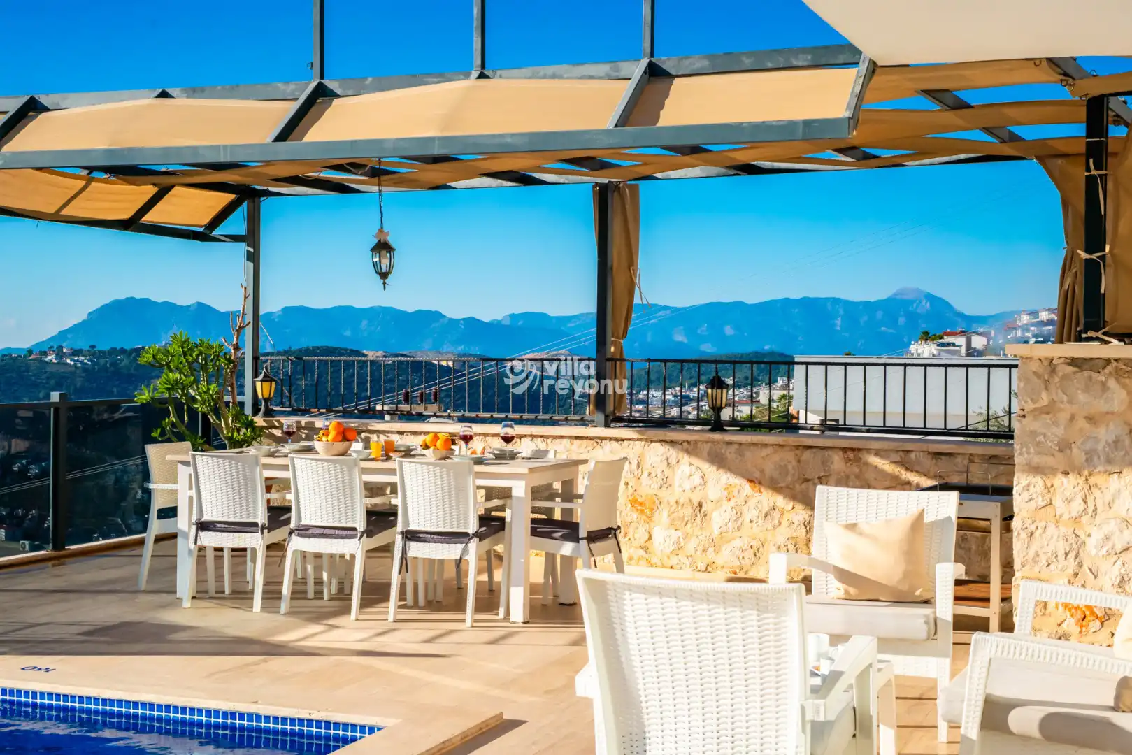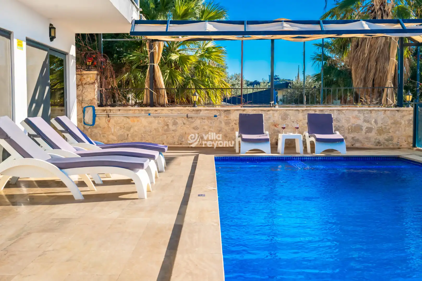 Korunaklı havuz alanında; şezlonglar, oturma grubu, yemek masası ve taşınabilir barbekü bulunmakta olup, sevdiklerinizle birlikte rahat ve keyifli zamanlar geçirmeniz için ideal bir ortam sunar.
