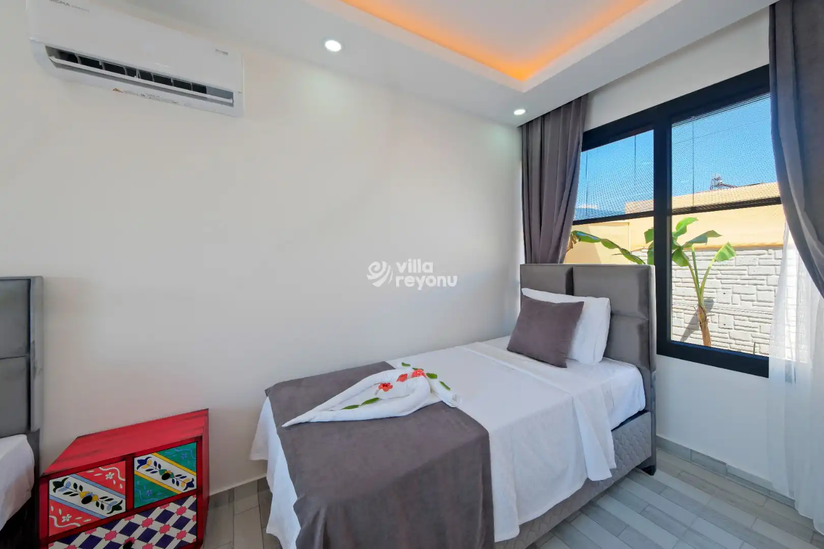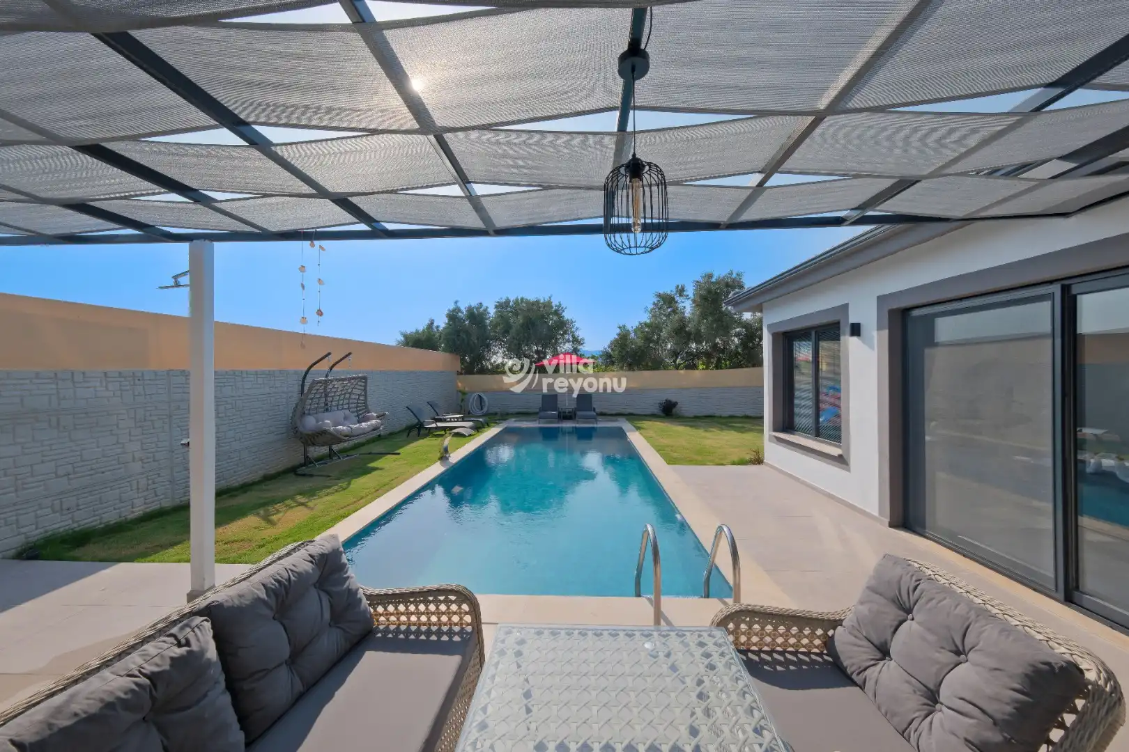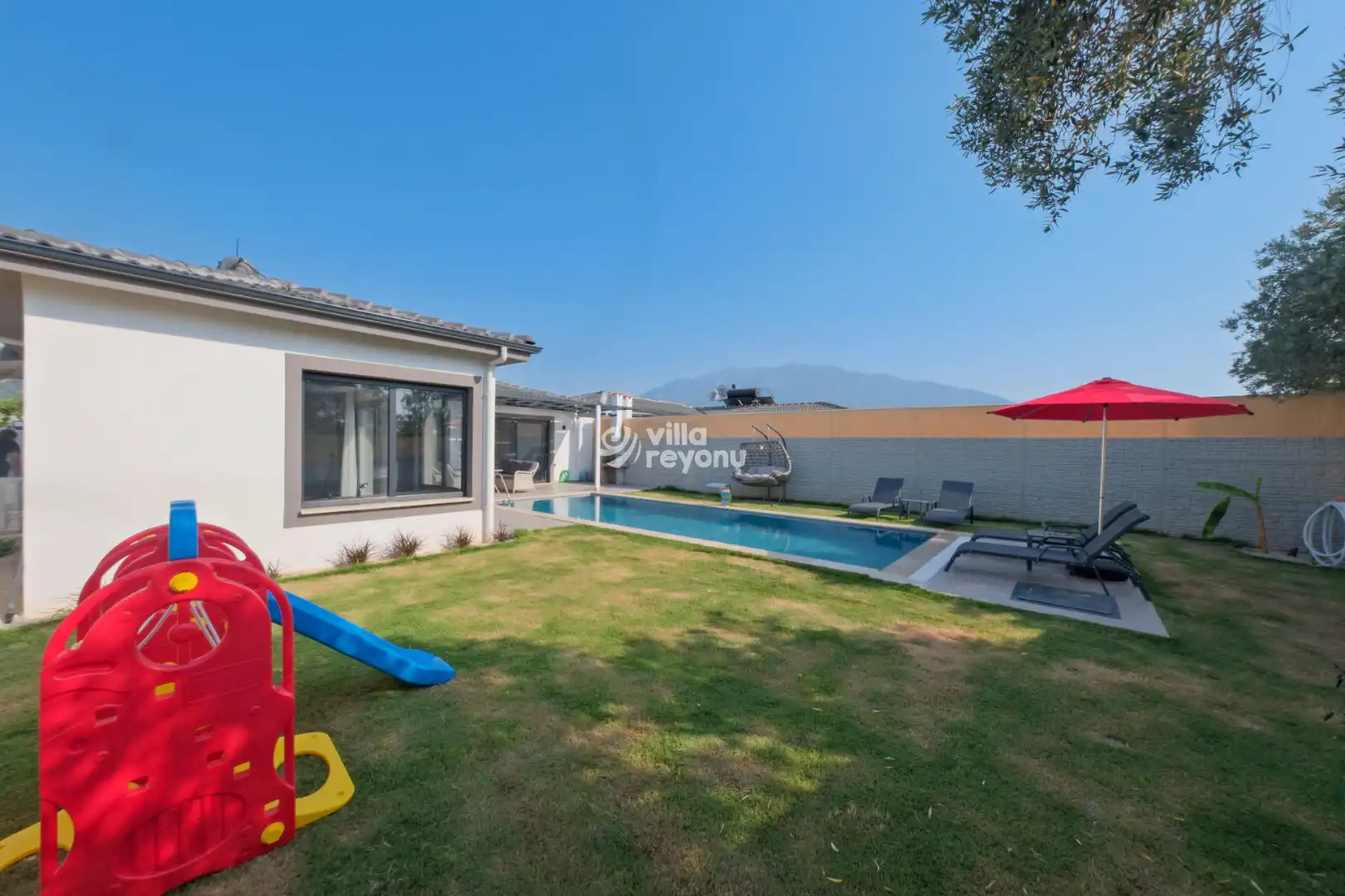 Fethiye’nin Çamköy (Eldirek) bölgesinde yer alan villamız, 2 yatak odasıyla 5 kişiye kadar konaklama imkânı sunan modern ve konforlu bir tatil seçeneğidir. Korunaklı havuz alanı sayesinde gizliliğe önem veren çekirdek aileler ve balayı çiftleri için ideal bir konaklama ortamı sağlar.Geniş bahçe ve havuz bölümünde konforlu oturma grubu, şezlonglar ve çocuklar için özel oyun alanı bulunmaktadır. Bu sayede hem yetişkinler hem de çocuklar için keyifli ve güvenli bir dinlenme alanı sunulmaktadır.Villamızda yer alan her iki yatak odası da ebeveyn banyosuna sahiptir. Ayrıca ana yatak odasında bulunan jakuzi, misafirlerimize ekstra konfor ve rahatlama imkânı sunmaktadır.