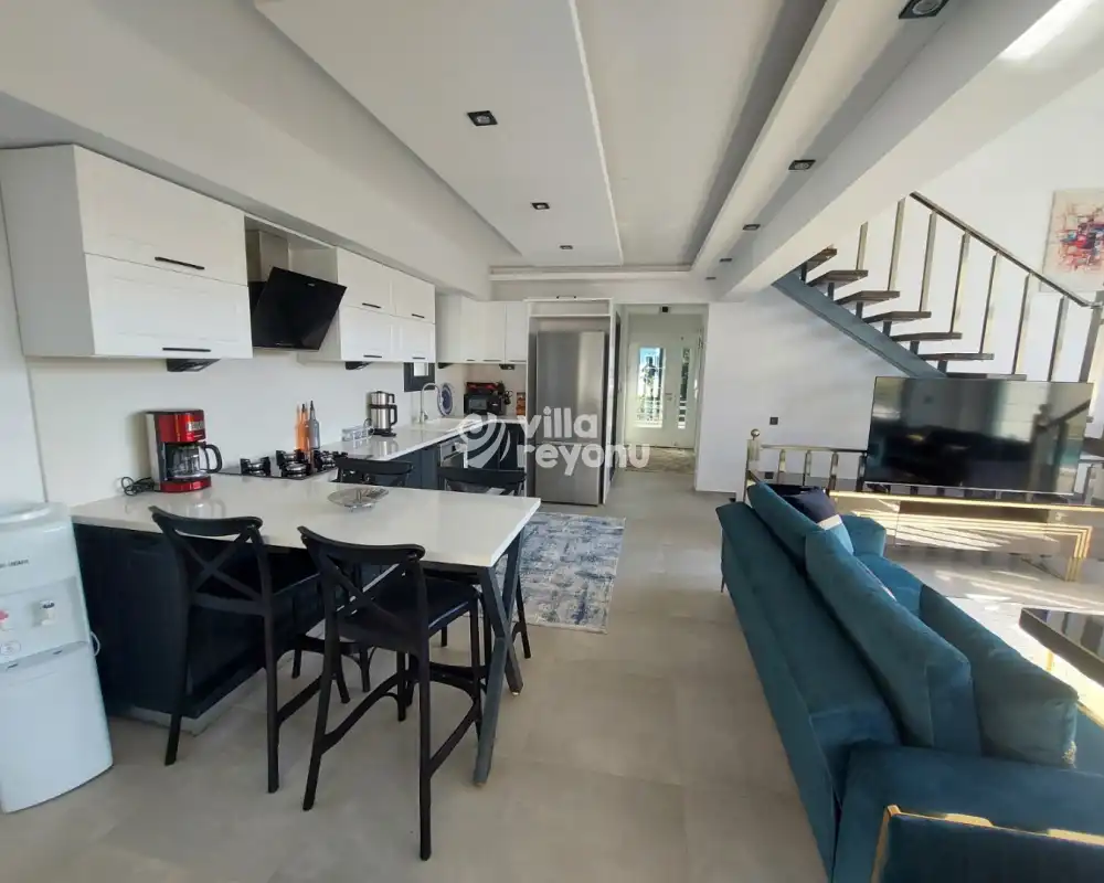Tüm odalarda geniş yatak, şık gardıroplar ve konforlu oturma alanları bulunur. Açık plan Amerikan mutfak, geniş salonlar ve modern banyolar ile evinizde gibi hissedeceksiniz. Her odada klima mevcut olup, villanın tamamı konforunuz düşünülerek döşenmiştir.