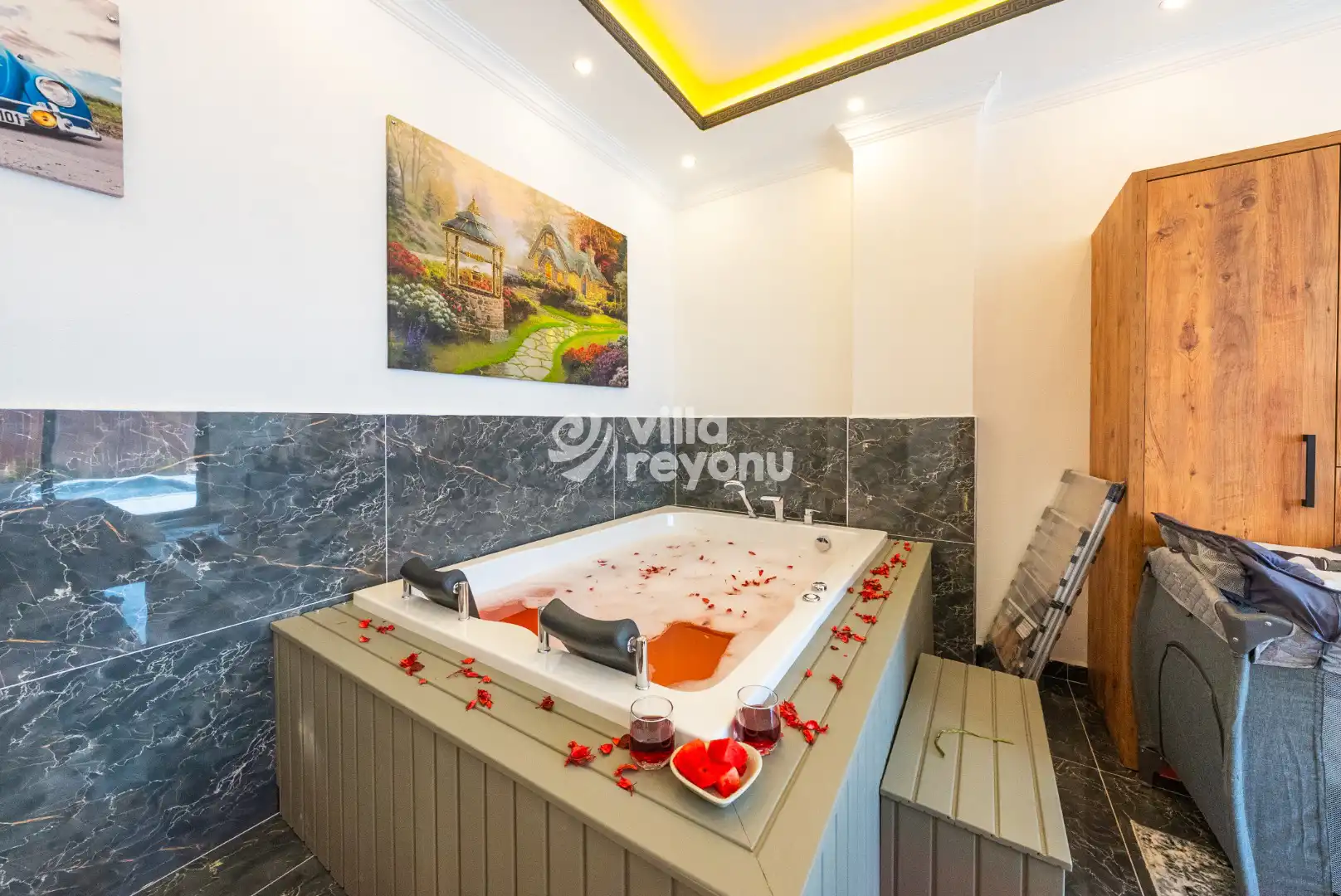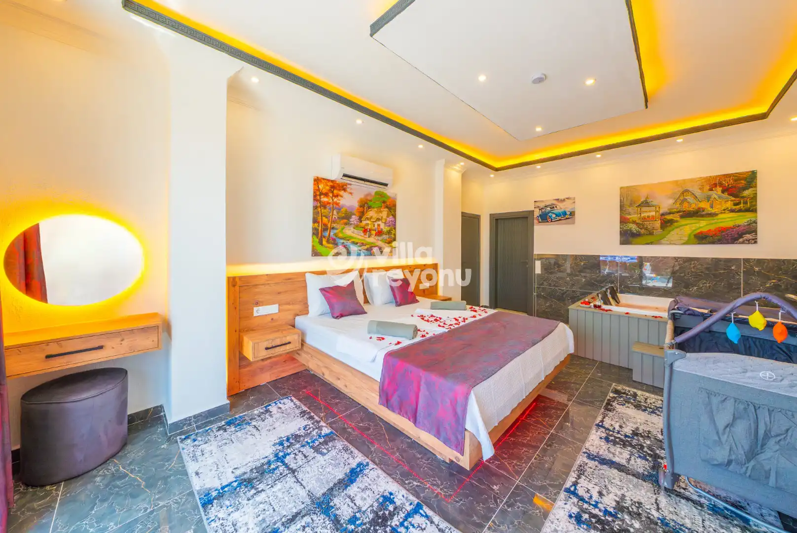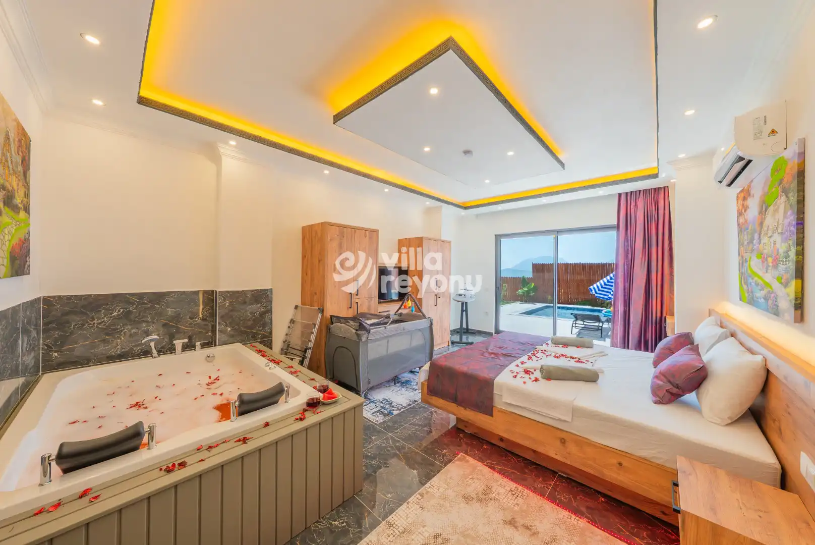 1 adet çift kişilik yatak, park beşik, klima, jakuzi, TV, elbise dolabı, komodin, makyaj masası, ütü ve ütü masası ile banyo & WC bulunmaktadır. Havuz terasına doğrudan çıkış mevcuttur.