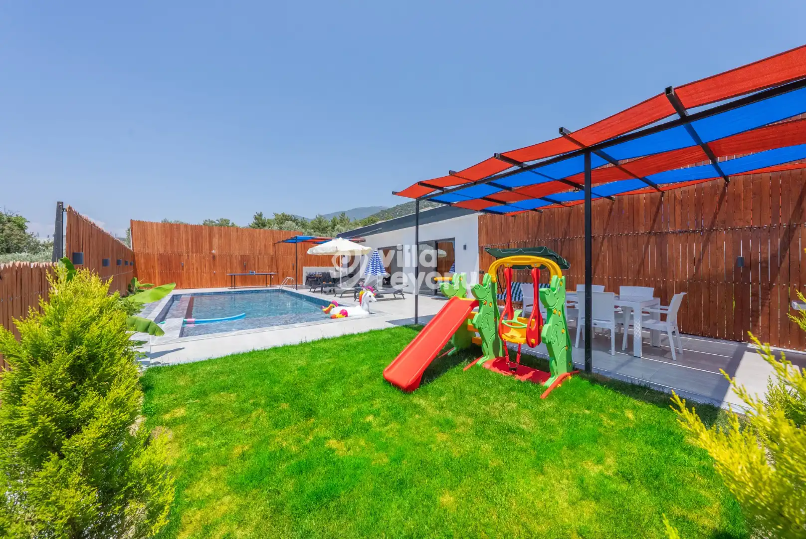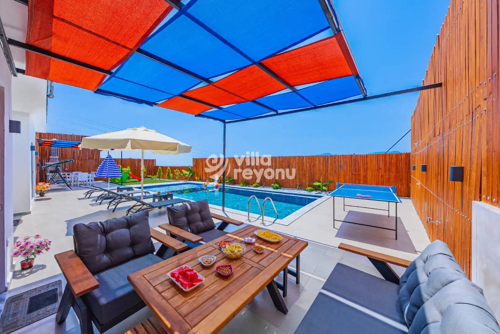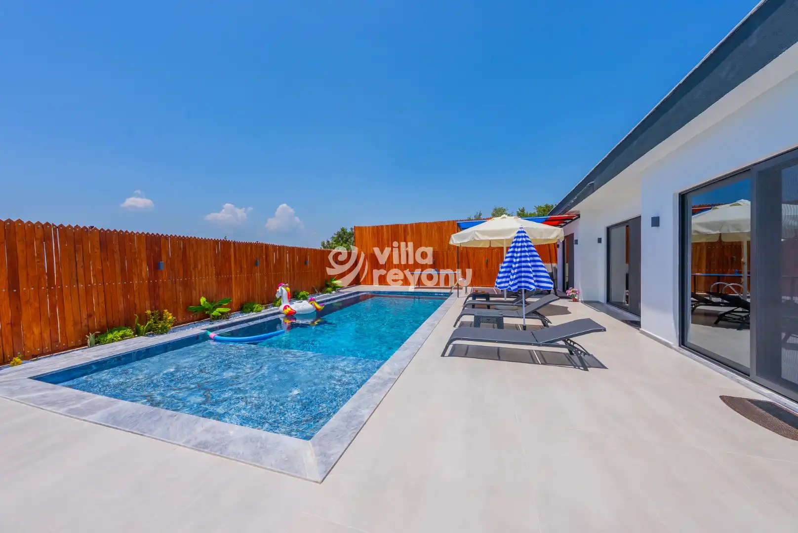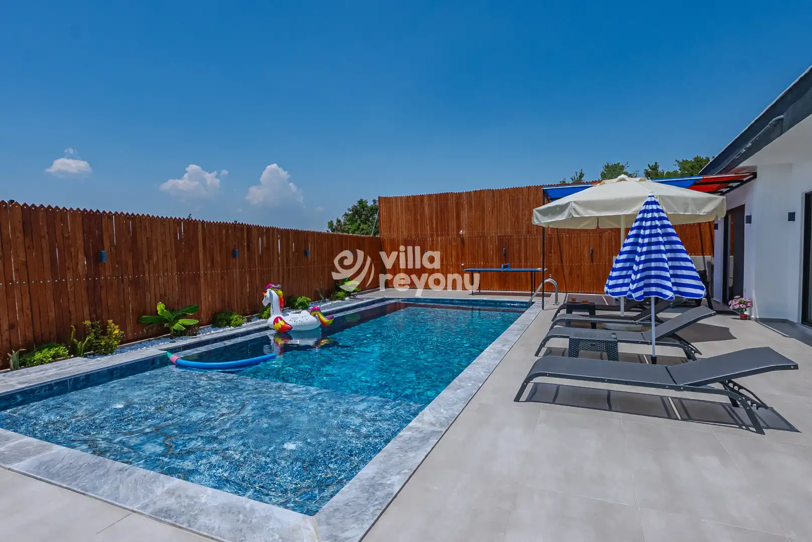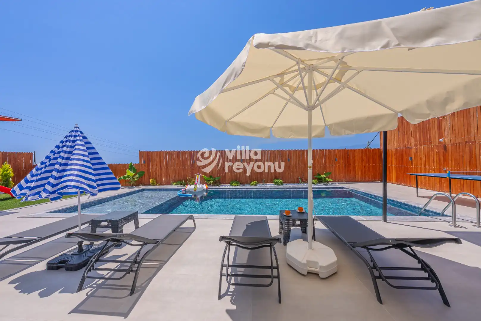 Korunaklı havuz alanı sayesinde dış gözlerden uzakta yüzmenin tadını çıkarabilir, bahçedeki oturma gruplarında dilediğiniz gibi keyif yapabilirsiniz. Kendi içinde her ihtiyacı karşılayan bu villa, misafirlerine bağımsız bir yaşam alanı sunar. Bu da tatilinizi dilediğiniz gibi planlamanıza olanak verir.