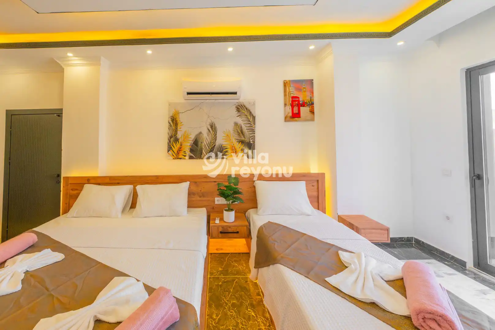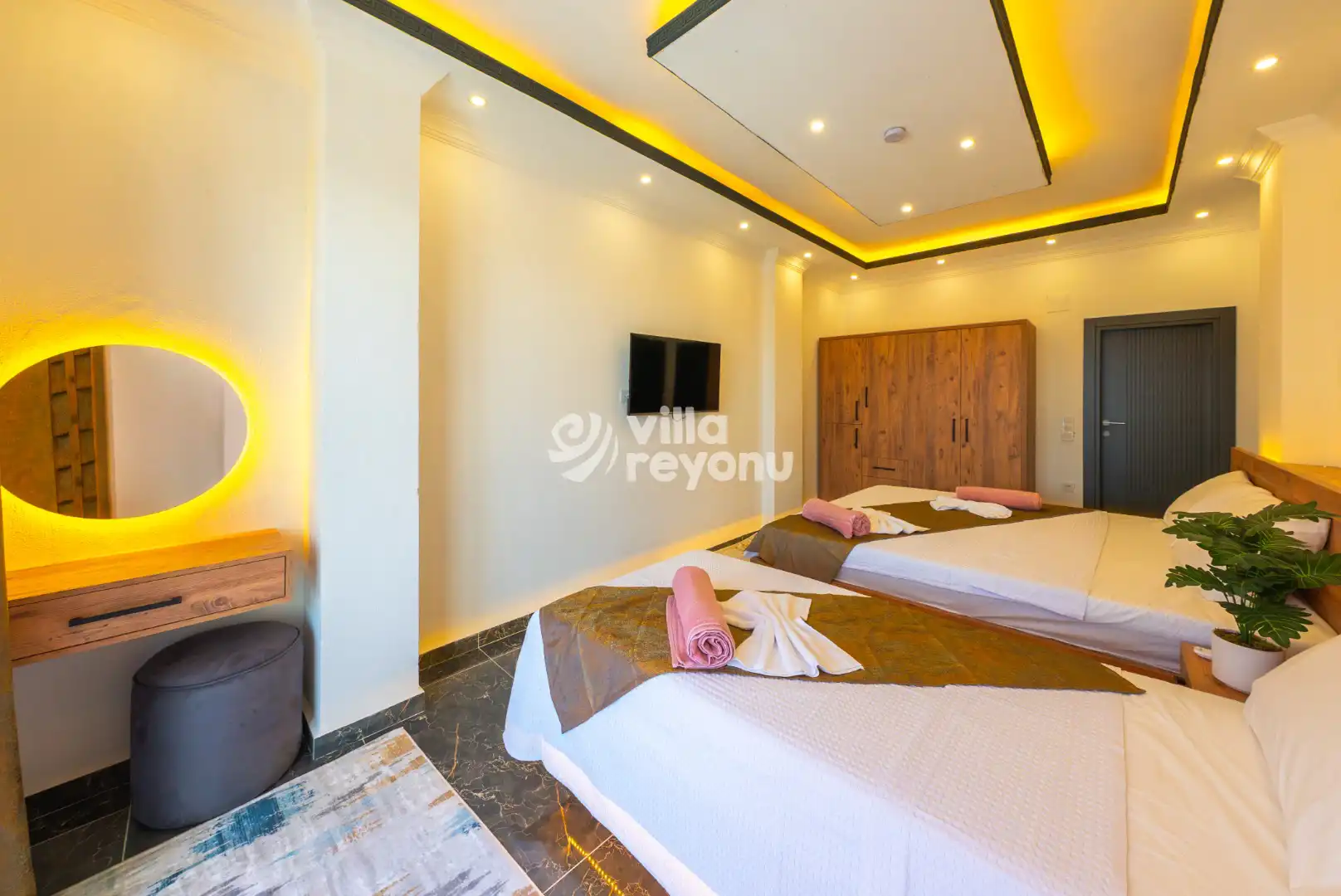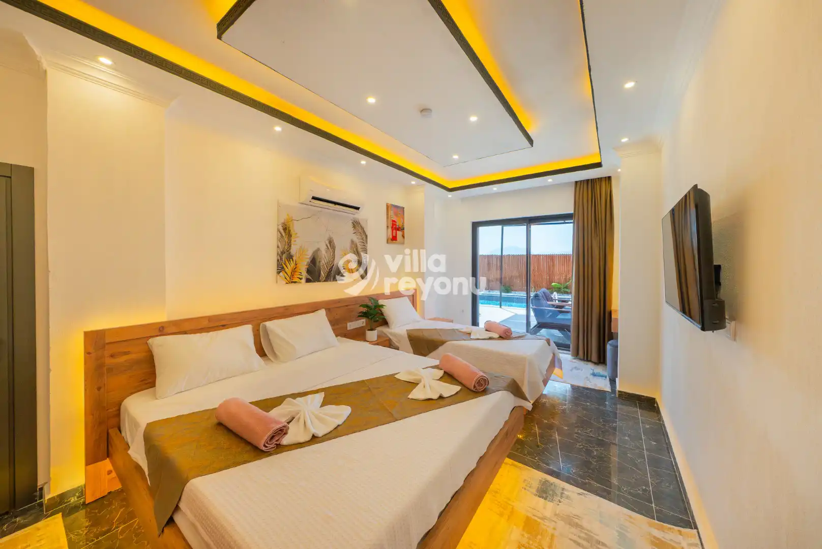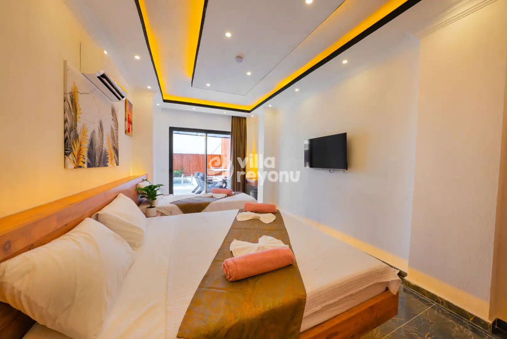 İki ayrı yatak odası, geniş ve ferah yapılarıyla dikkat çeker. Birinci yatak odasında çift kişilik yatak, jakuzi, klima ve doğrudan havuz terasına geçiş imkanı bulunur. İkinci yatak odasında ise bir çift kişilik ve bir tek kişilik yatak yer alır. Her iki odada da TV, klima ve özel banyo yer almaktadır. Bu da villa içinde herkesin kendi özel alanına sahip olmasını sağlar.
