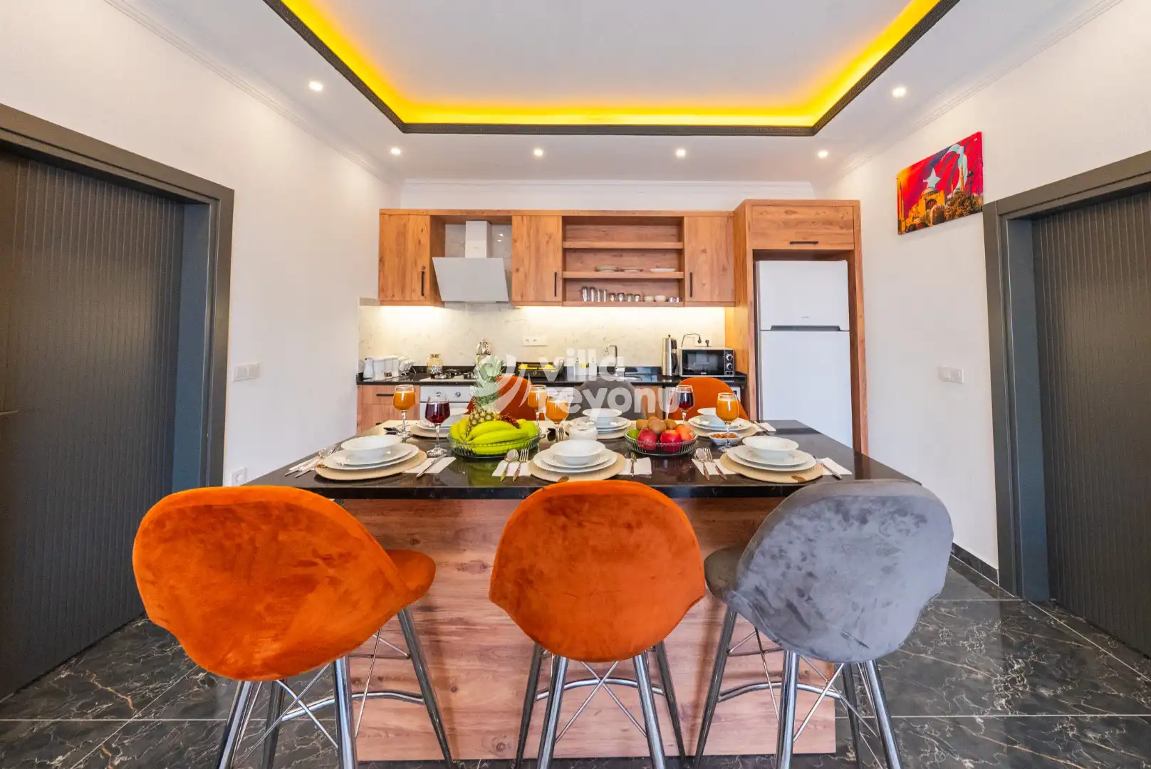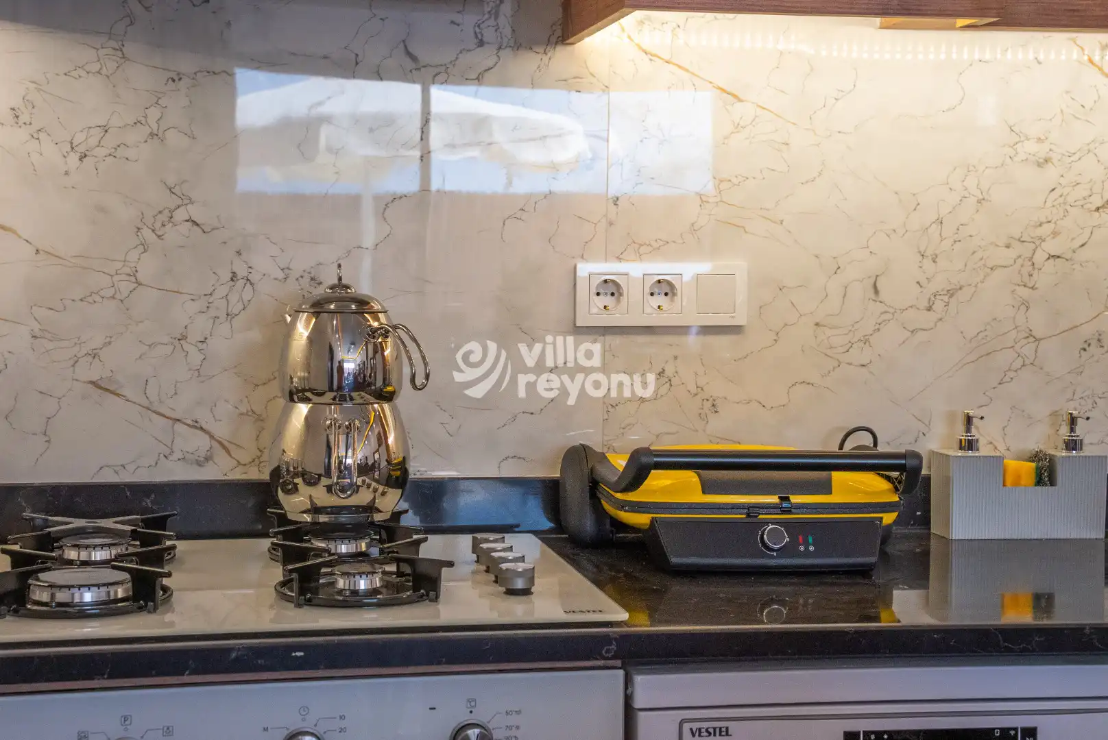 Evde park beşikten ütü masasına kadar birçok detay düşünülmüştür. Salon, mutfak ve bahçe arasında geçişler oldukça rahattır. Mutfakta yemek yapabileceğiniz tüm ekipmanlar mevcuttur. Kendi yemeğinizi yapıp bahçede servis etmek için hiçbir engeliniz yok.