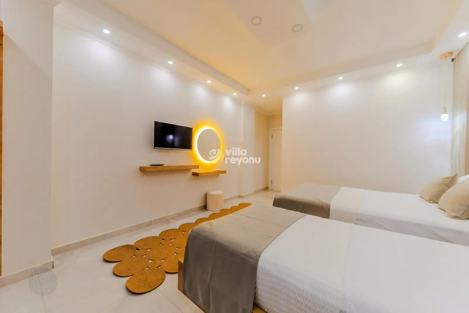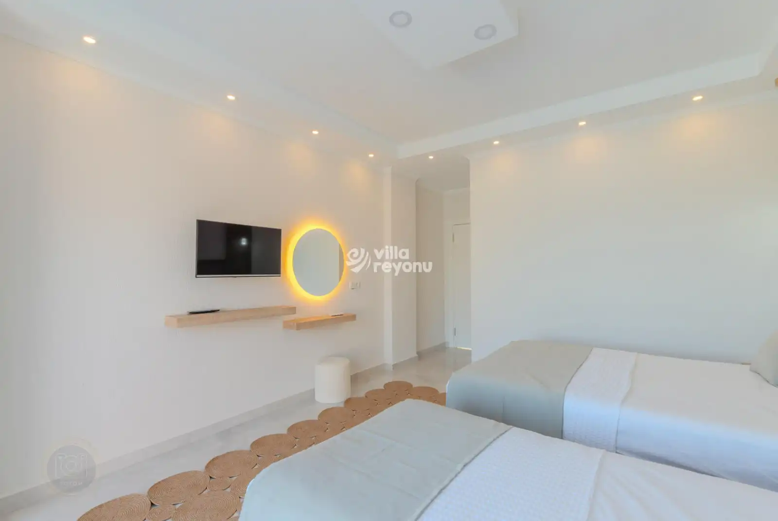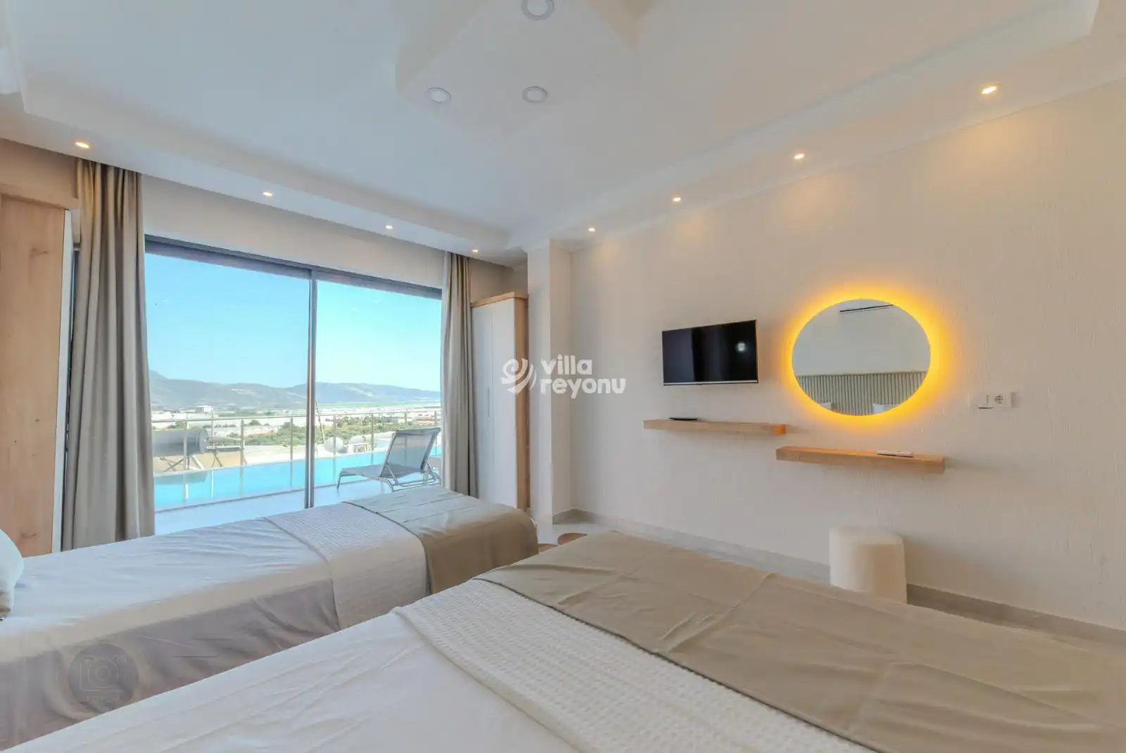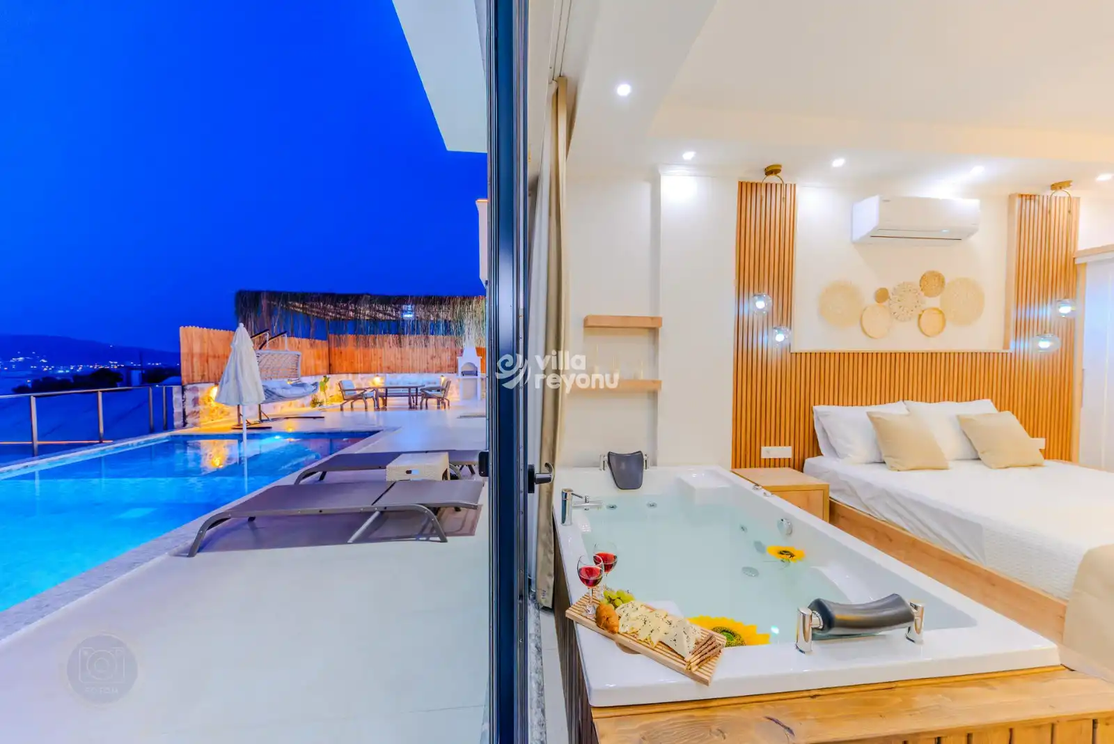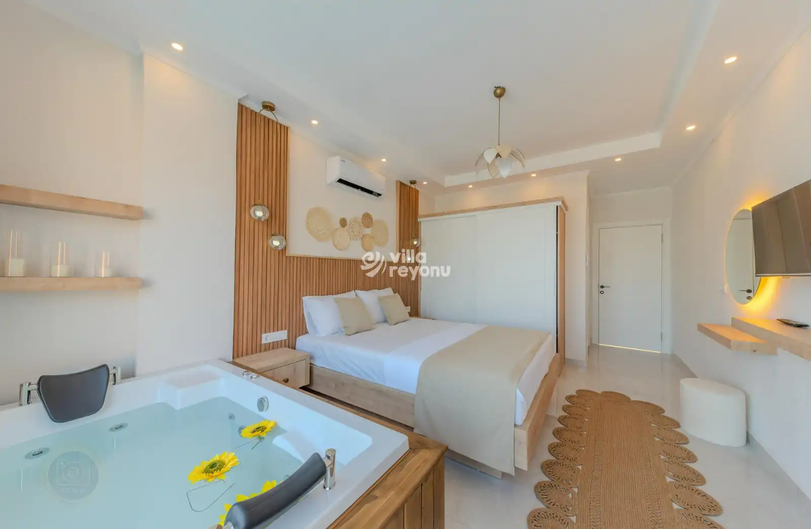 Modern ve zarif iç tasarımıyla dikkat çeken villada, iki adet çift kişilik yatak bulunan yatak odası ve üç banyo mevcuttur. Jakuzi ve yüksek kaliteli donanımlar, konaklamanızı daha da özel ve rahat hale getirir.