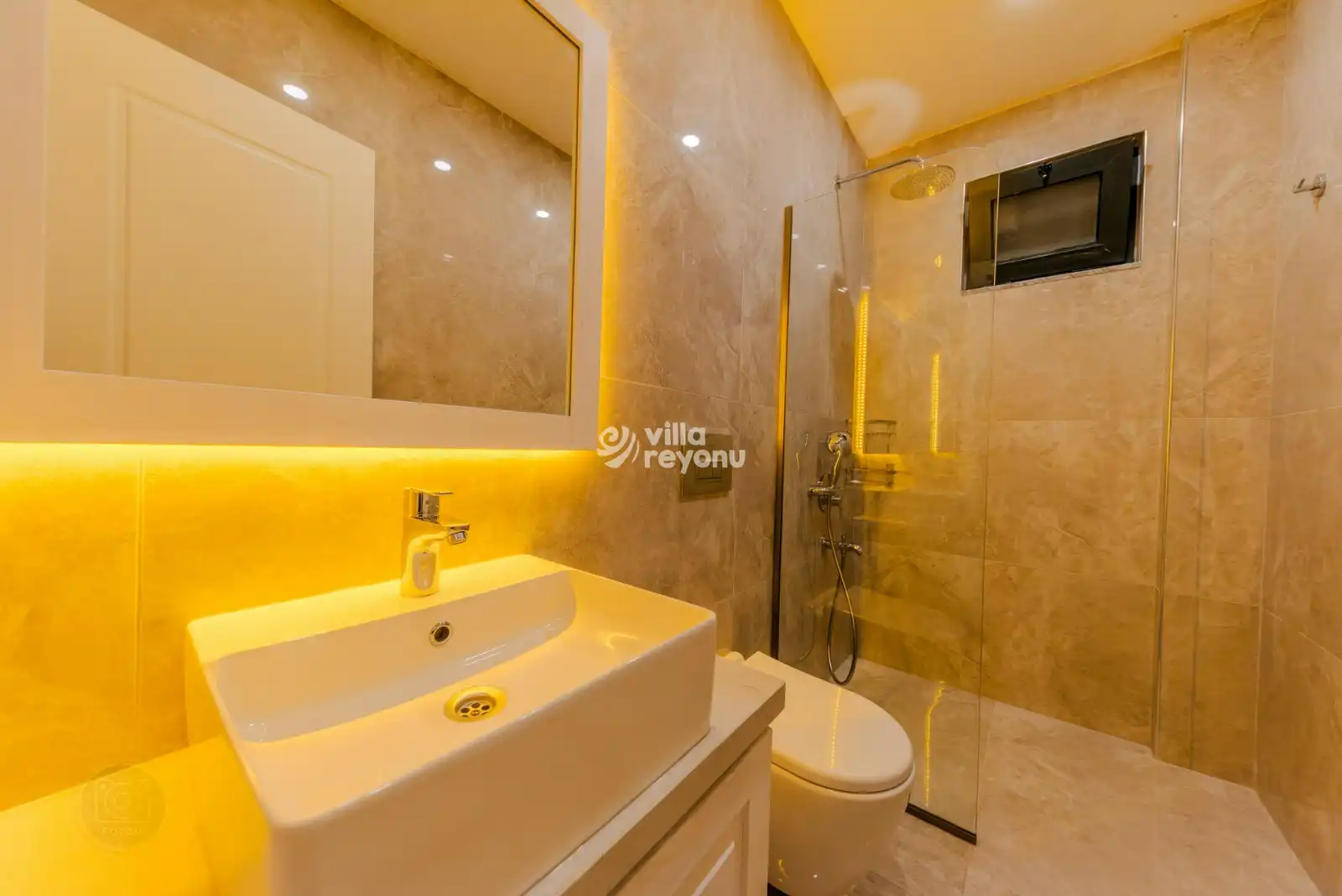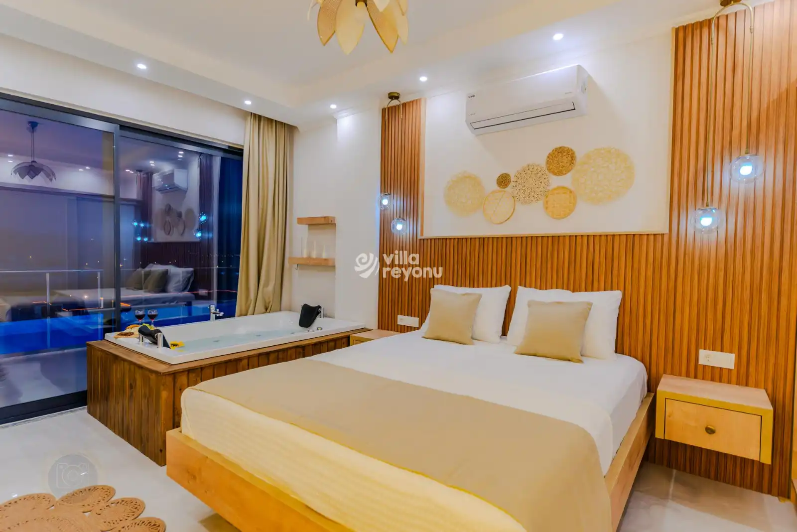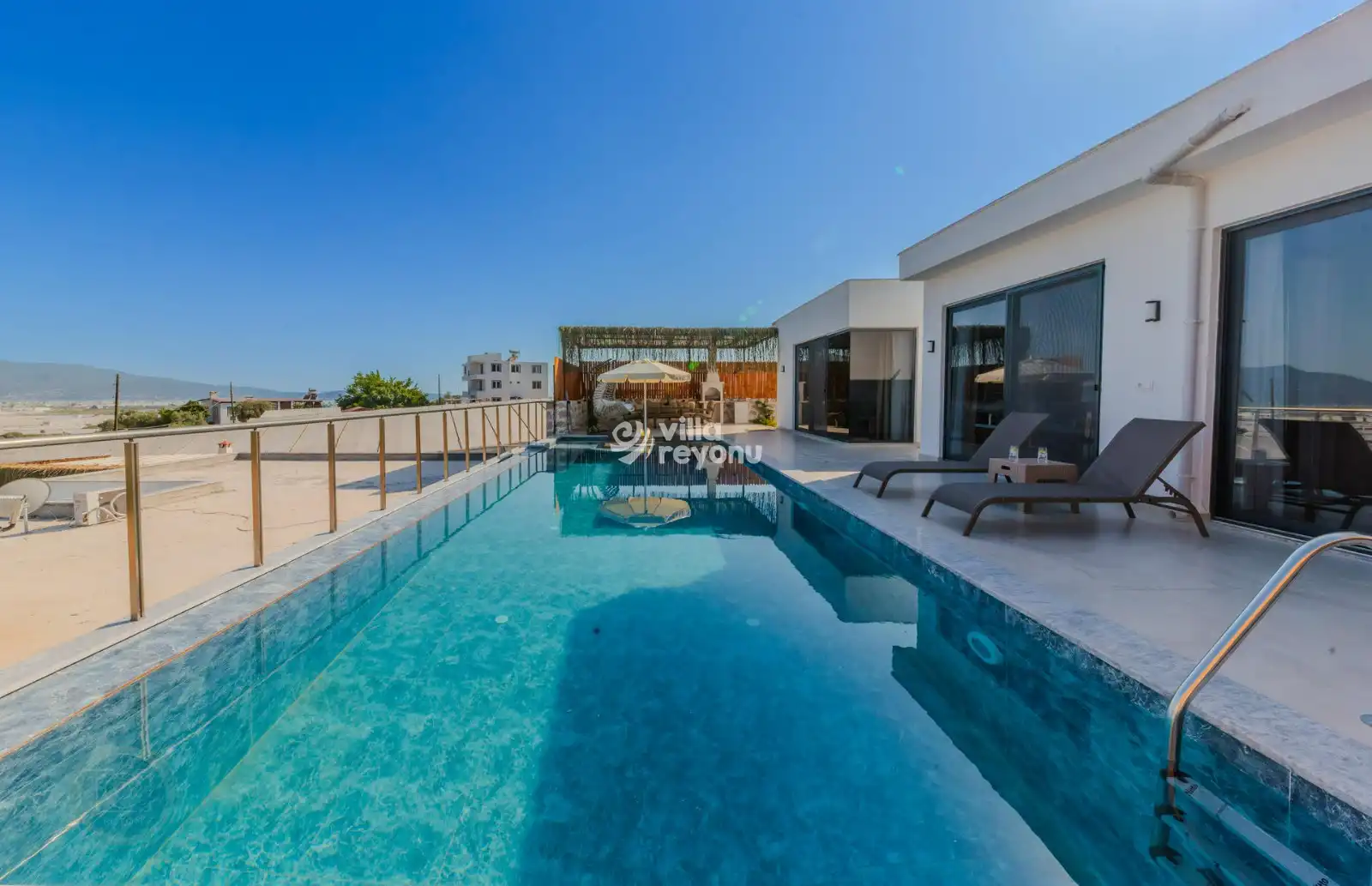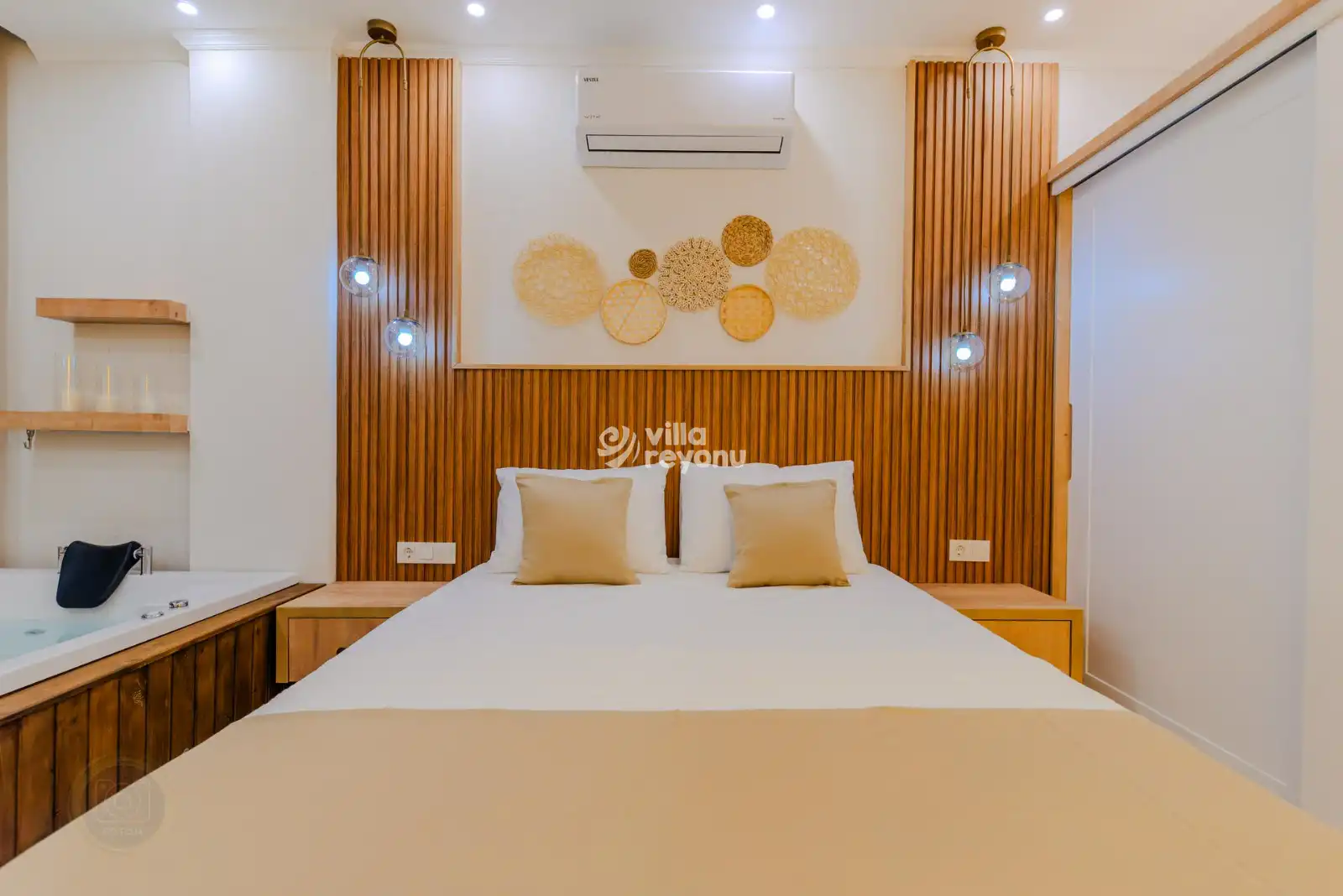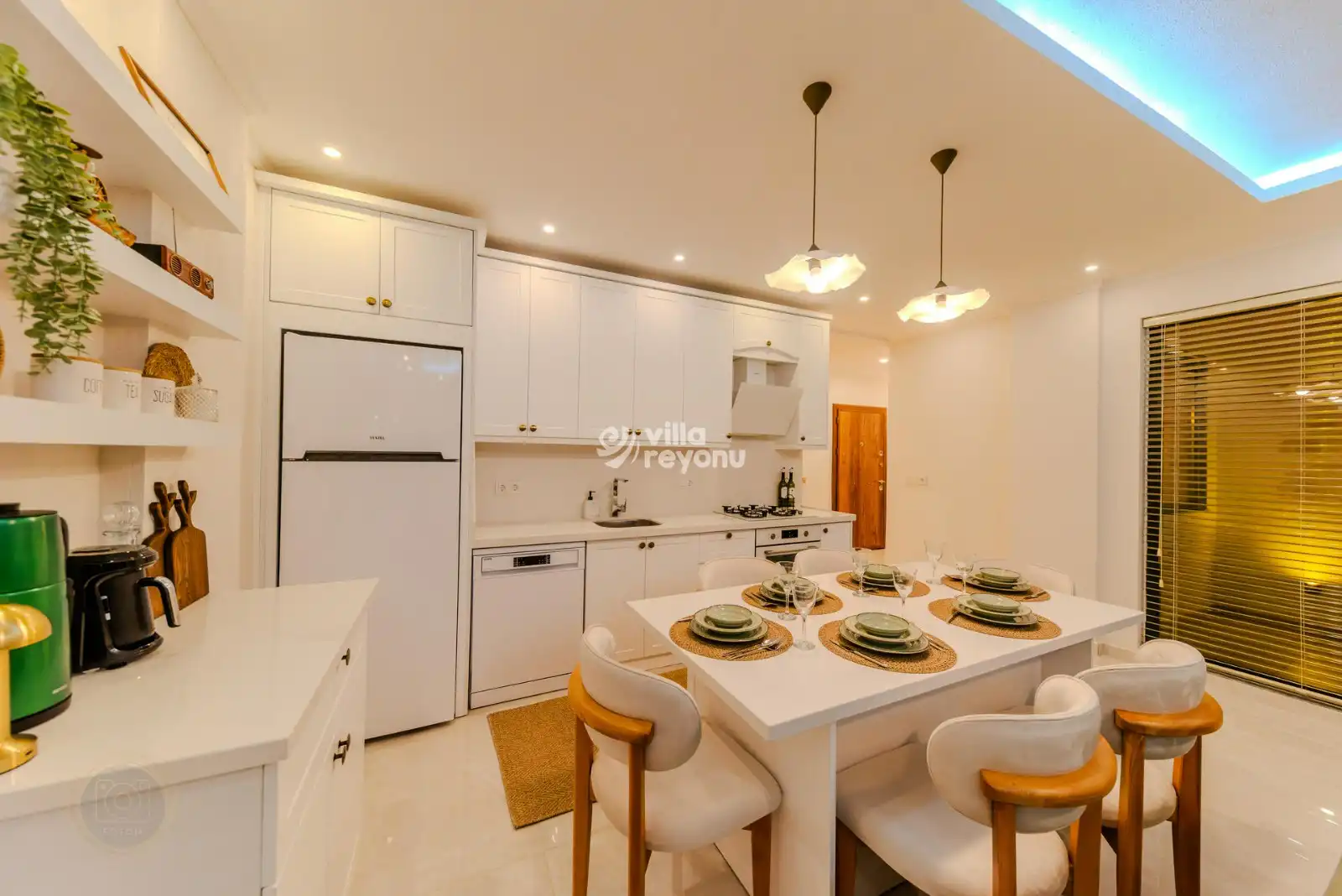 Modern ve zarif iç tasarımıyla dikkat çeken villada, iki adet çift kişilik yatak bulunan yatak odası ve üç banyo mevcuttur. Jakuzi ve yüksek kaliteli donanımlar, konaklamanızı daha da özel ve rahat hale getirir.