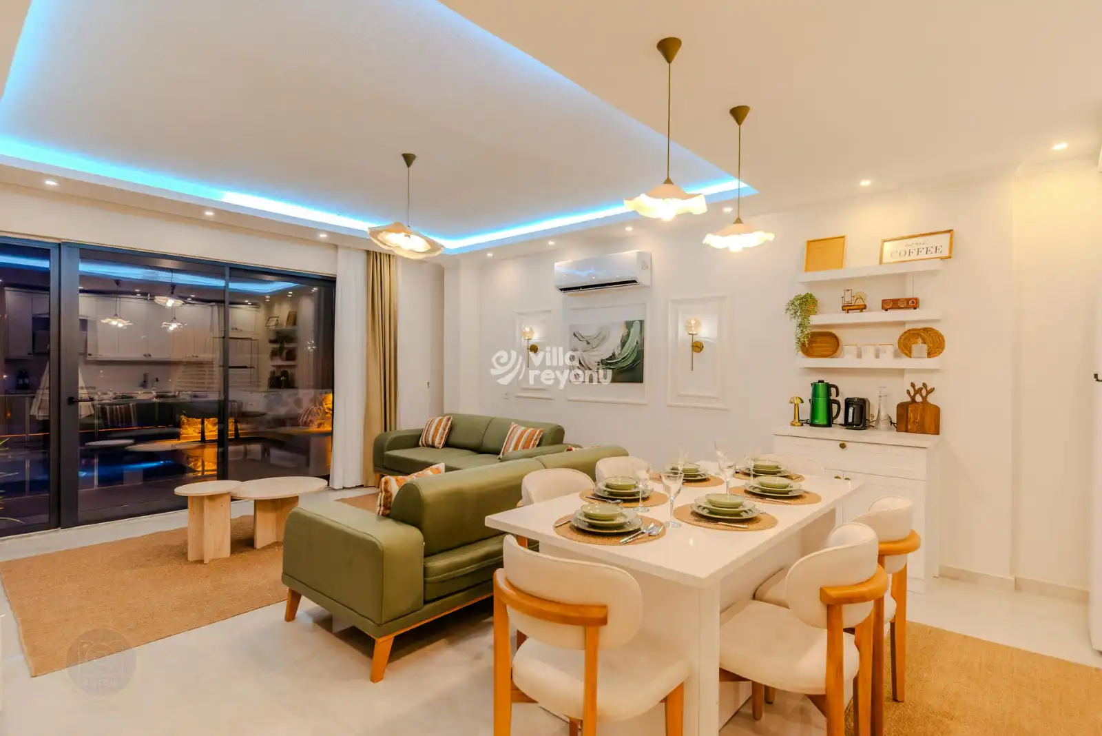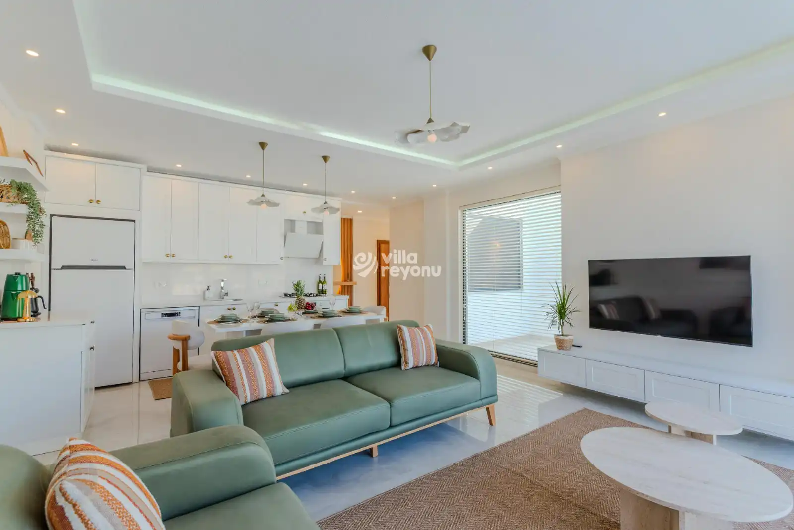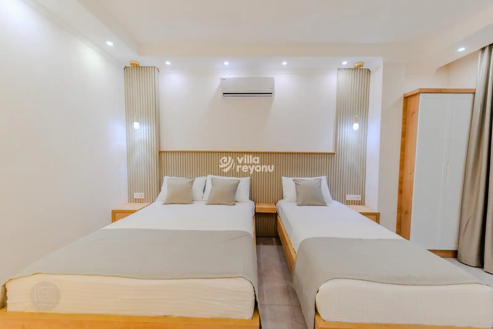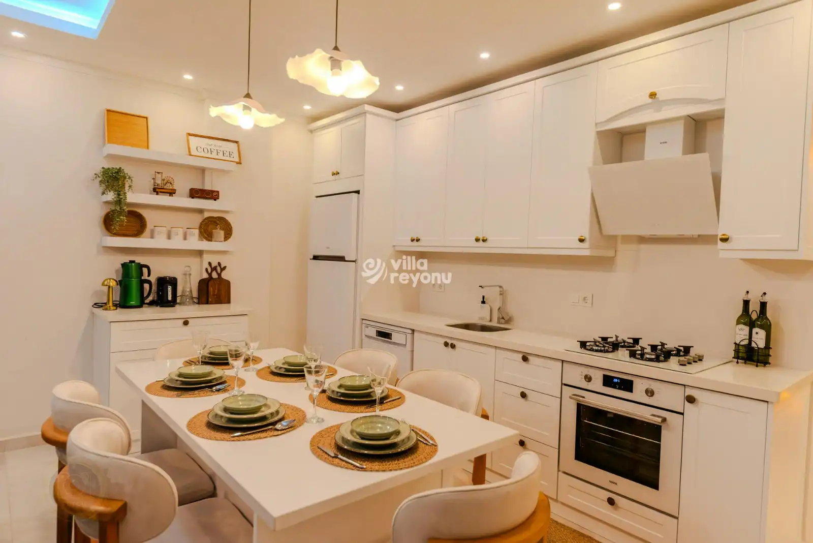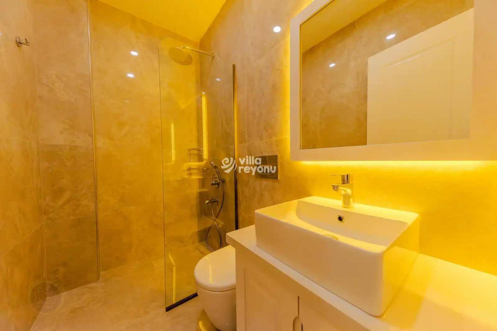 Modern ve zarif iç tasarımıyla dikkat çeken villada, iki adet çift kişilik yatak bulunan yatak odası ve üç banyo mevcuttur. Jakuzi ve yüksek kaliteli donanımlar, konaklamanızı daha da özel ve rahat hale getirir.