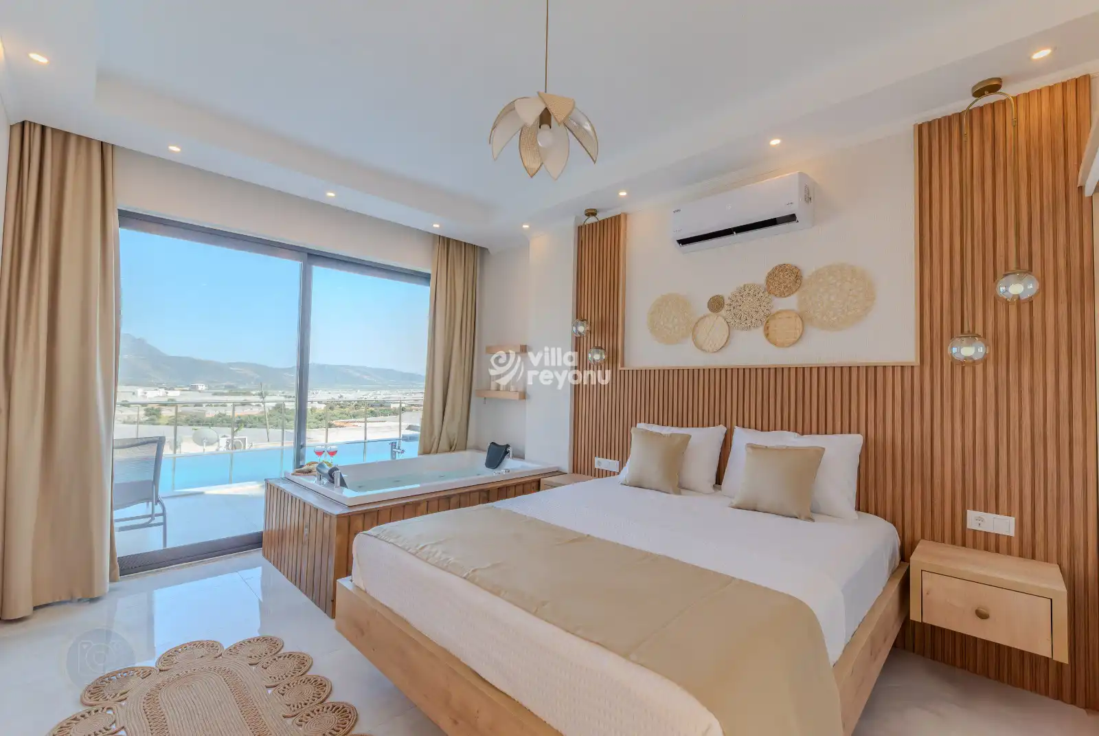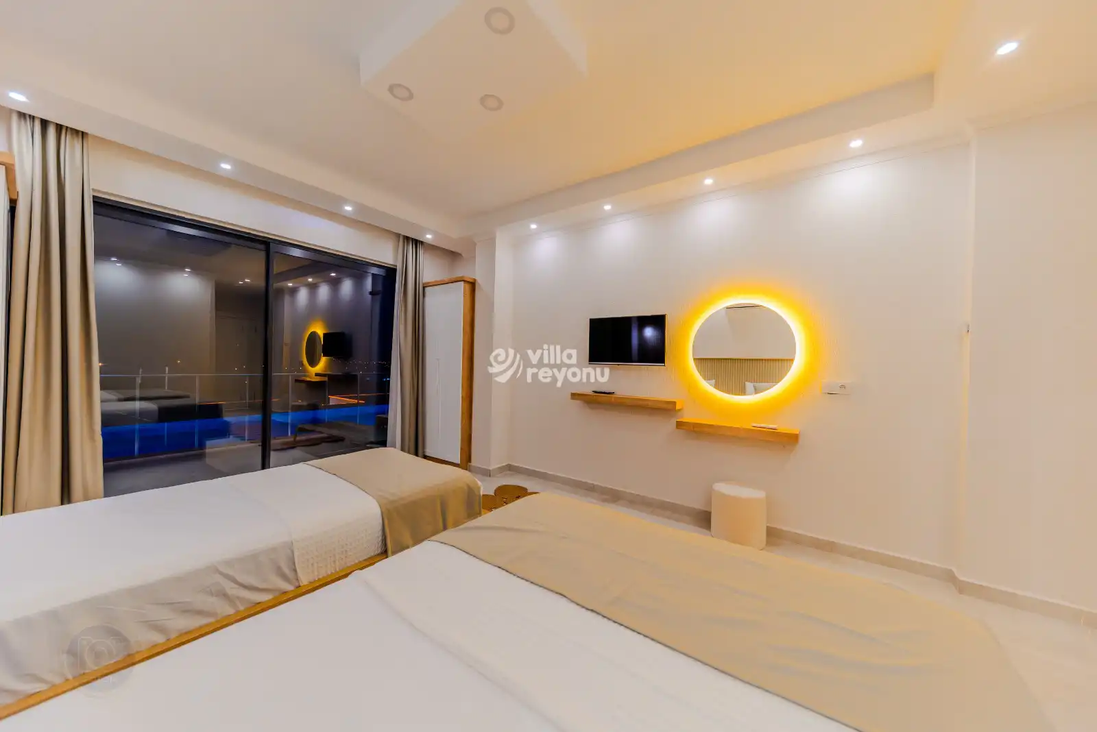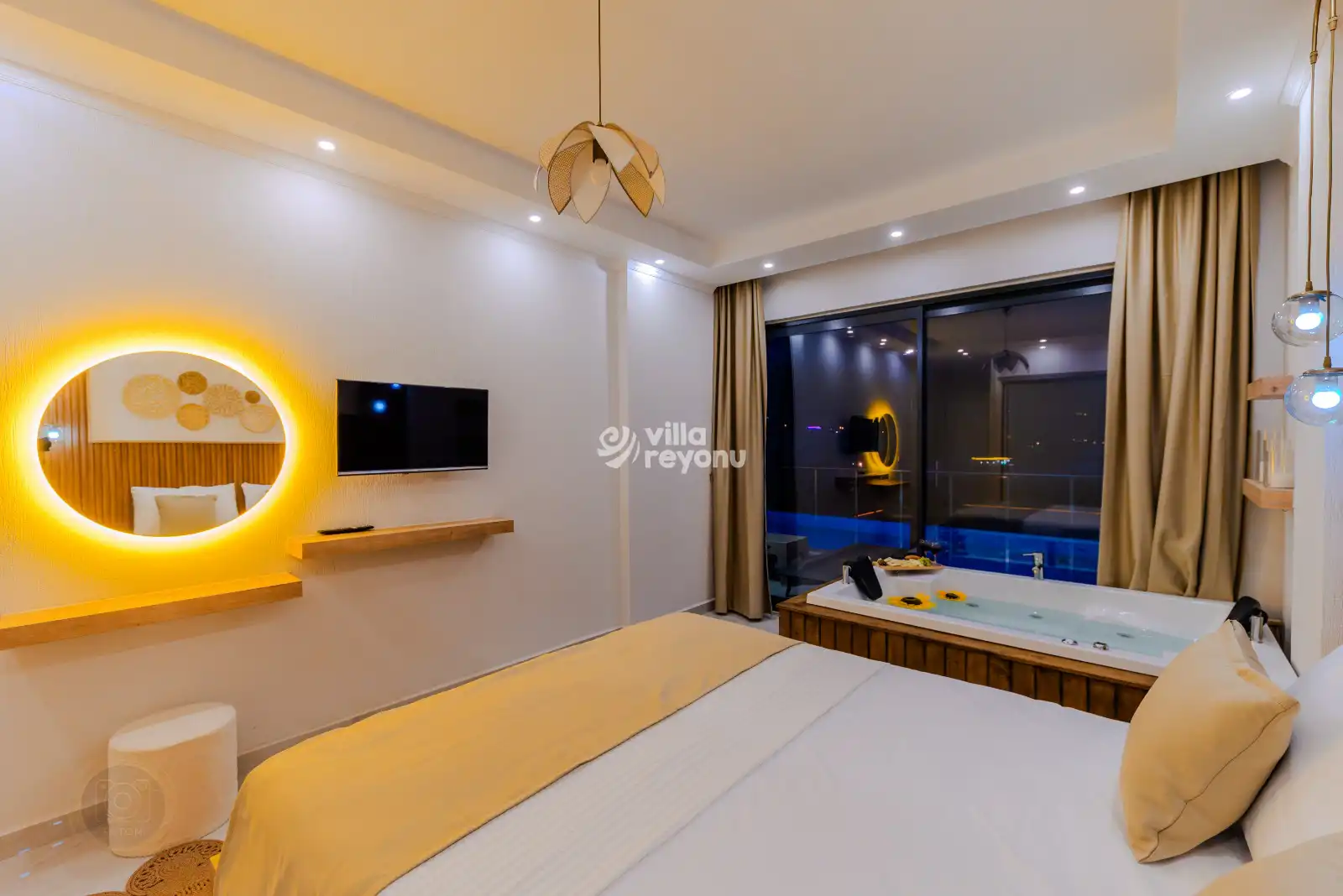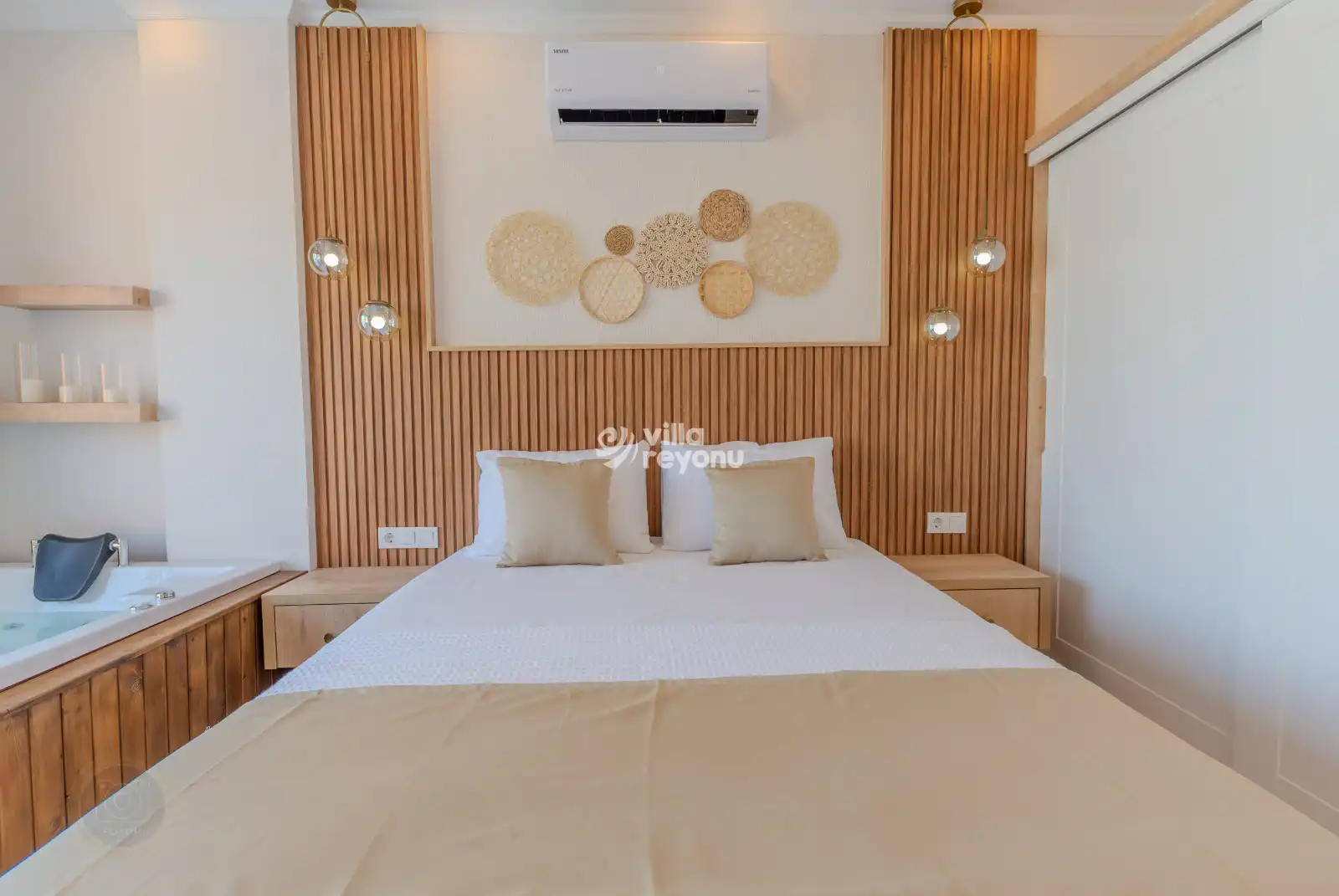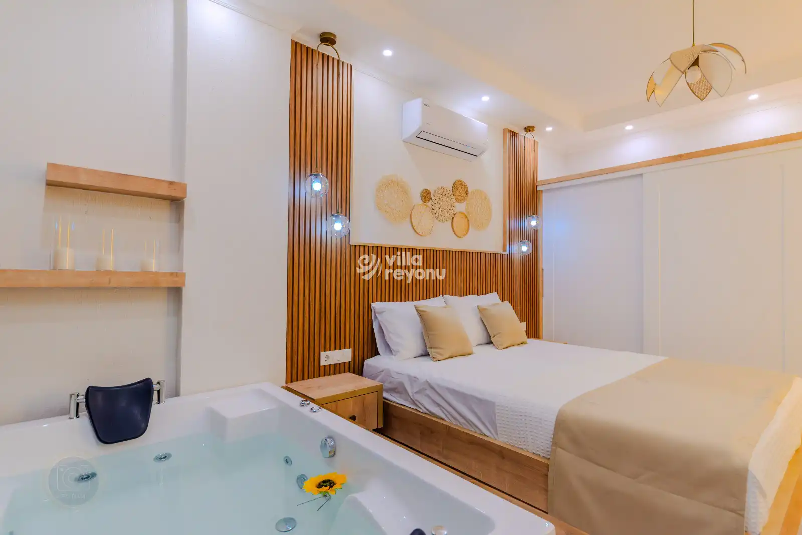 Modern ve zarif iç tasarımıyla dikkat çeken villada, iki adet çift kişilik yatak bulunan yatak odası ve üç banyo mevcuttur. Jakuzi ve yüksek kaliteli donanımlar, konaklamanızı daha da özel ve rahat hale getirir.