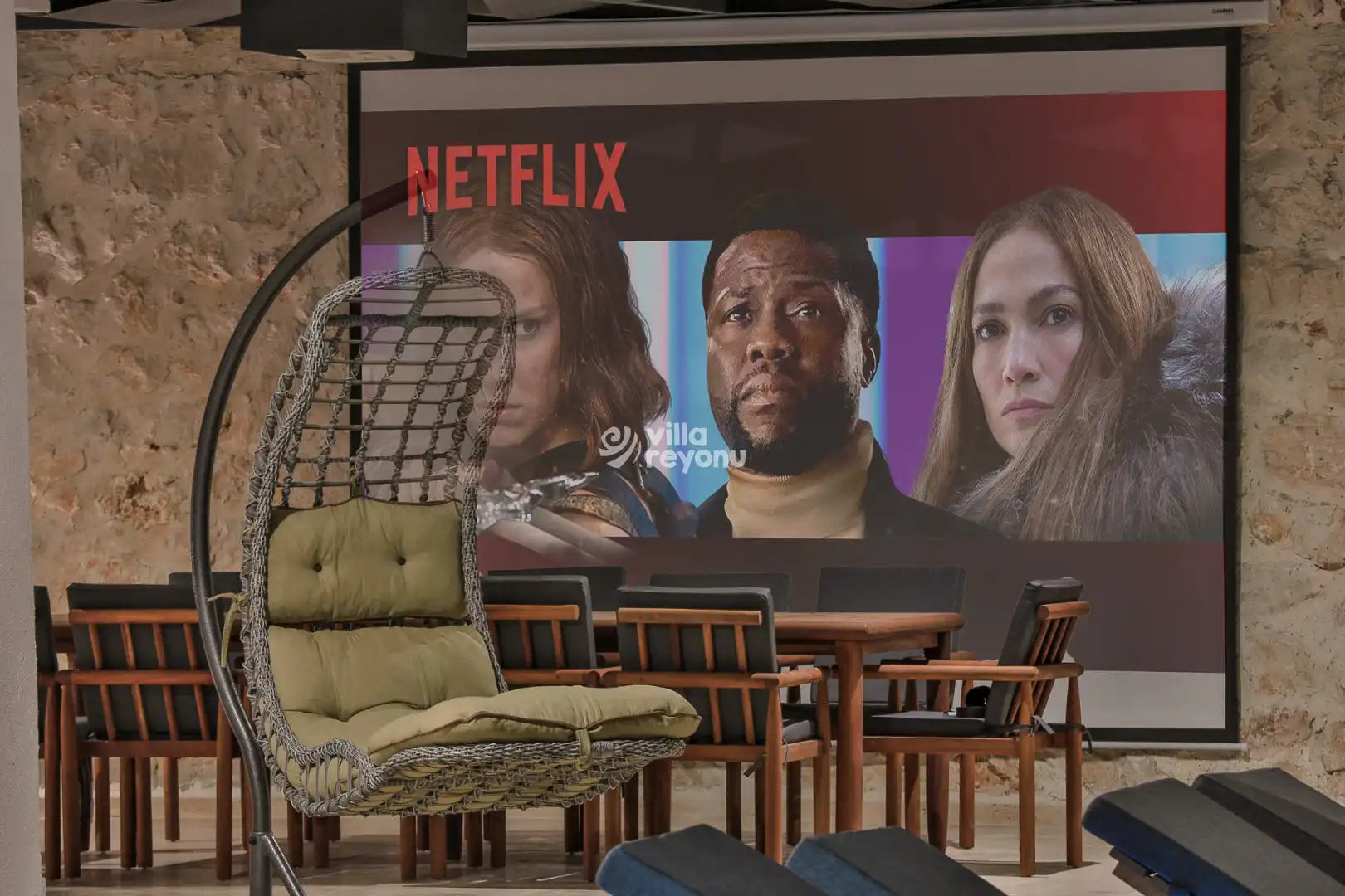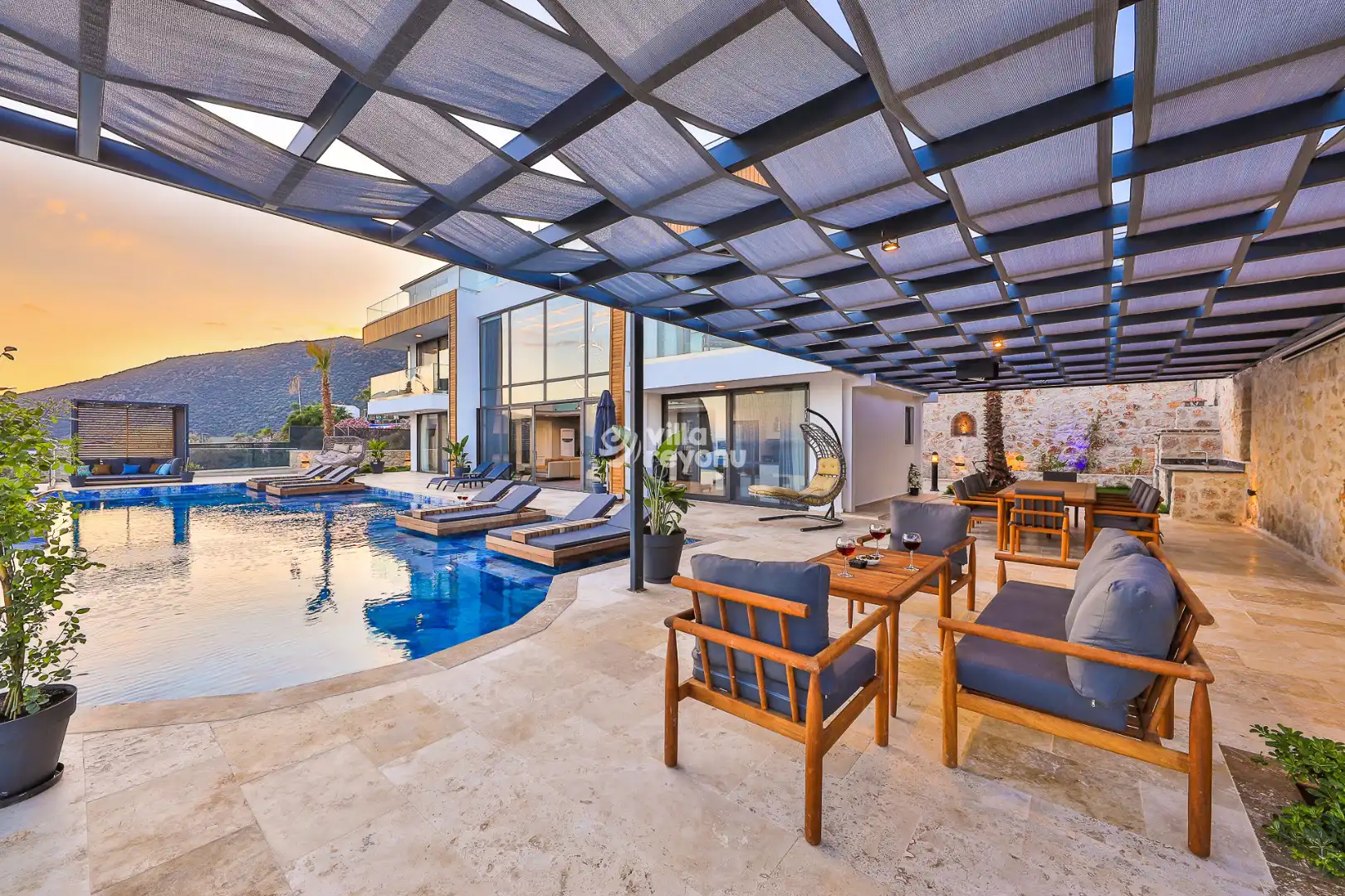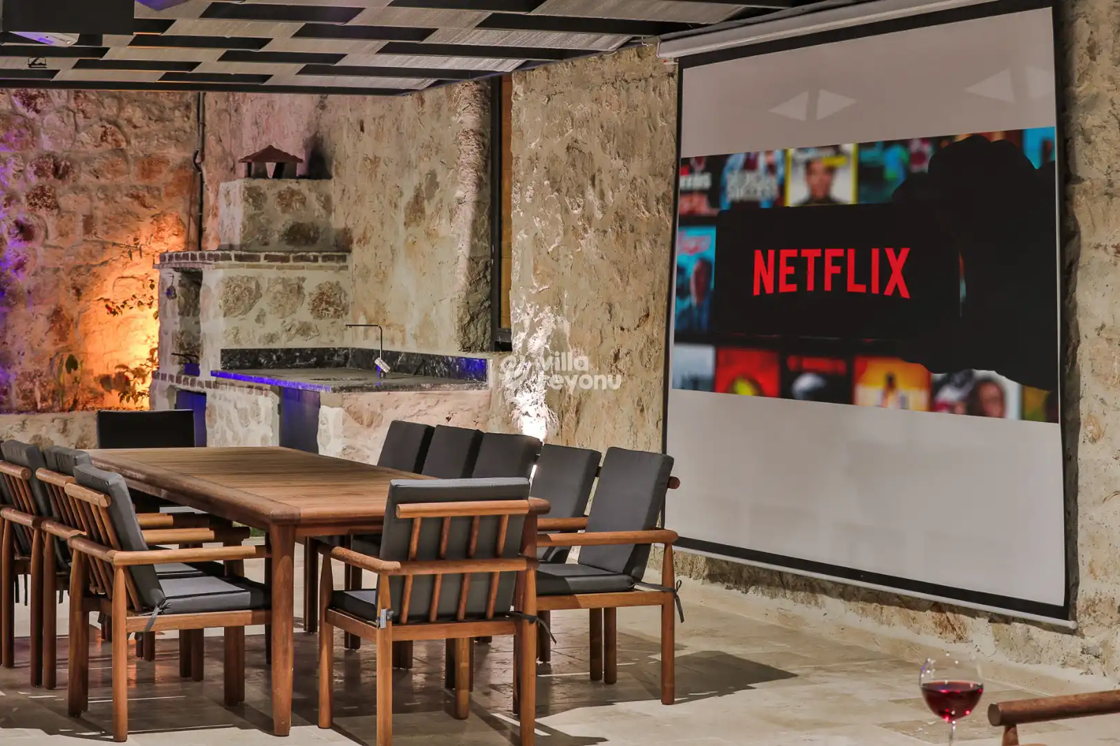 Havuz başında şezlonglar, oturma grubu, yemek masası ve barbekü alanı bulunuyor. Gün batımını izlerken akşam yemeğinizi yiyebilir, gece projeksiyon cihazı ile açık havada sinema keyfi yaşayabilirsiniz. Netflix erişimi sayesinde villada dijital eğlenceye de yer ayrılmış durumda.