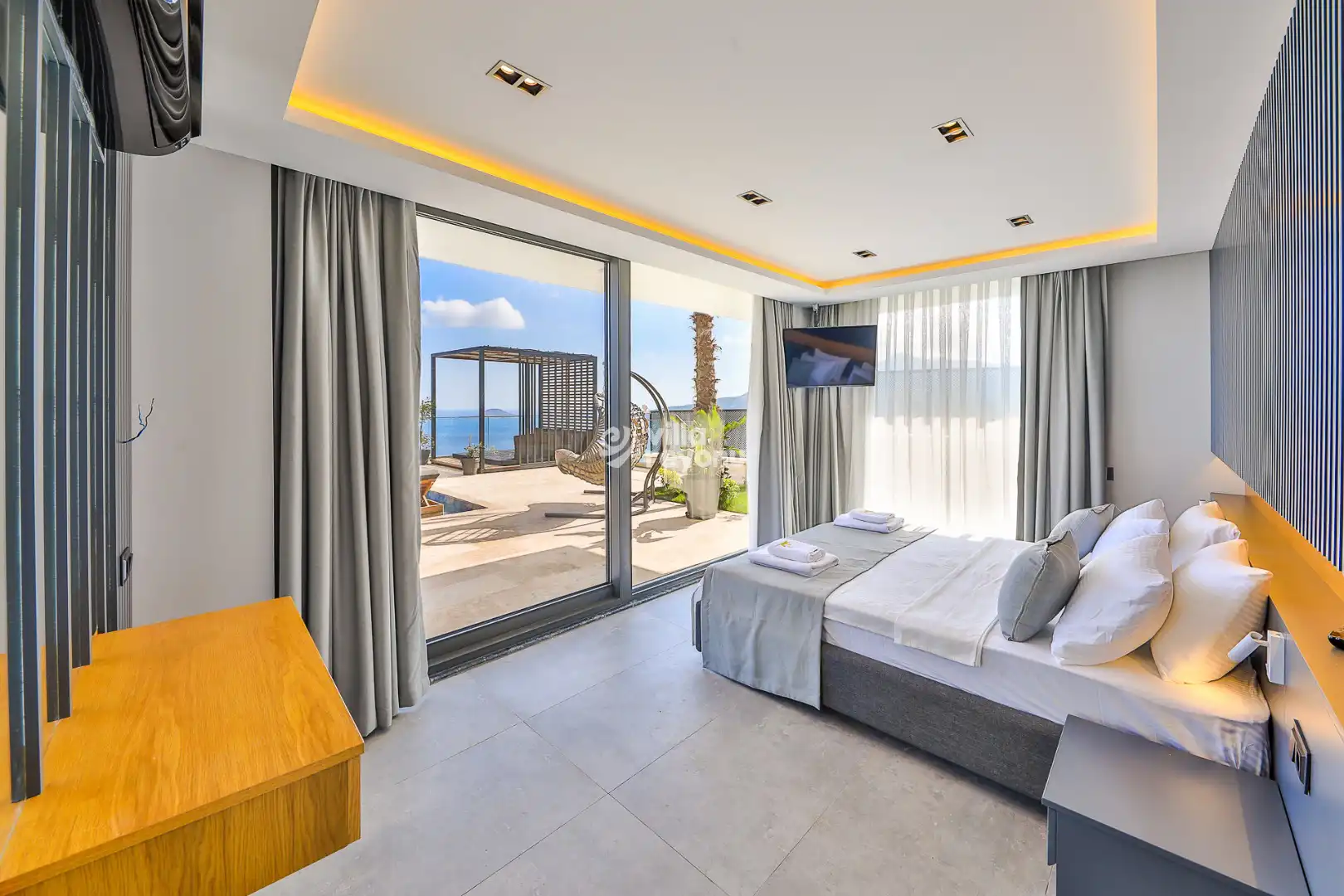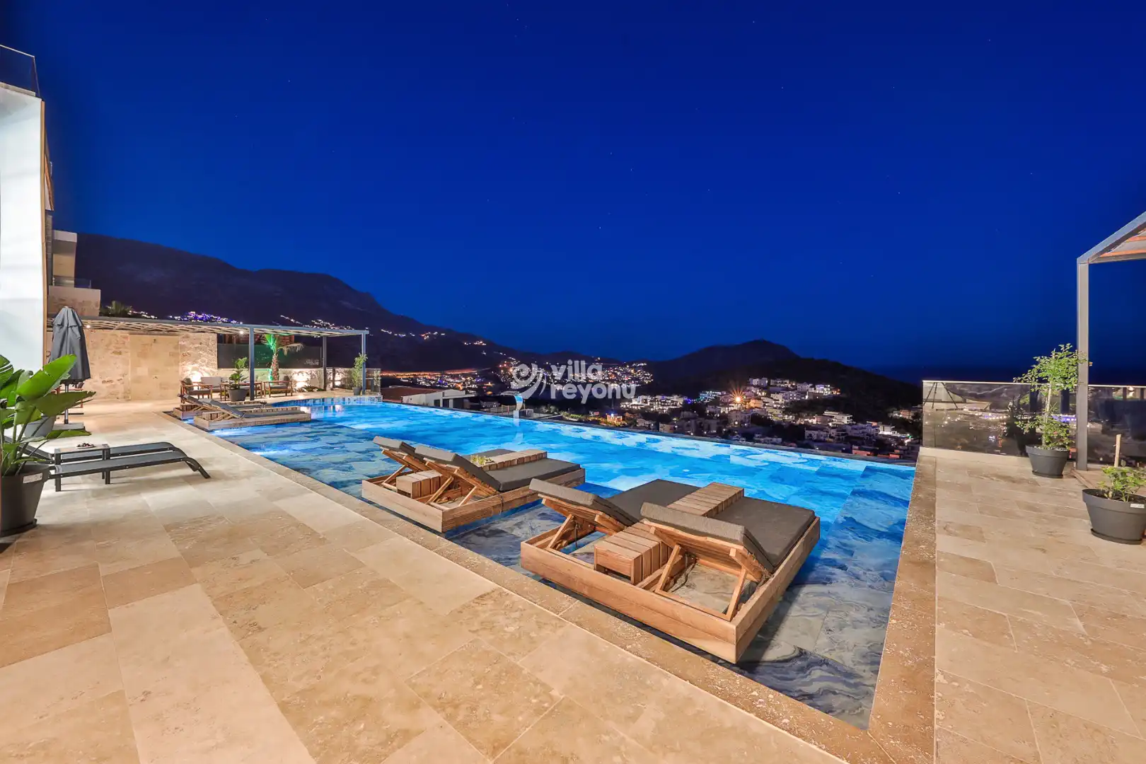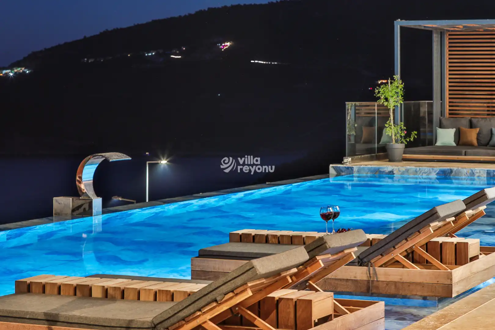 Havuz başında şezlonglar, oturma grubu, yemek masası ve barbekü alanı bulunuyor. Gün batımını izlerken akşam yemeğinizi yiyebilir, gece projeksiyon cihazı ile açık havada sinema keyfi yaşayabilirsiniz. Netflix erişimi sayesinde villada dijital eğlenceye de yer ayrılmış durumda.