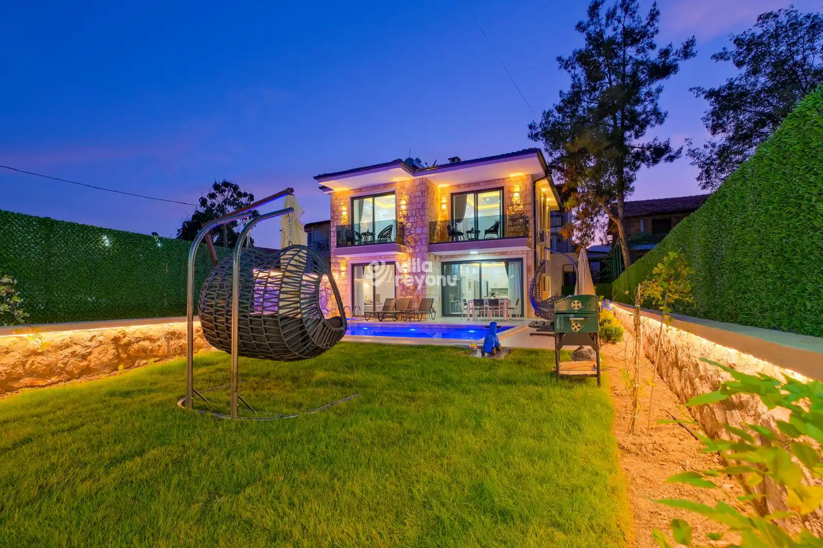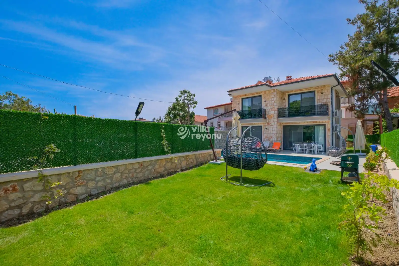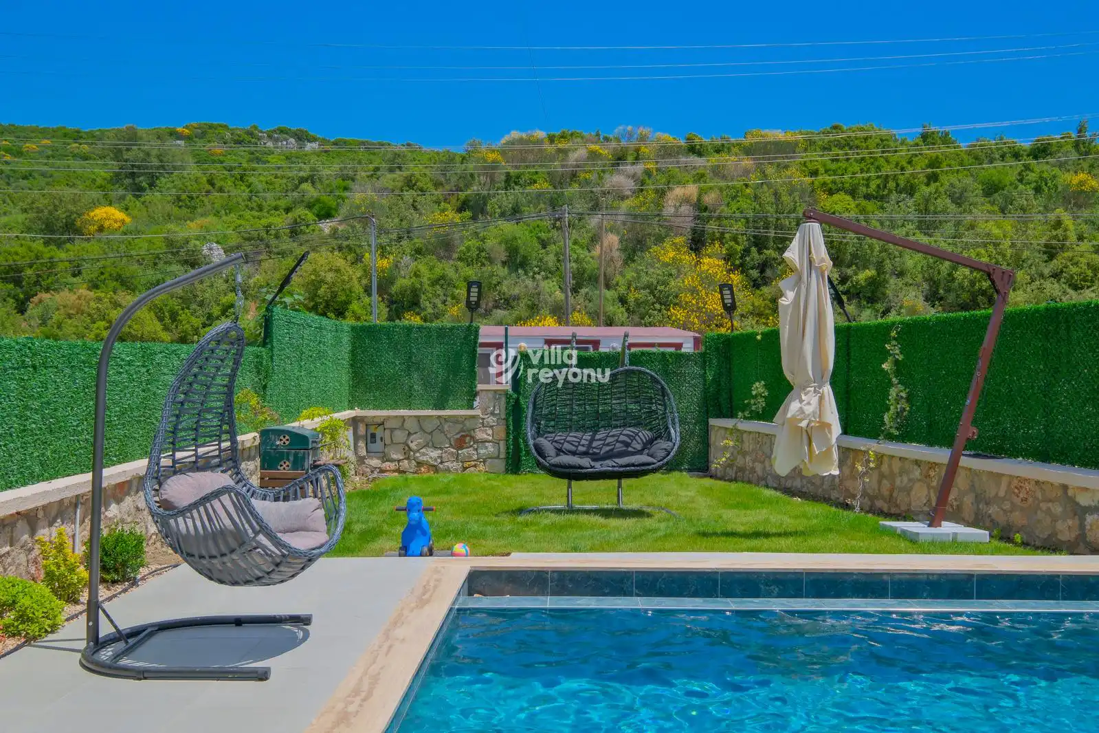 Dış alanda yer alan 9x4 metre büyüklüğündeki özel yüzme havuzu ve çocuk havuzu, yaz aylarında serinlemenin keyfini çıkarabileceğiniz alanlar sunar. Havuz alanı tamamen korunaklı olup dışarıdan görünmemektedir. Taş duvarlarla çevrili geniş bahçesi, oturma alanları ve barbekü köşesiyle doğanın içinde keyifli vakitler geçirmeniz için idealdir.Villa Ormeya, mahremiyet ve huzur arayan misafirler için sessiz bir bölgede konumlanmıştır. Özel otopark alanı sayesinde aracınızı güvenle park edebilirsiniz. Villaya girişte 15 basamak bulunduğunu da bilgi amaçlı olarak belirtmek isteriz.