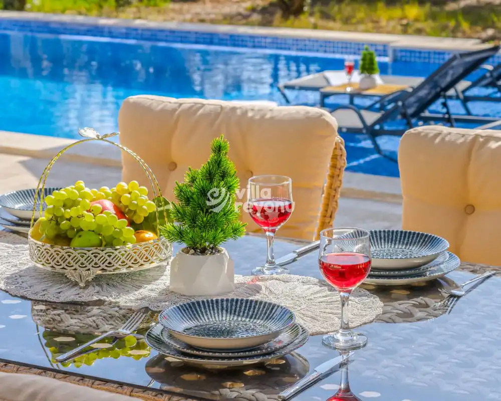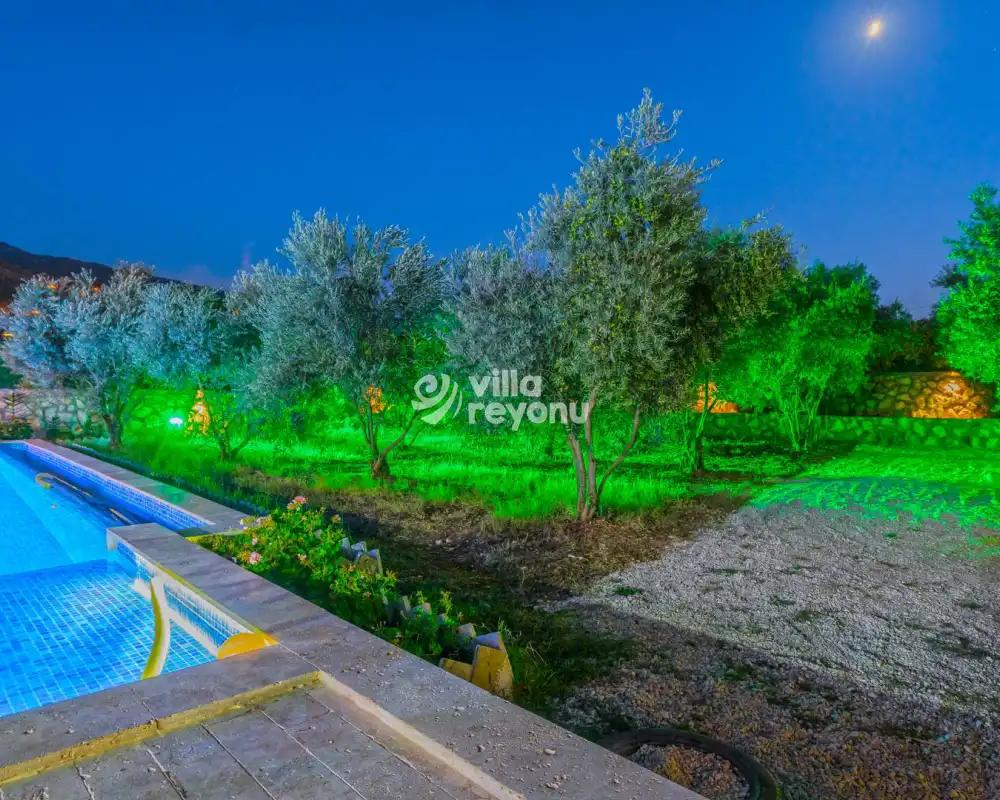 2 yatak odası, 2 banyo-tuvalet bulunan villamız 4 kişilik konaklama kapasitesine sahiptir. 40 m2 büyüklüğünde özel havuzu, geniş bahçesi, bahçe mobilyaları, salıncak, konforlu şezlongları ve barbeküsü bulunmaktadır. Tüm gün bahçenizde doğanın huzur verici dinlendiriciliğinin keyfini çıkarabilir, kuş sesleri ile kahvaltınızı, binlerce yıldız altında akşam yemeğinizi yerken izole bir tatilin keyfini çıkarabilirsiniz. Ebeveyn odasında çift kişilik jakuzisi bulunan villamız şık ve zevkle döşenmiş mobilyaları, kullanışlı alanları ile lüks bir tatil için tasarlandı.