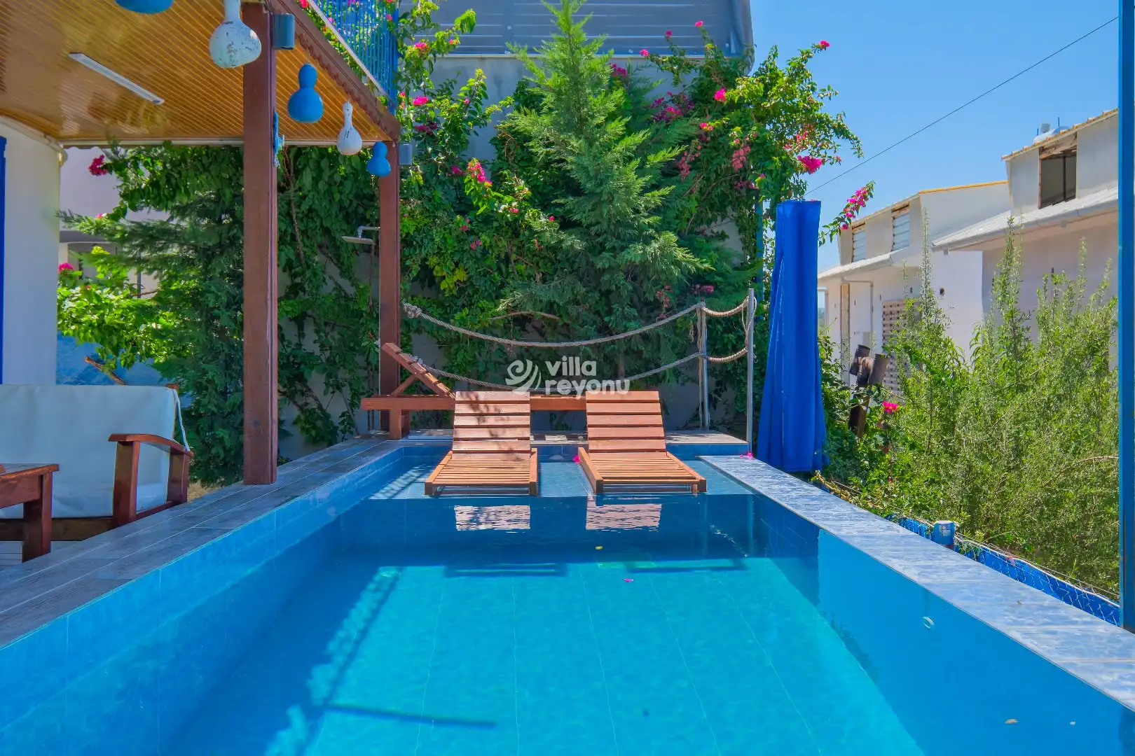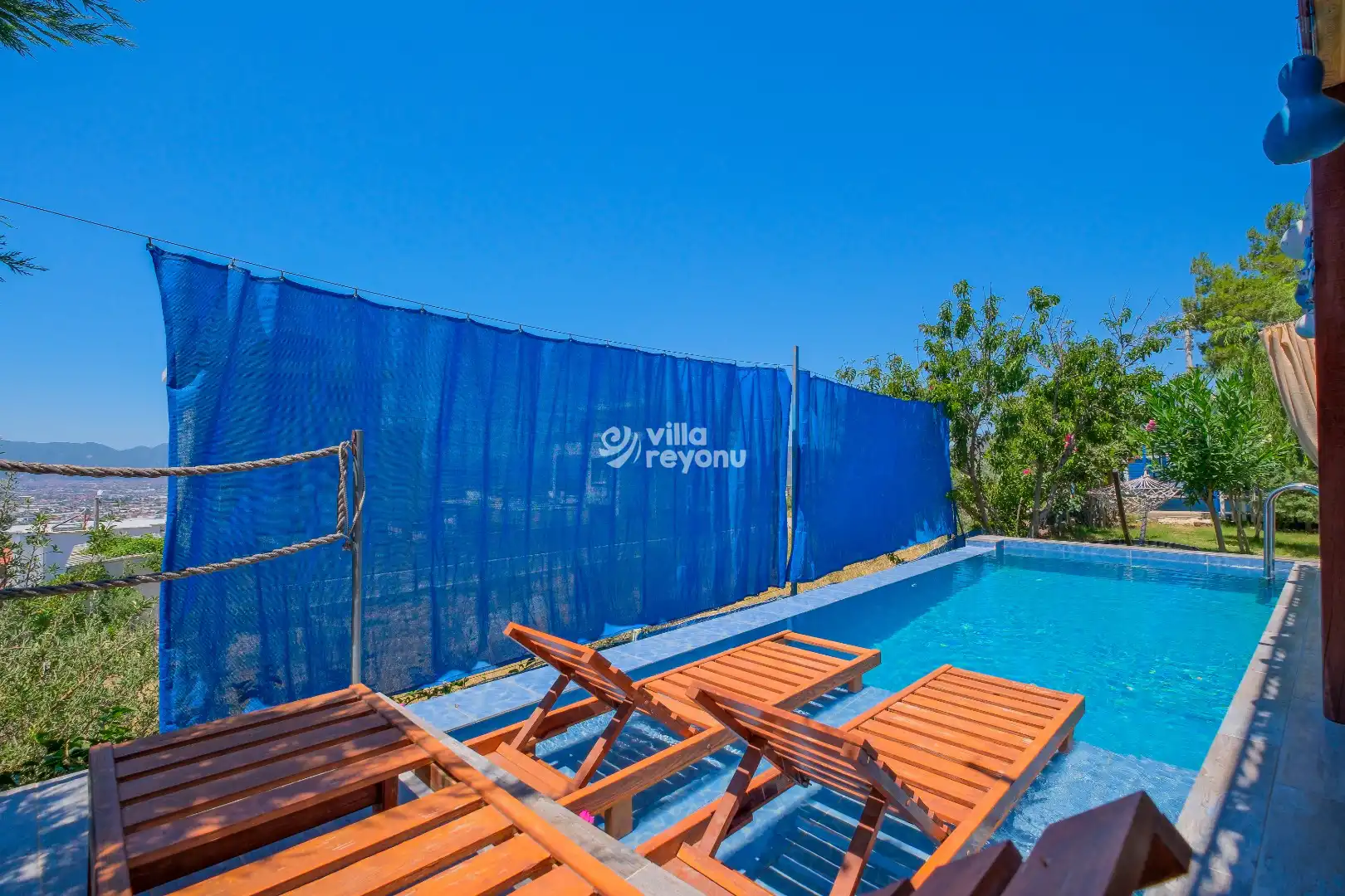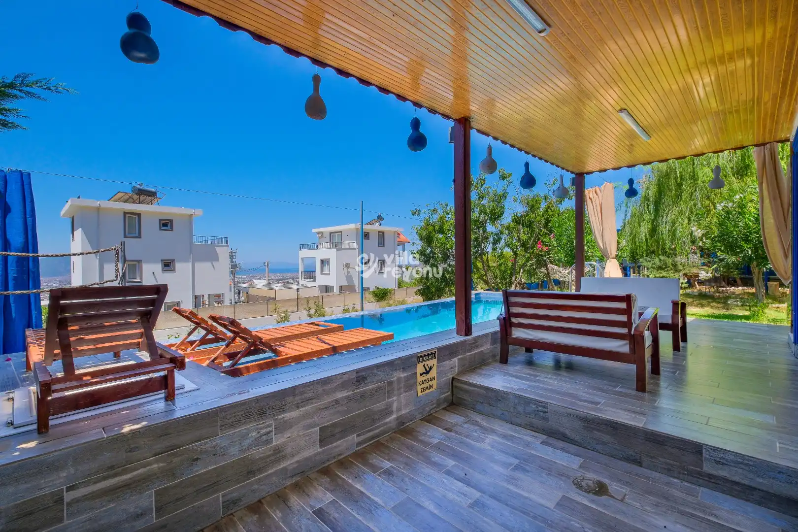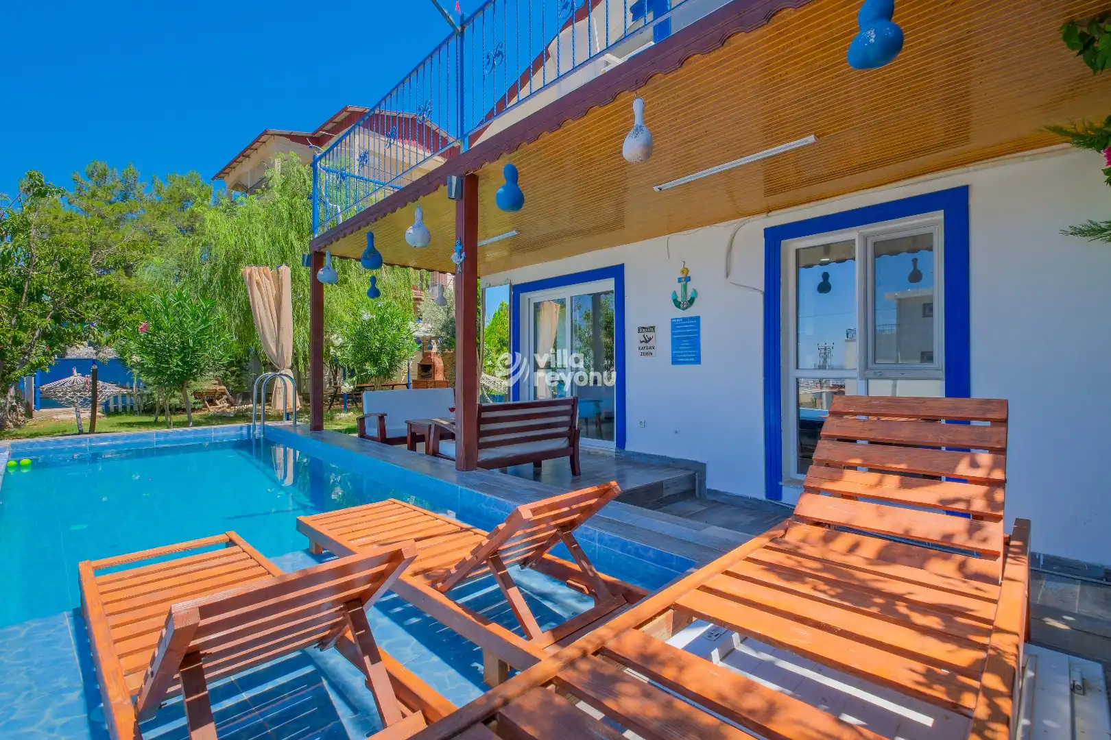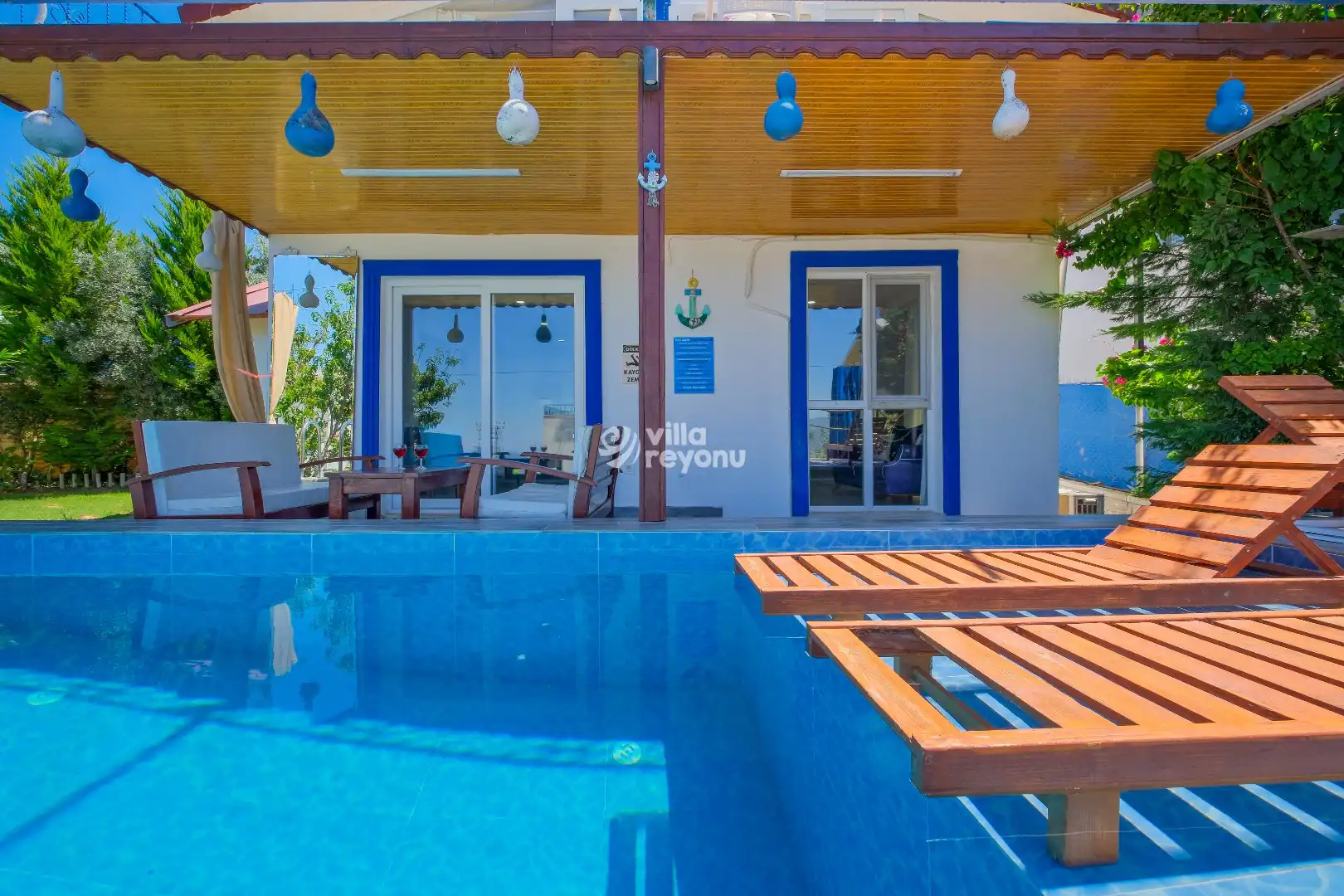 Villanın en dikkat çeken özelliklerinden biri, korunaklı özel havuzudur. Bu sayede hem mahremiyetiniz korunur hem de sevdiklerinizle gönül rahatlığıyla keyifli anlar yaşayabilirsiniz. Geniş ve ferah verandası ise, açık havada dinlenmek, gün batımını izlemek ya da lezzetli bir akşam yemeği eşliğinde sevdiklerinizle vakit geçirmek için mükemmel bir alan sunar.