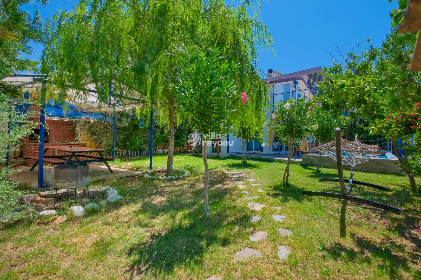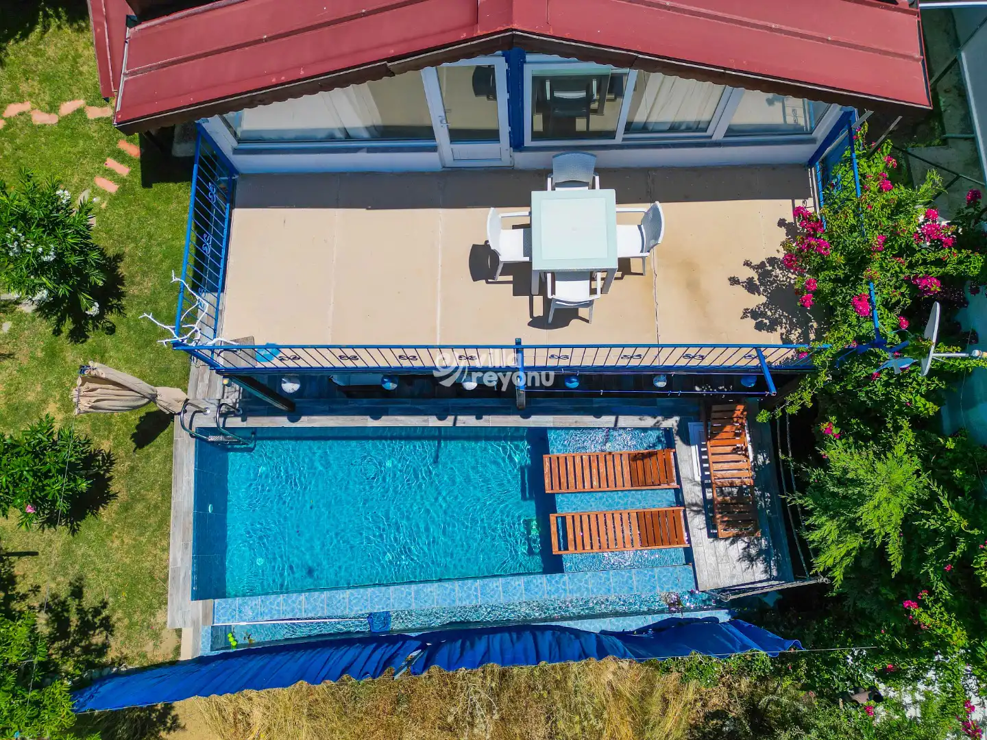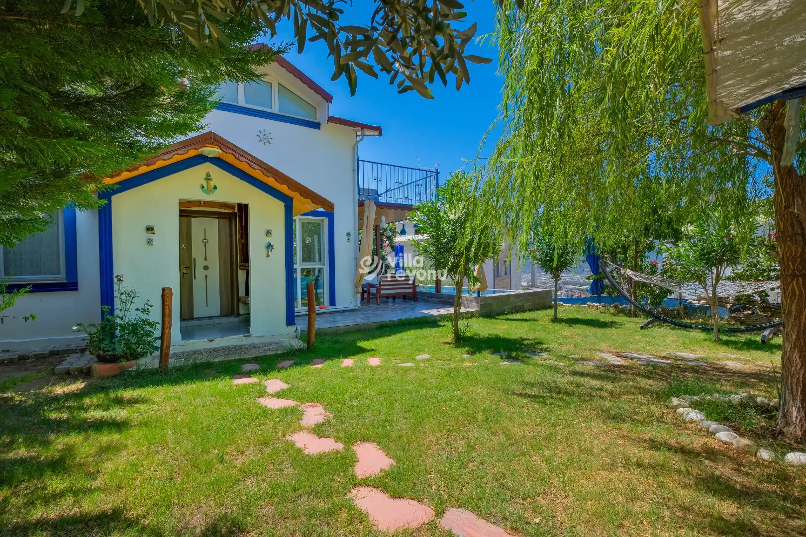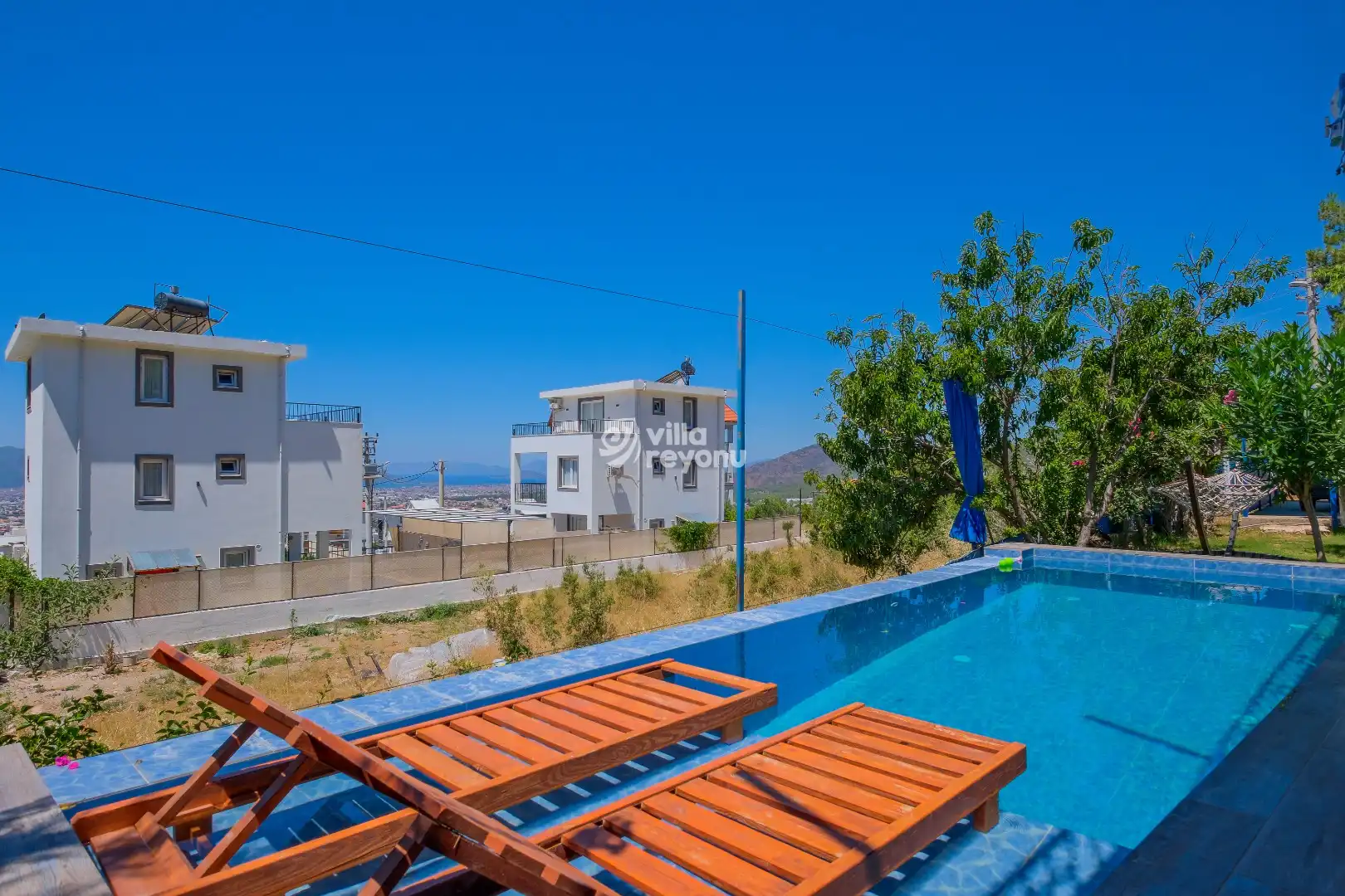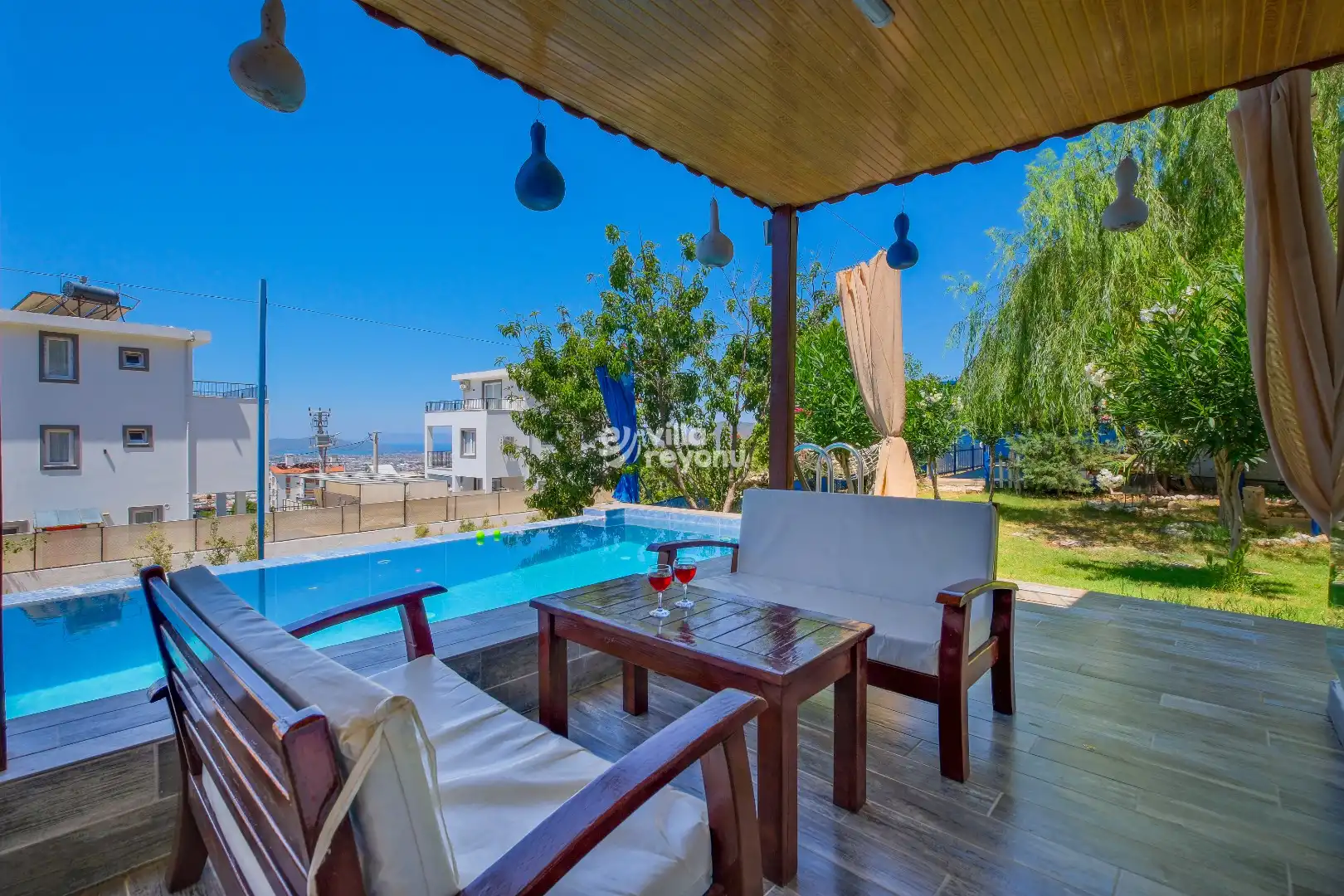 Villanın en dikkat çeken özelliklerinden biri, korunaklı özel havuzudur. Bu sayede hem mahremiyetiniz korunur hem de sevdiklerinizle gönül rahatlığıyla keyifli anlar yaşayabilirsiniz. Geniş ve ferah verandası ise, açık havada dinlenmek, gün batımını izlemek ya da lezzetli bir akşam yemeği eşliğinde sevdiklerinizle vakit geçirmek için mükemmel bir alan sunar.