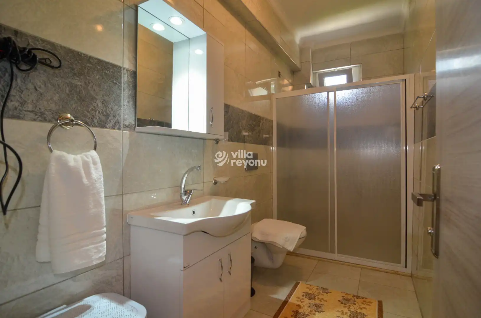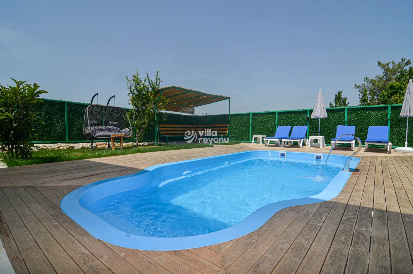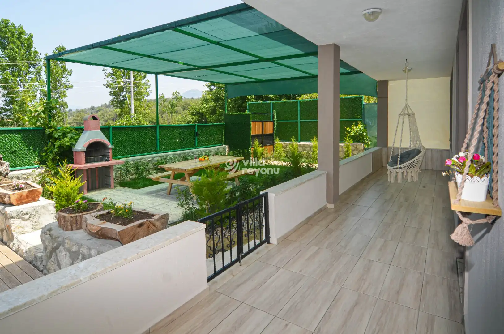 Villanın en dikkat çekici alanlarından biri geniş verandasıdır. Burada sabah kahvaltınızı yapabilir, günün yorgunluğunu atabilir veya sevdiklerinizle hoş sohbetler eşliğinde akşam saatlerini değerlendirebilirsiniz. Doğayla iç içe, özgürce vakit geçirebileceğiniz bu özel alan, tatilinize ayrı bir keyif katacaktır.