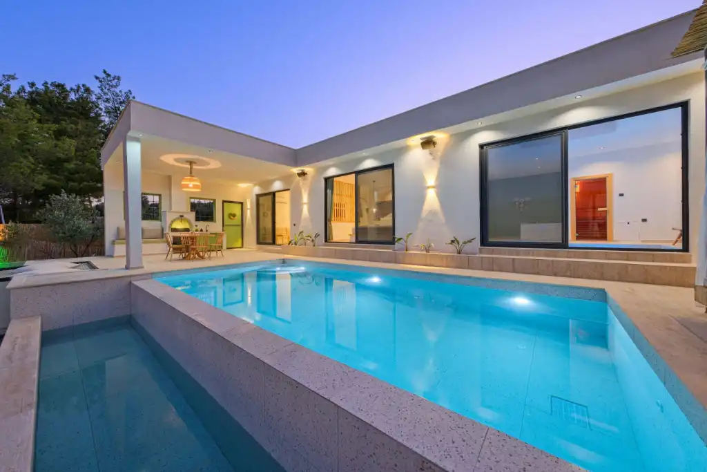 Villanın en dikkat çekici özelliklerinden biri korunaklı kapalı havuz alanıdır. Özel kapalı havuz, sauna ve jakuzi ile spa keyfini villa konforunuzda yaşayabilirsiniz. Doğanın içindeki konumu sayesinde şehrin stresinden uzak, huzurlu bir tatil geçirebilirsiniz.